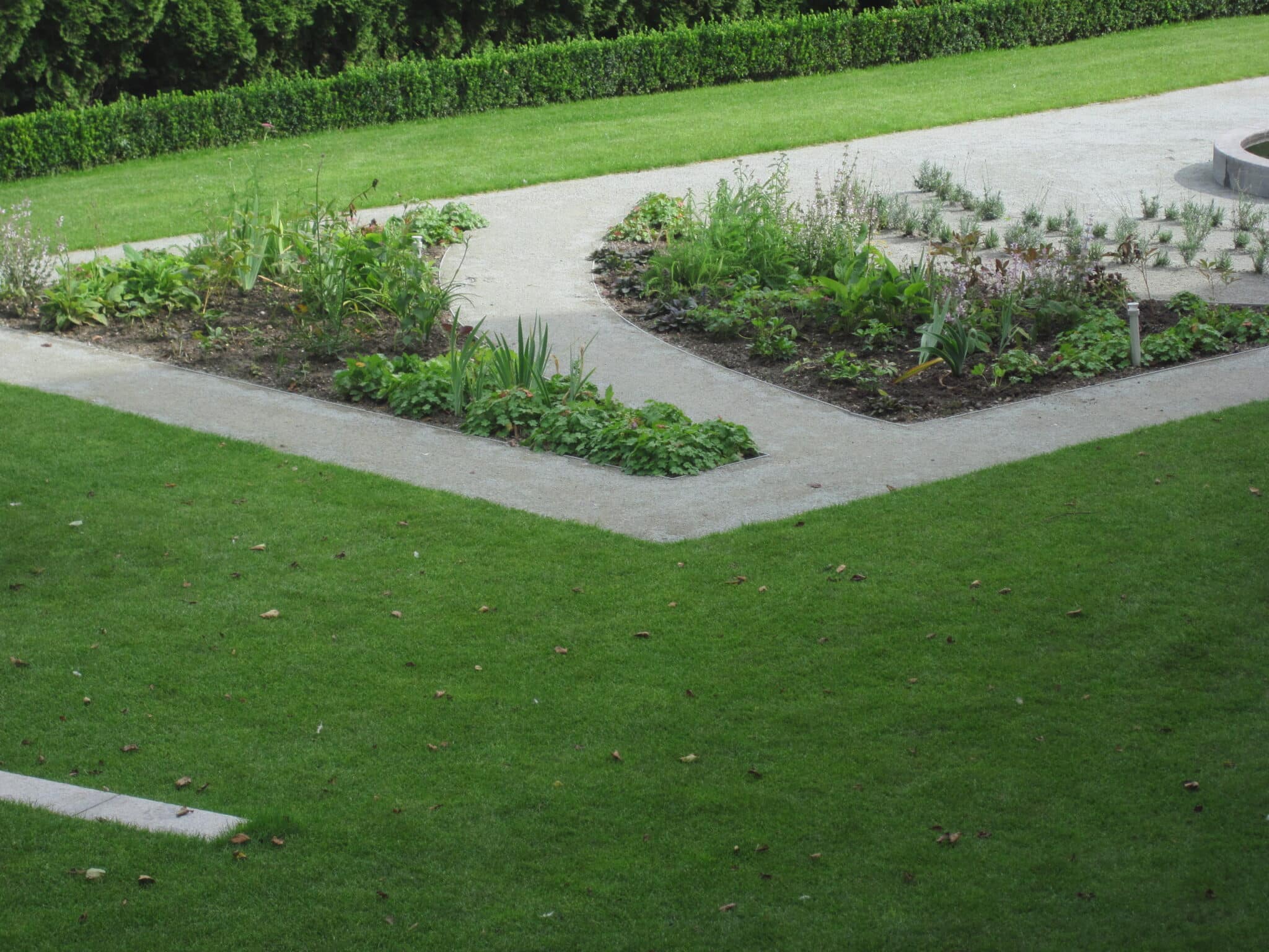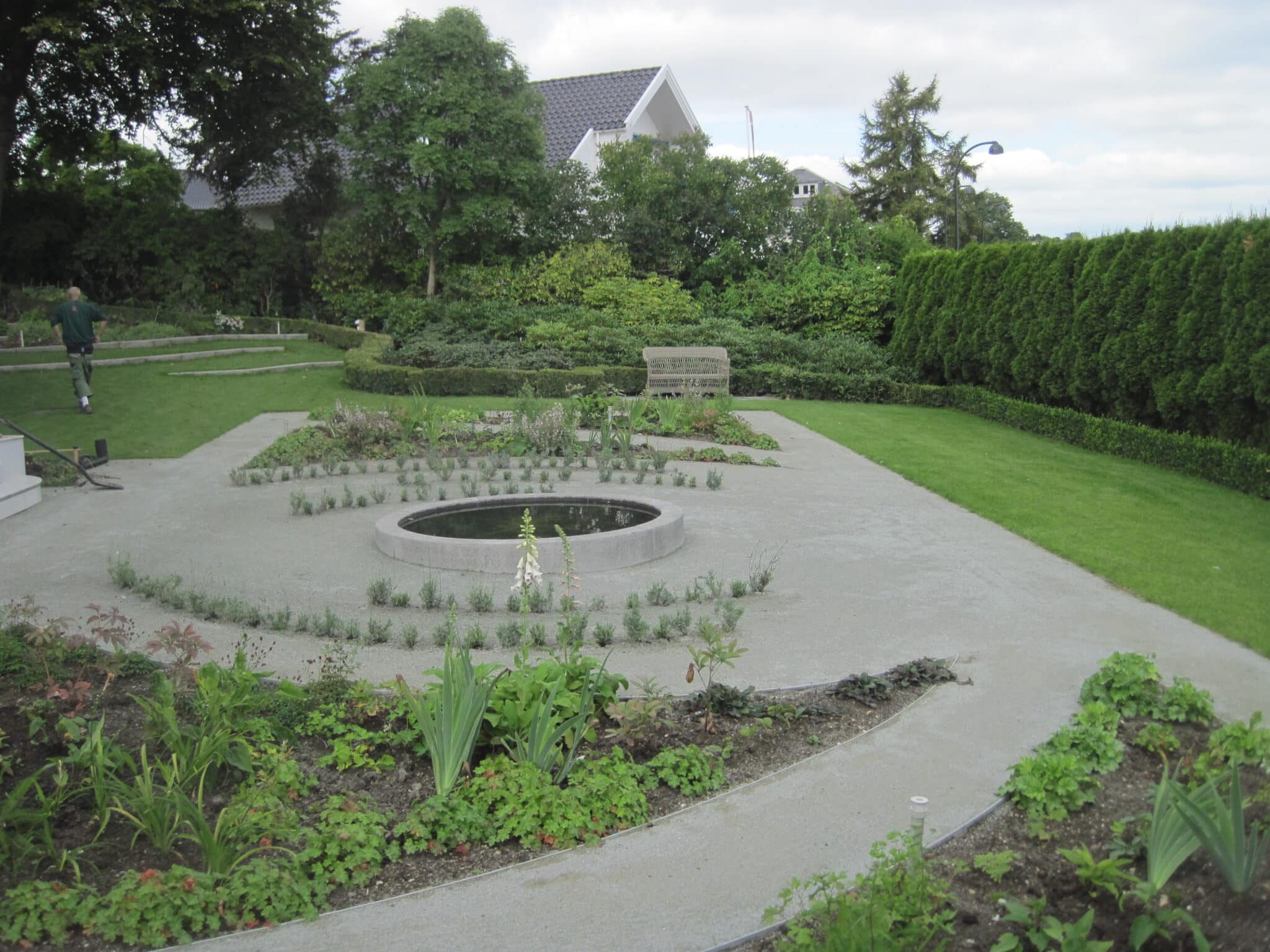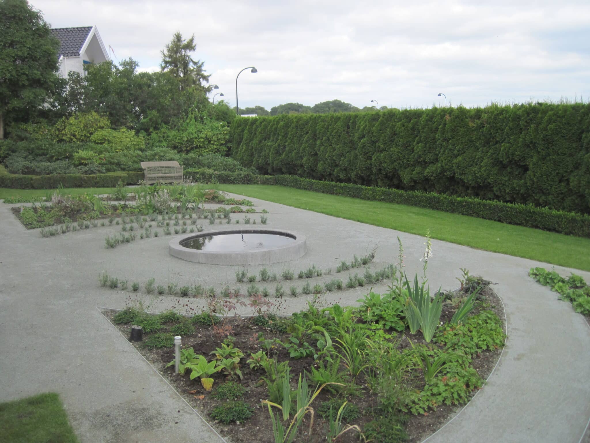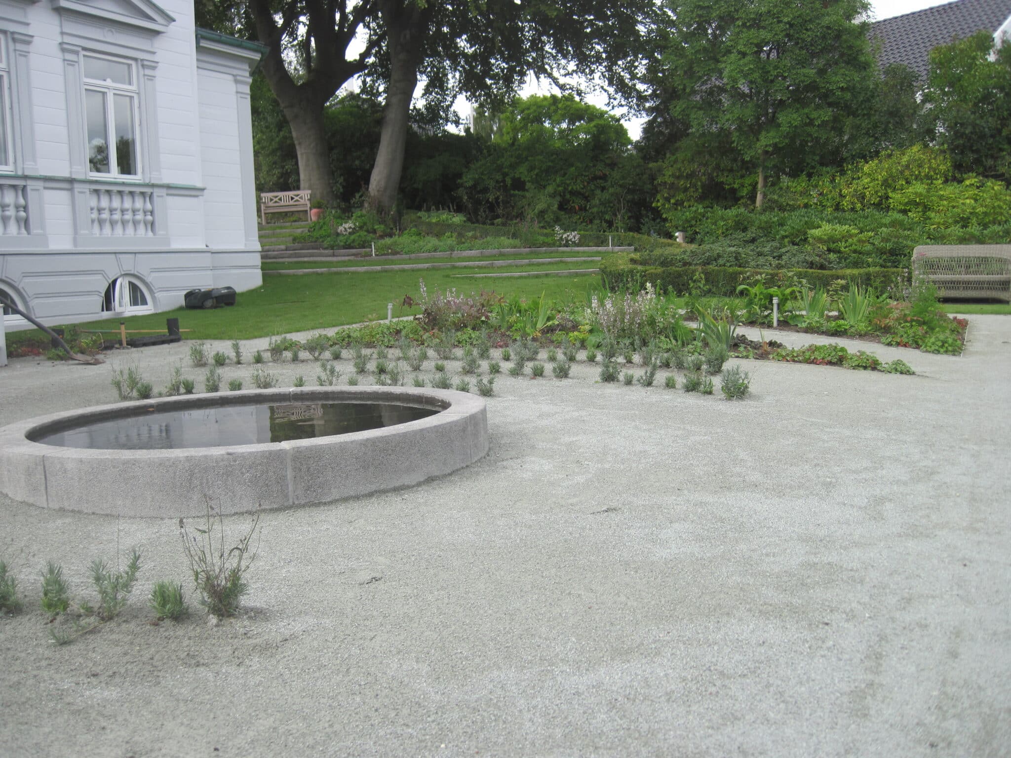 Haven er disponeret omkring en klassisk parterre, hvor et cirkulært bassin med springvand er centrum. Bassinet er omgivet af lavendler, mens bedene er indrammet af cortenstål, så de buede linjer står skarpt. Beplantningen er sammensat af roser, prydløg, akeleje, digitalis, martagonliljer og iris, suppleret af bunddækkende stauder, prydgræsser og stedsegrønne planter, der giver helårsstruktur og et smukt vinterbillede.