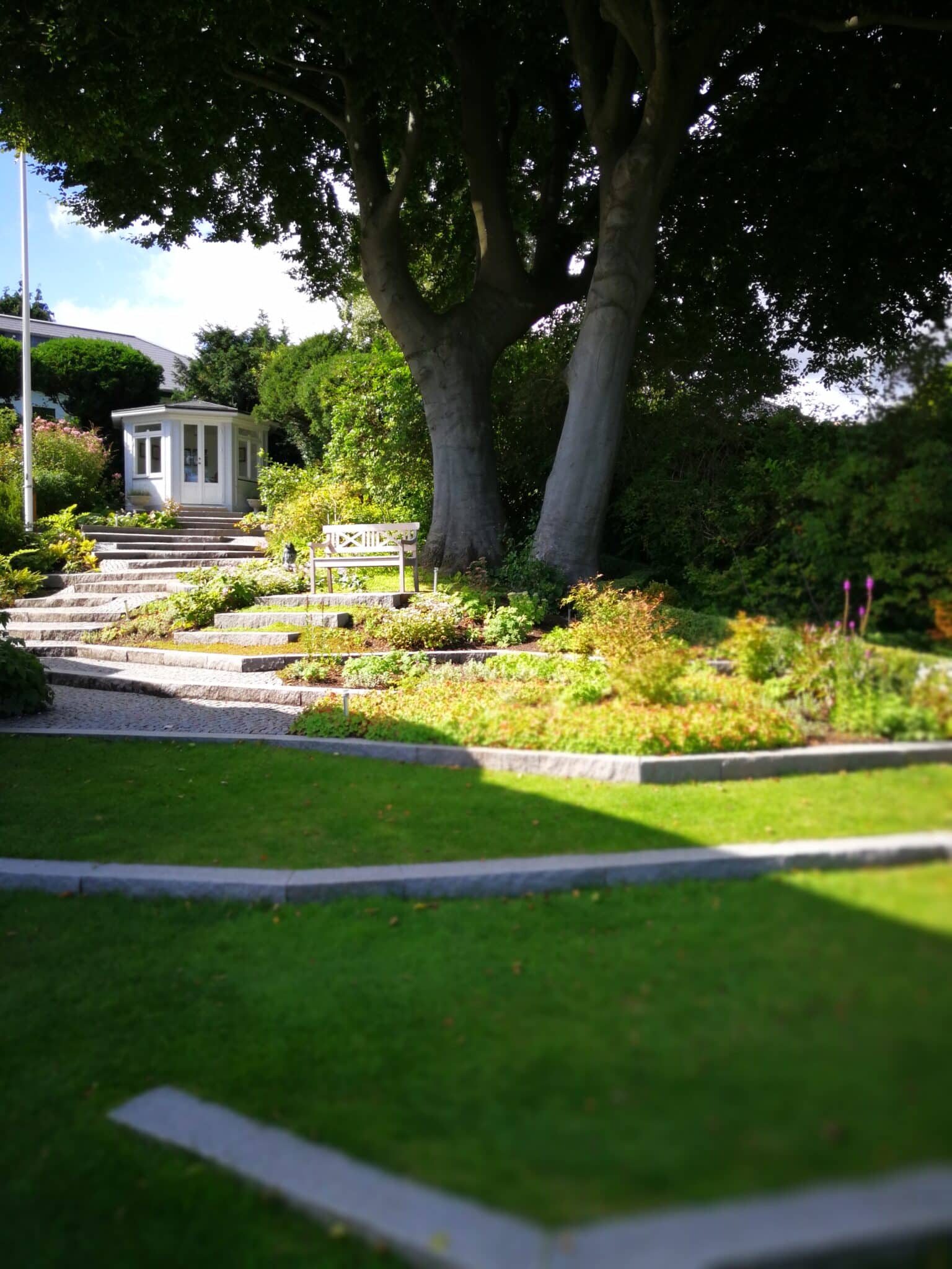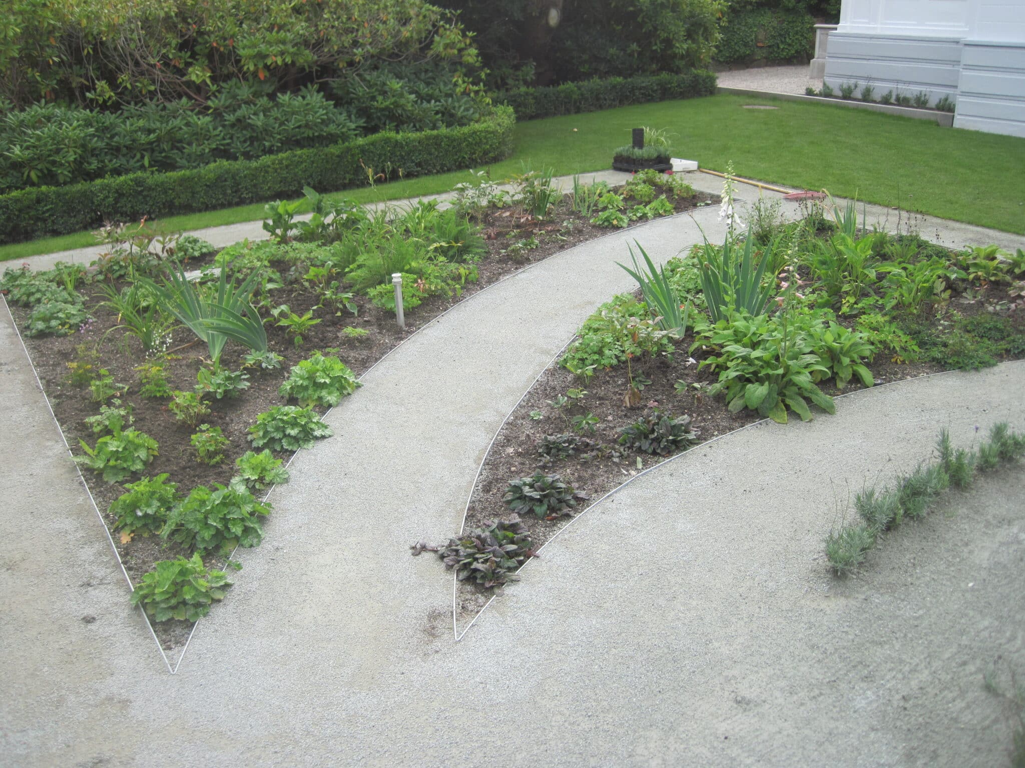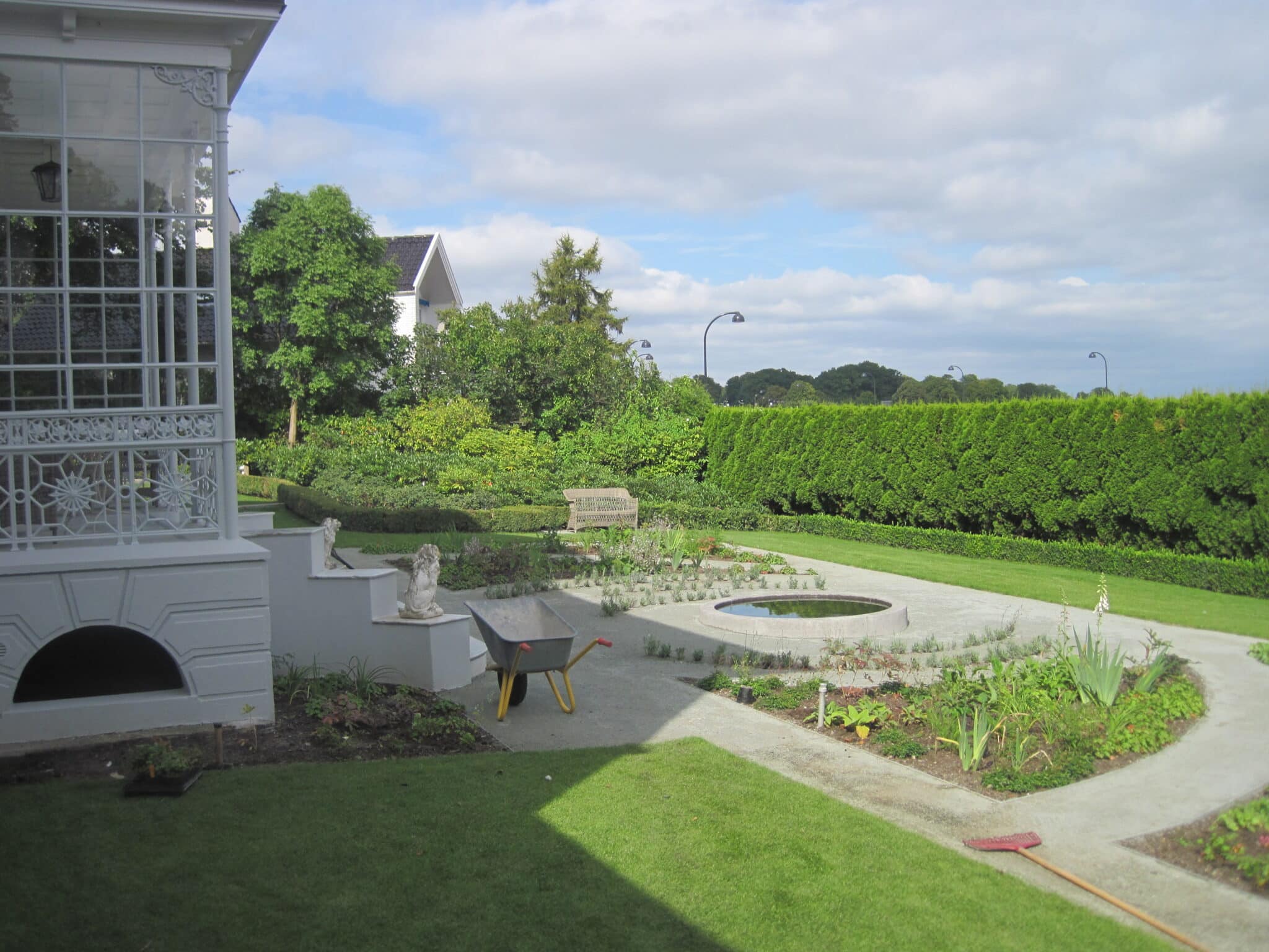 Haven er disponeret omkring en klassisk parterre, hvor et cirkulært bassin med springvand er centrum. Bassinet er omgivet af lavendler, mens bedene er indrammet af cortenstål, så de buede linjer står skarpt. Beplantningen er sammensat af roser, prydløg, akeleje, digitalis, martagonliljer og iris, suppleret af bunddækkende stauder, prydgræsser og stedsegrønne planter, der giver helårsstruktur og et smukt vinterbillede.