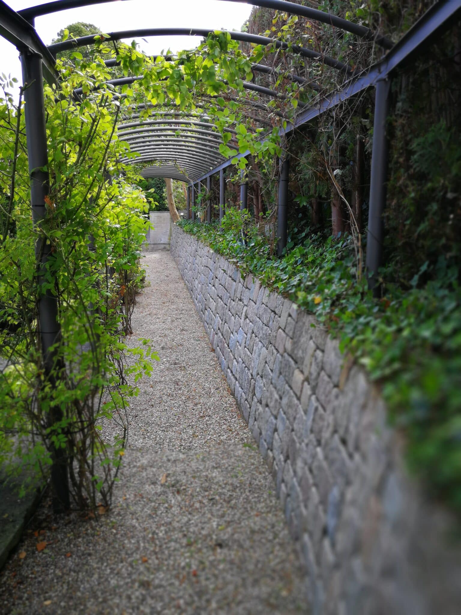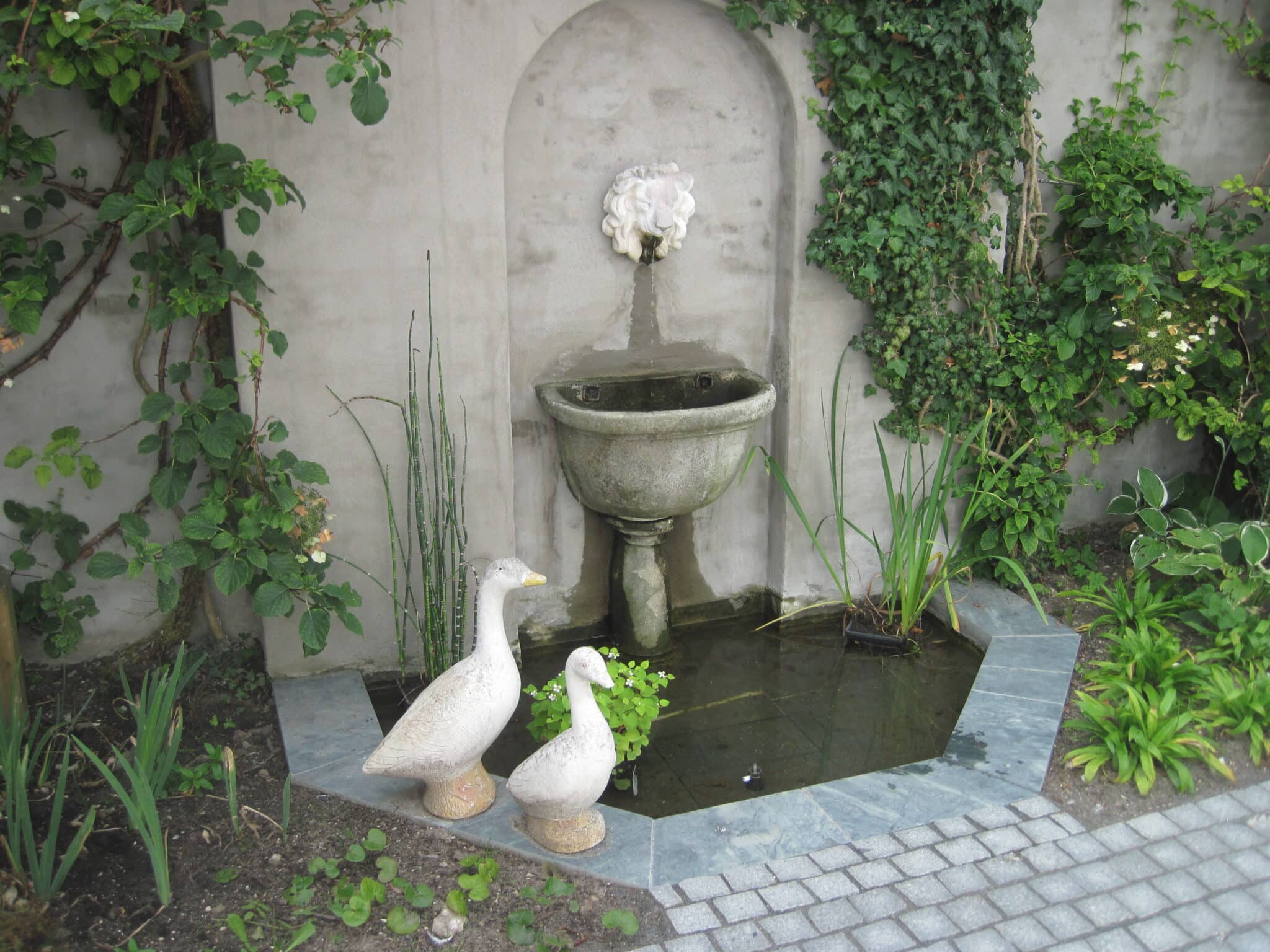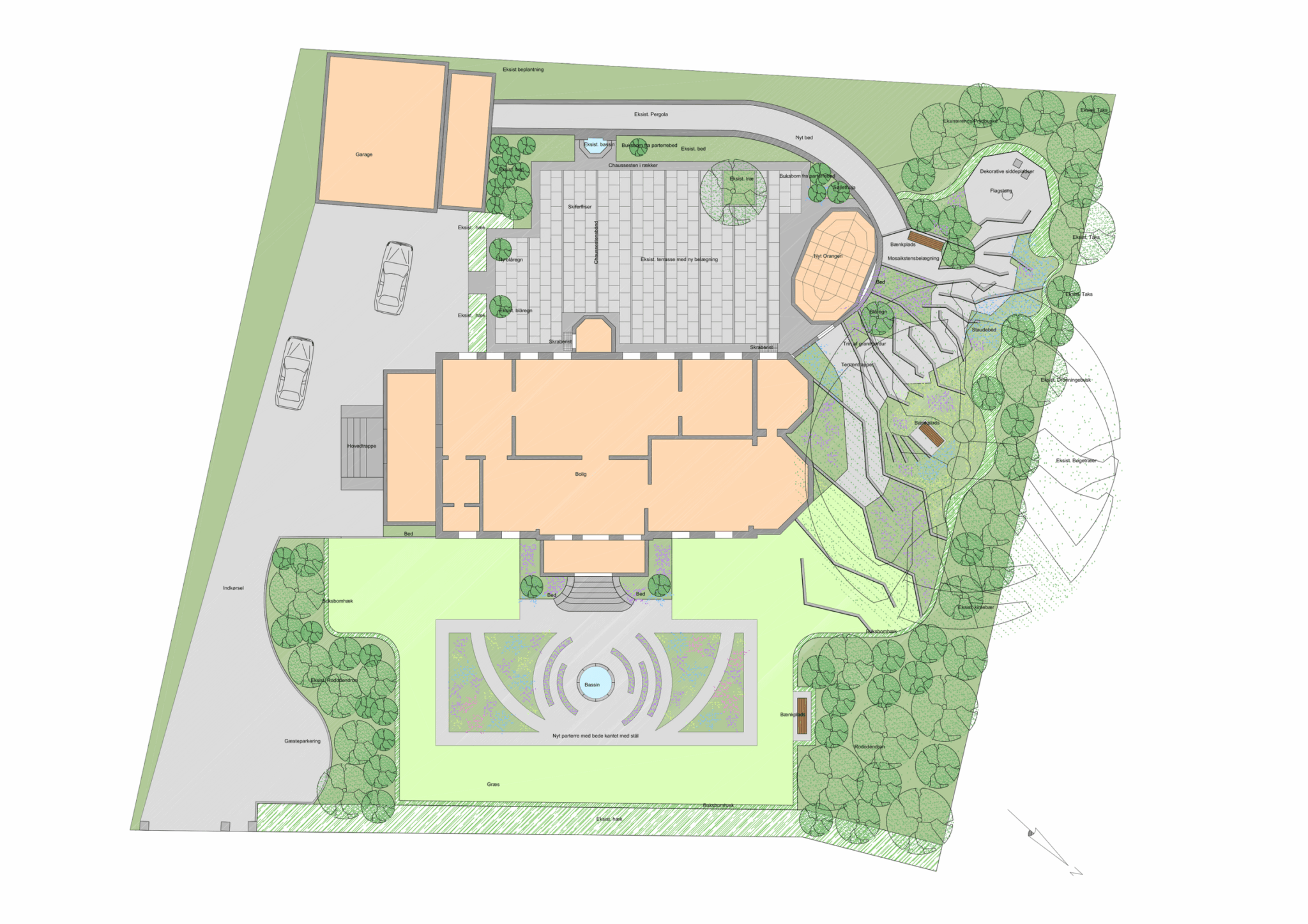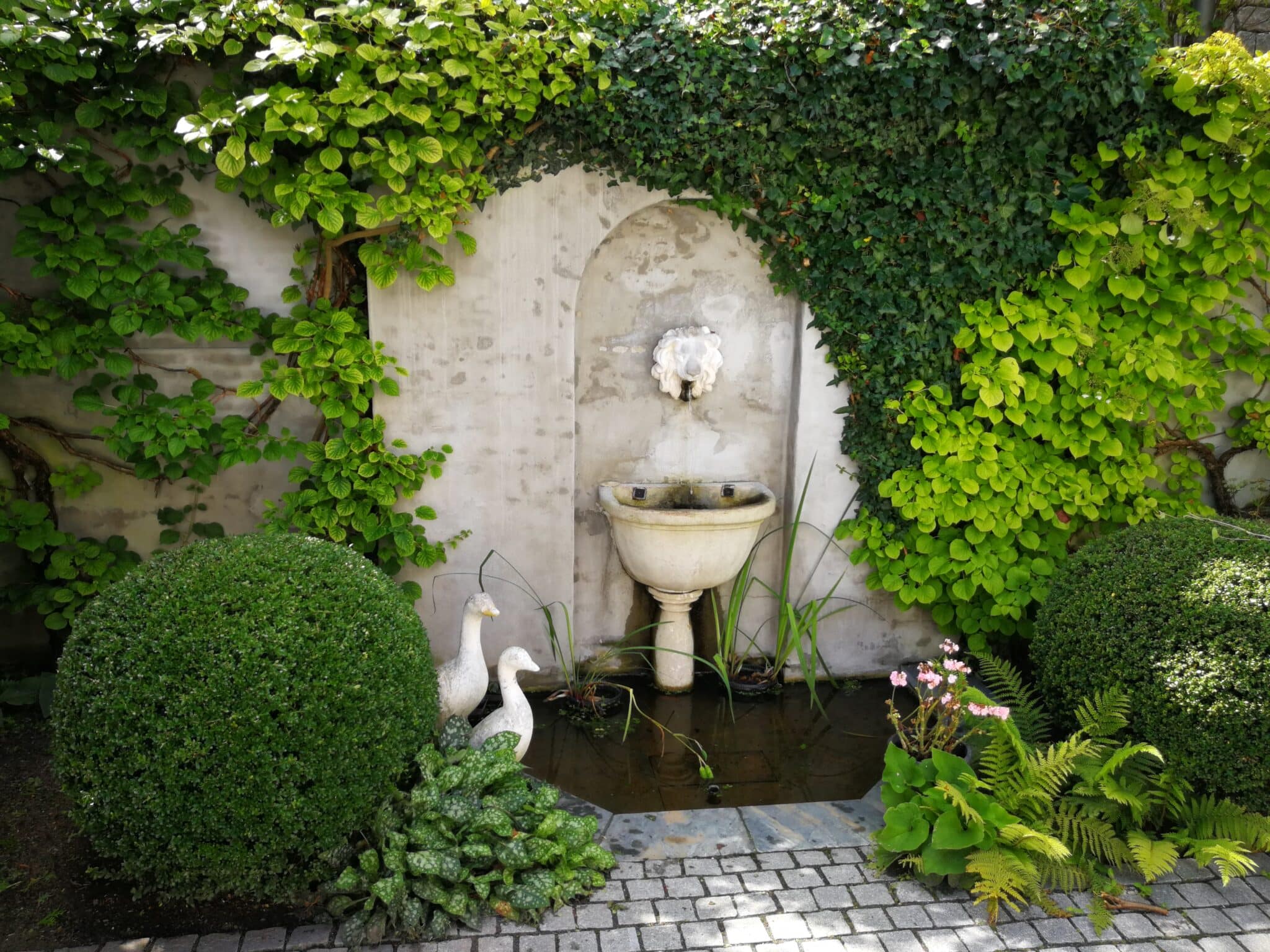 Haven er disponeret omkring en klassisk parterre, hvor et cirkulært bassin med springvand er centrum. Bassinet er omgivet af lavendler, mens bedene er indrammet af cortenstål, så de buede linjer står skarpt. Beplantningen er sammensat af roser, prydløg, akeleje, digitalis, martagonliljer og iris, suppleret af bunddækkende stauder, prydgræsser og stedsegrønne planter, der giver helårsstruktur og et smukt vinterbillede.