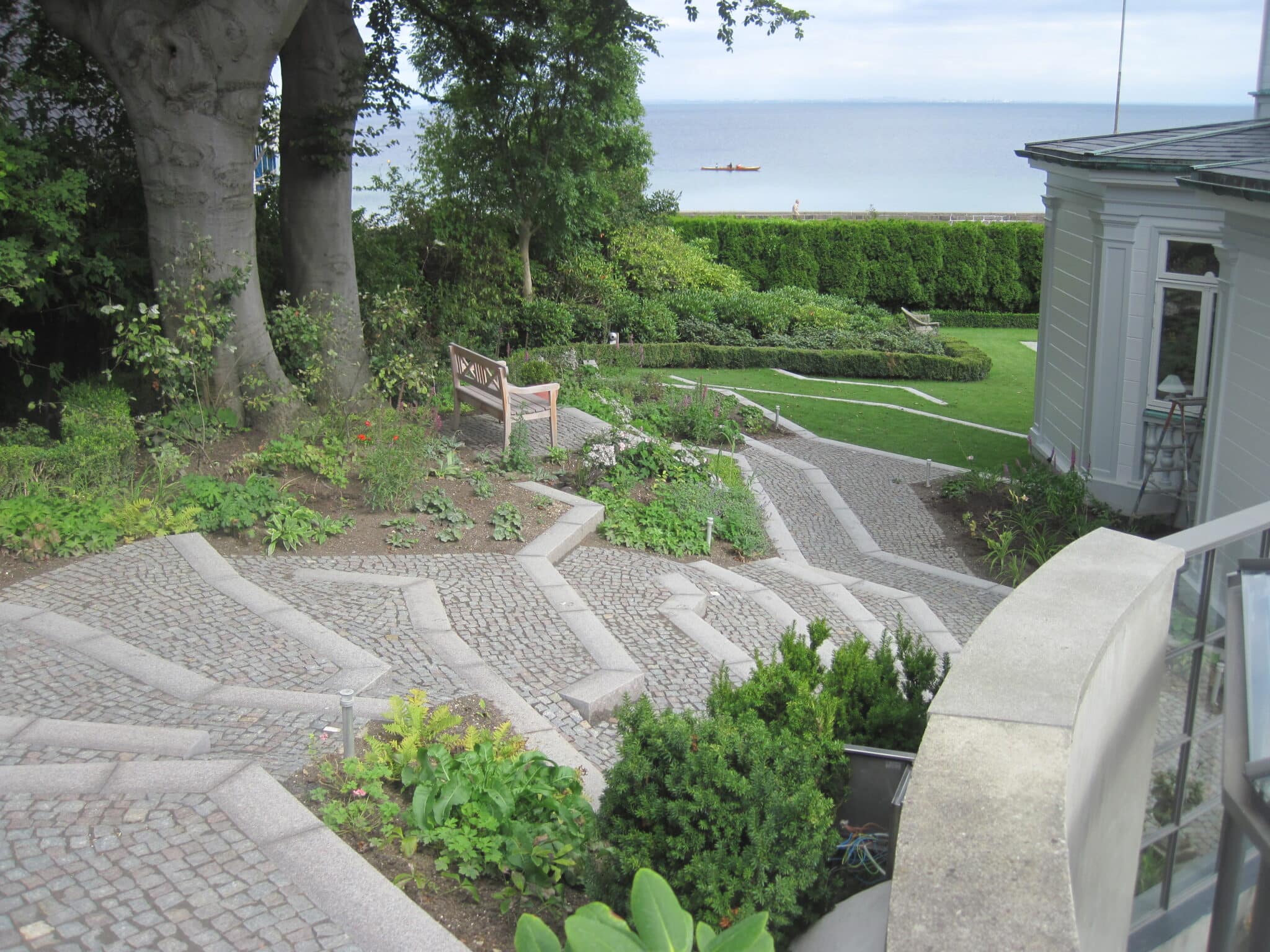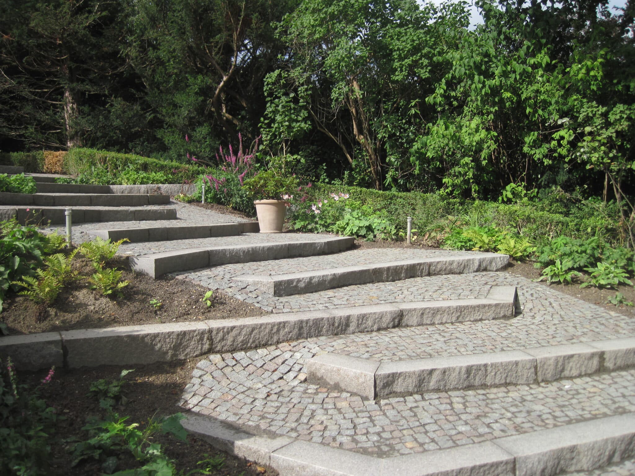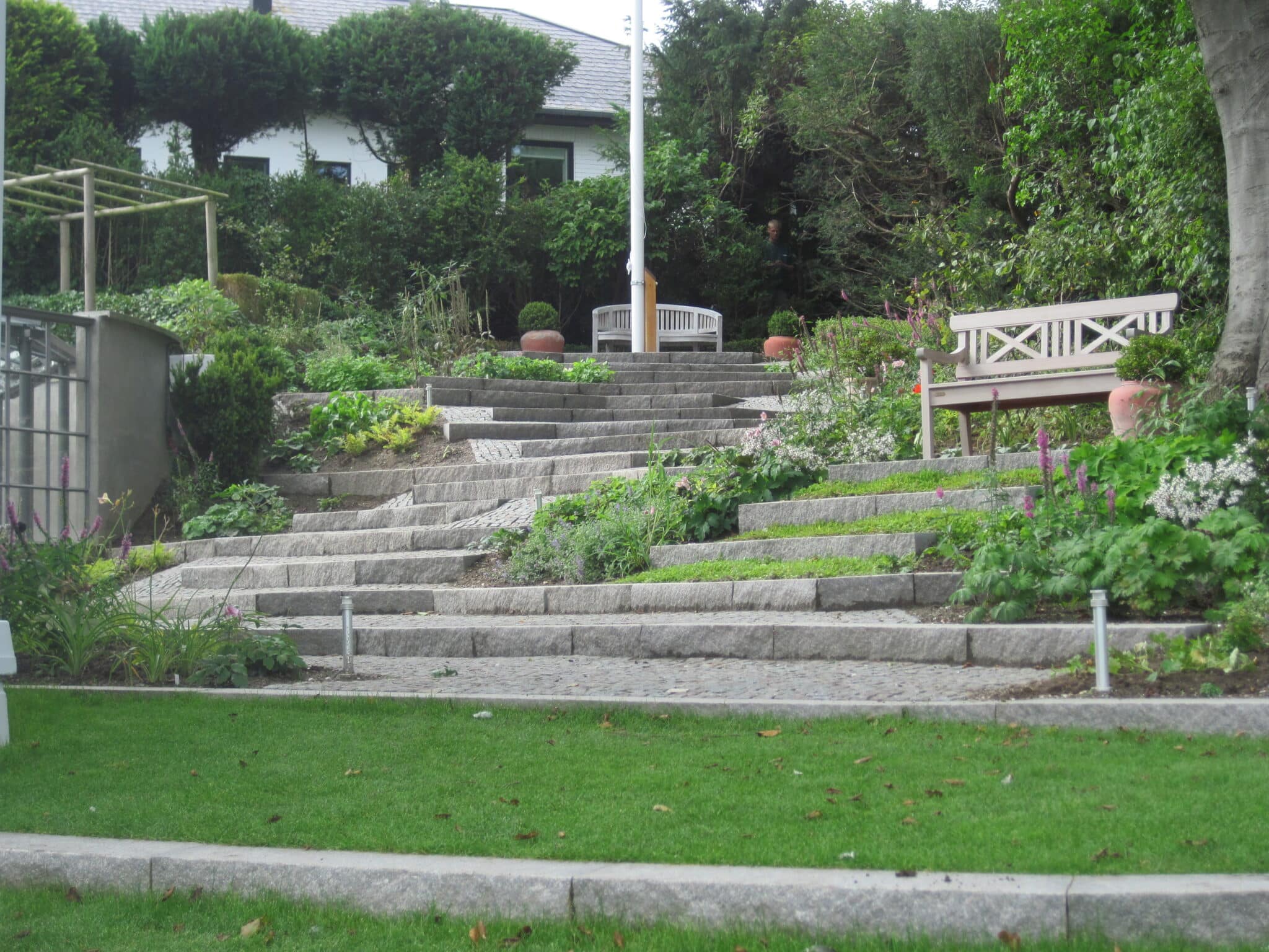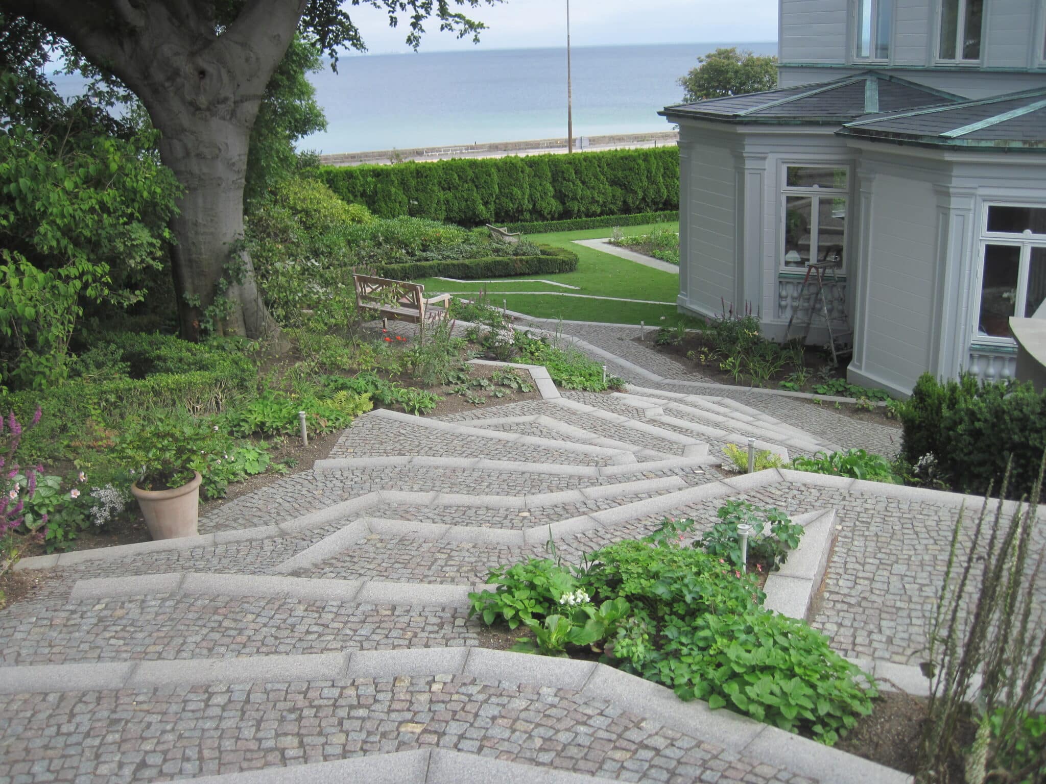 Fra parterret leder en granittrappe videre op til huset. Trappen er kombineret med opholdspladser og en flagstangsplads, der er integreret i forløbet. En mosaikbelægning i bornholmsk granit binder de forskellige niveauer sammen og giver haven et eksklusivt præg.