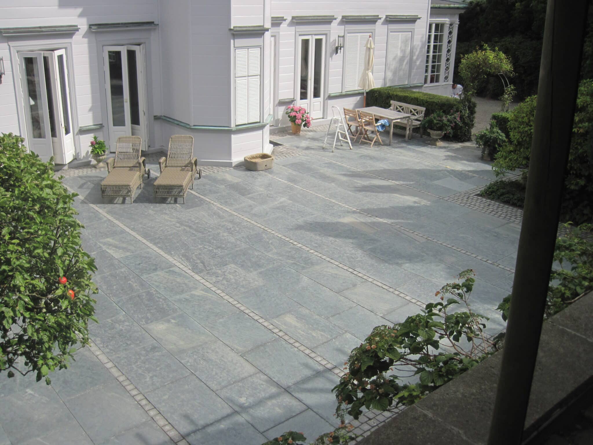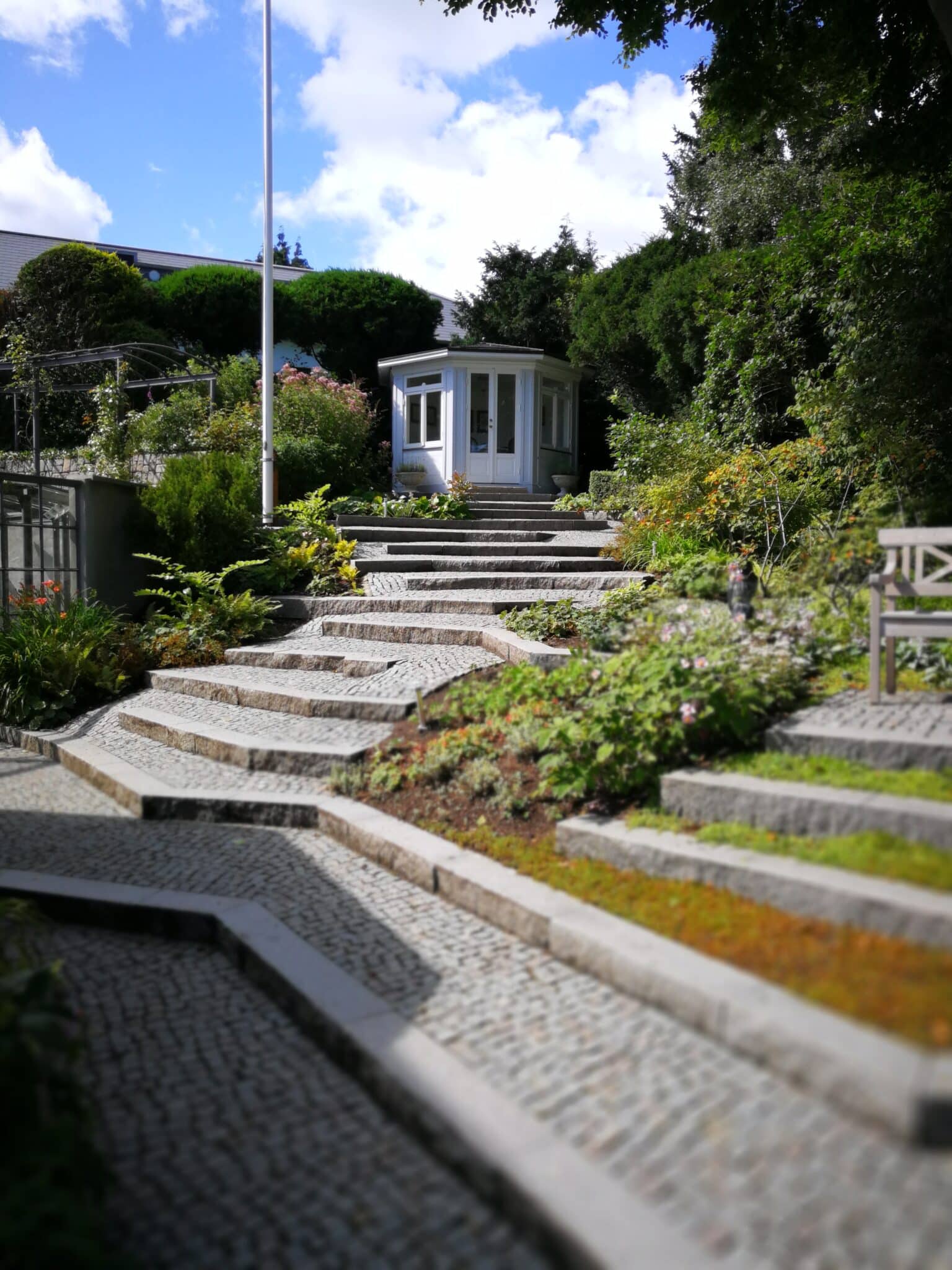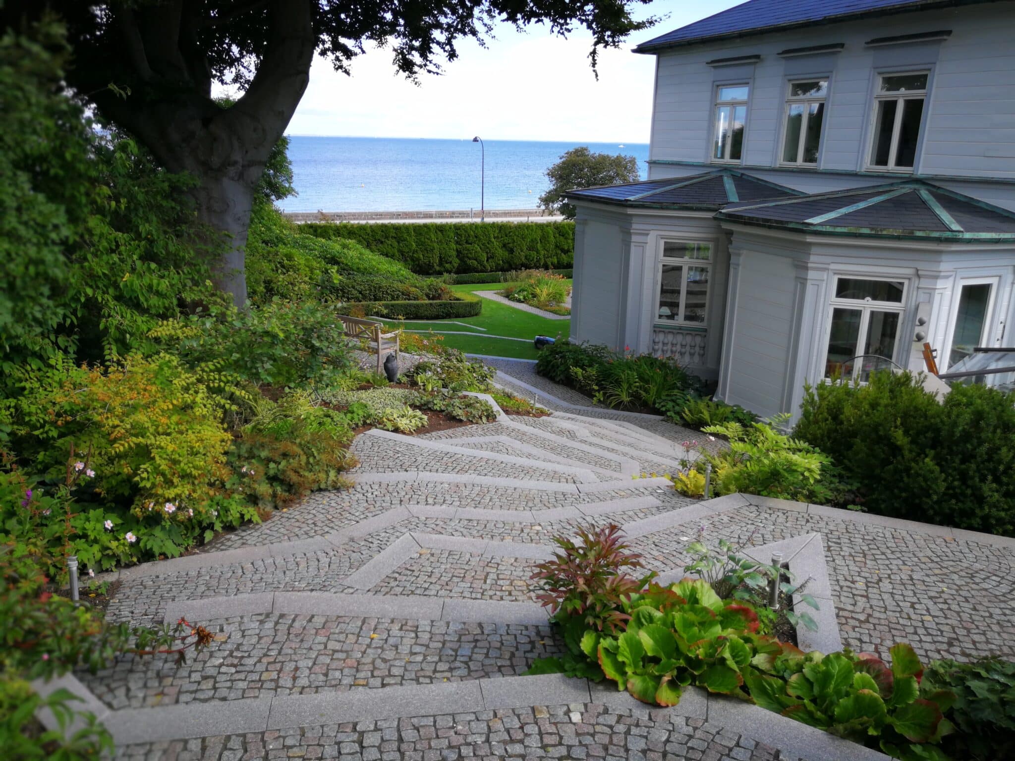 Fra parterret leder en granittrappe videre op til huset. Trappen er kombineret med opholdspladser og en flagstangsplads, der er integreret i forløbet. En mosaikbelægning i bornholmsk granit binder de forskellige niveauer sammen og giver haven et eksklusivt præg.
