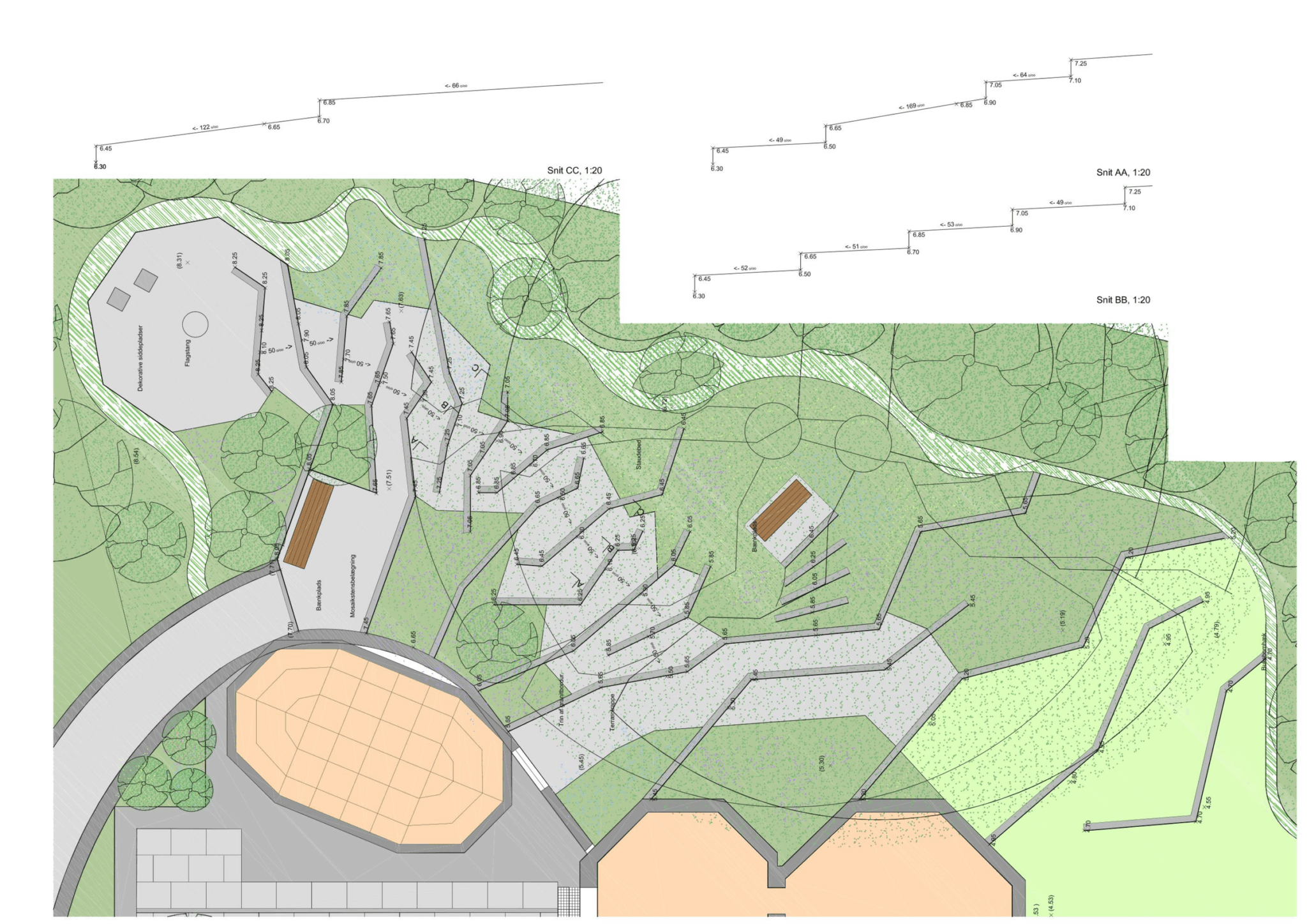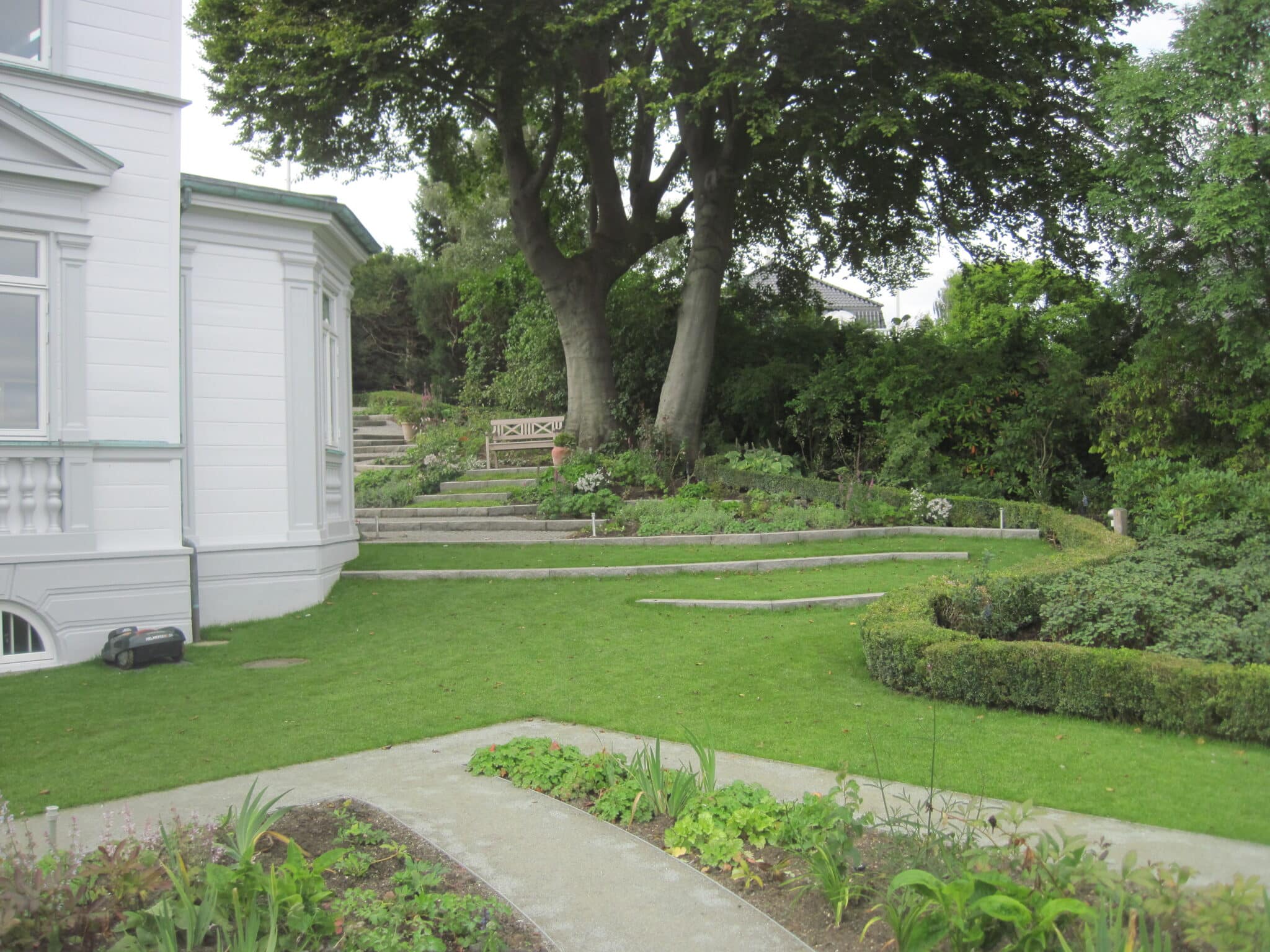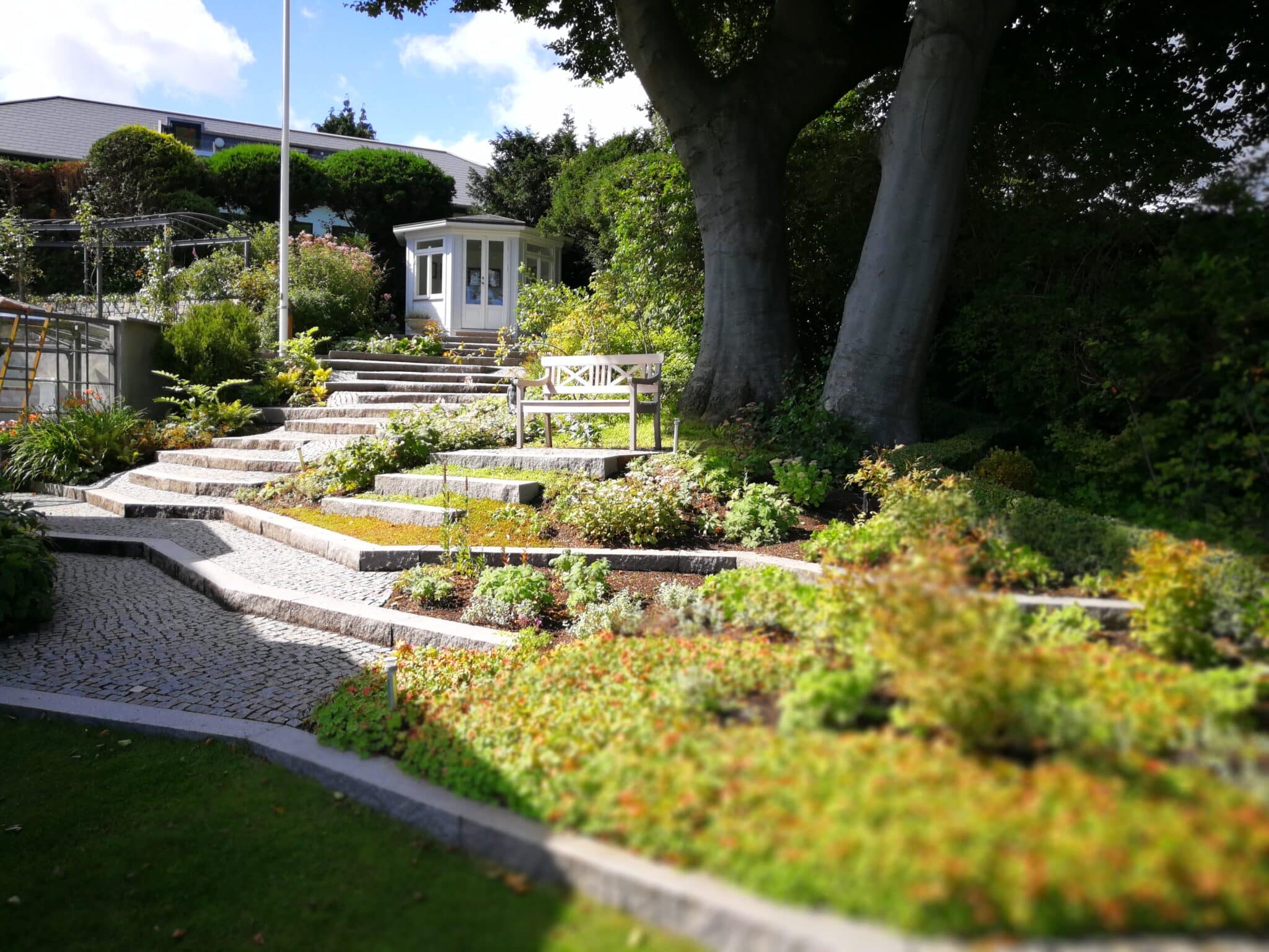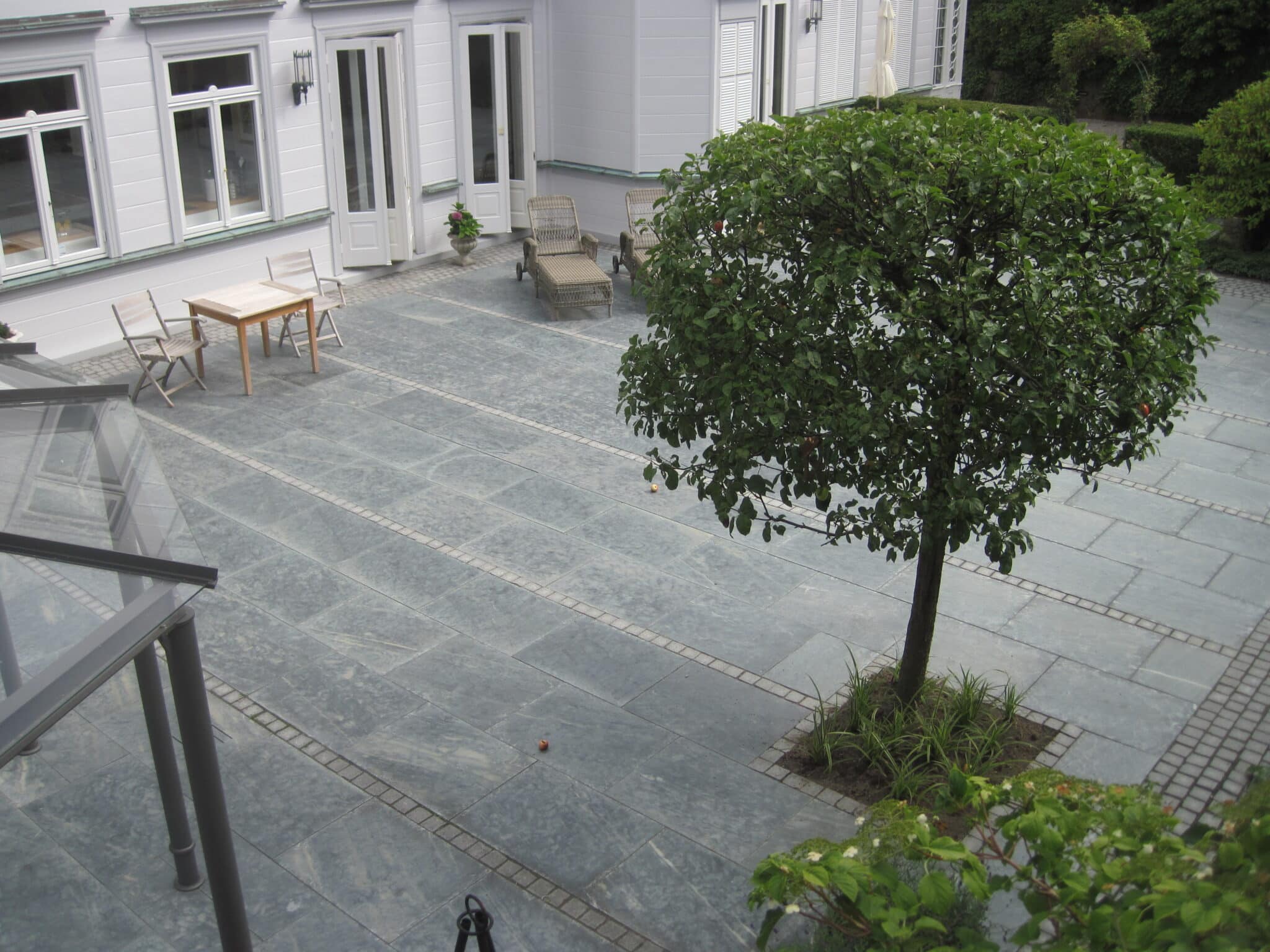 Fra parterret leder en granittrappe videre op til huset. Trappen er kombineret med opholdspladser og en flagstangsplads, der er integreret i forløbet. En mosaikbelægning i bornholmsk granit binder de forskellige niveauer sammen og giver haven et eksklusivt præg.