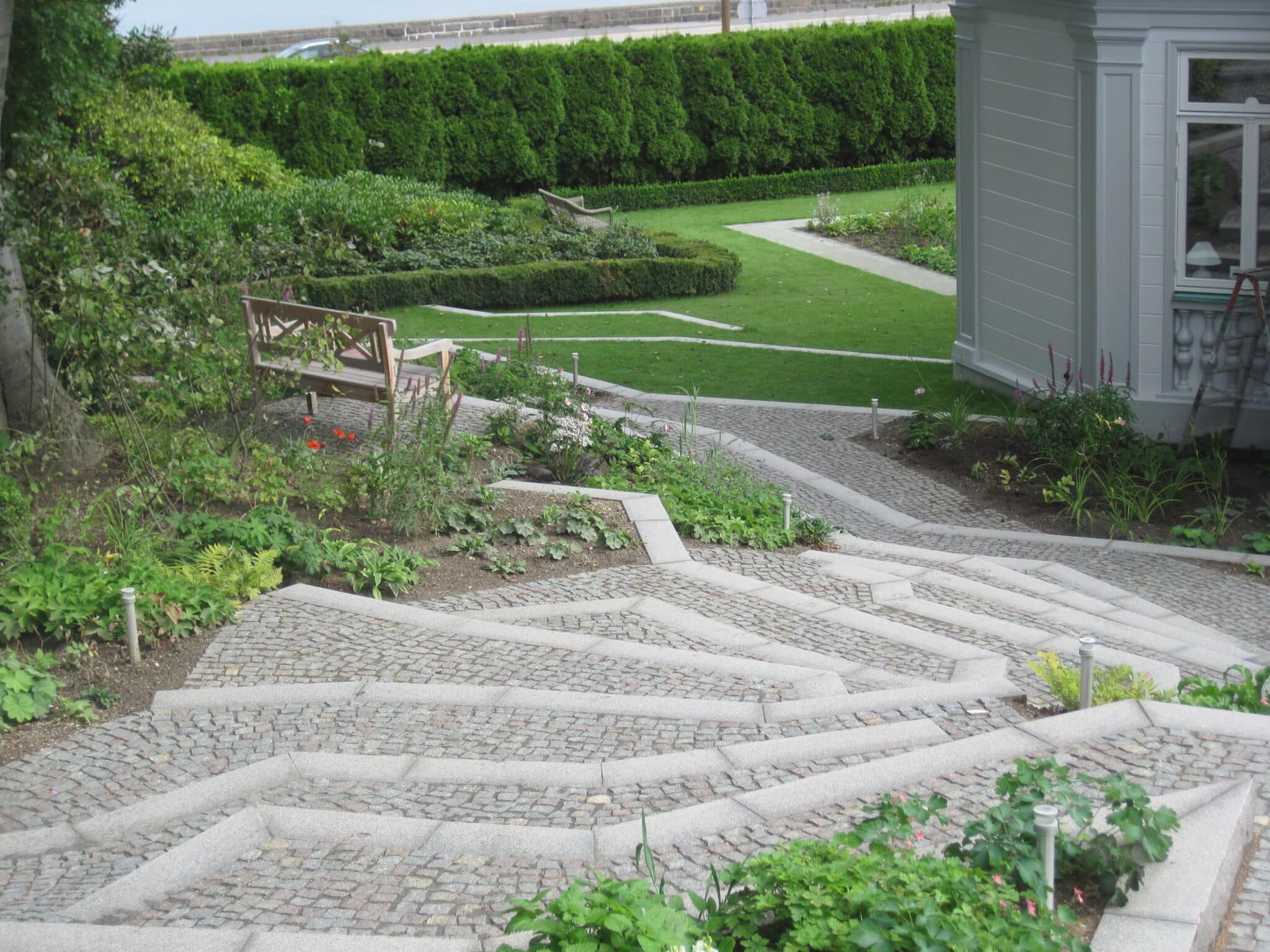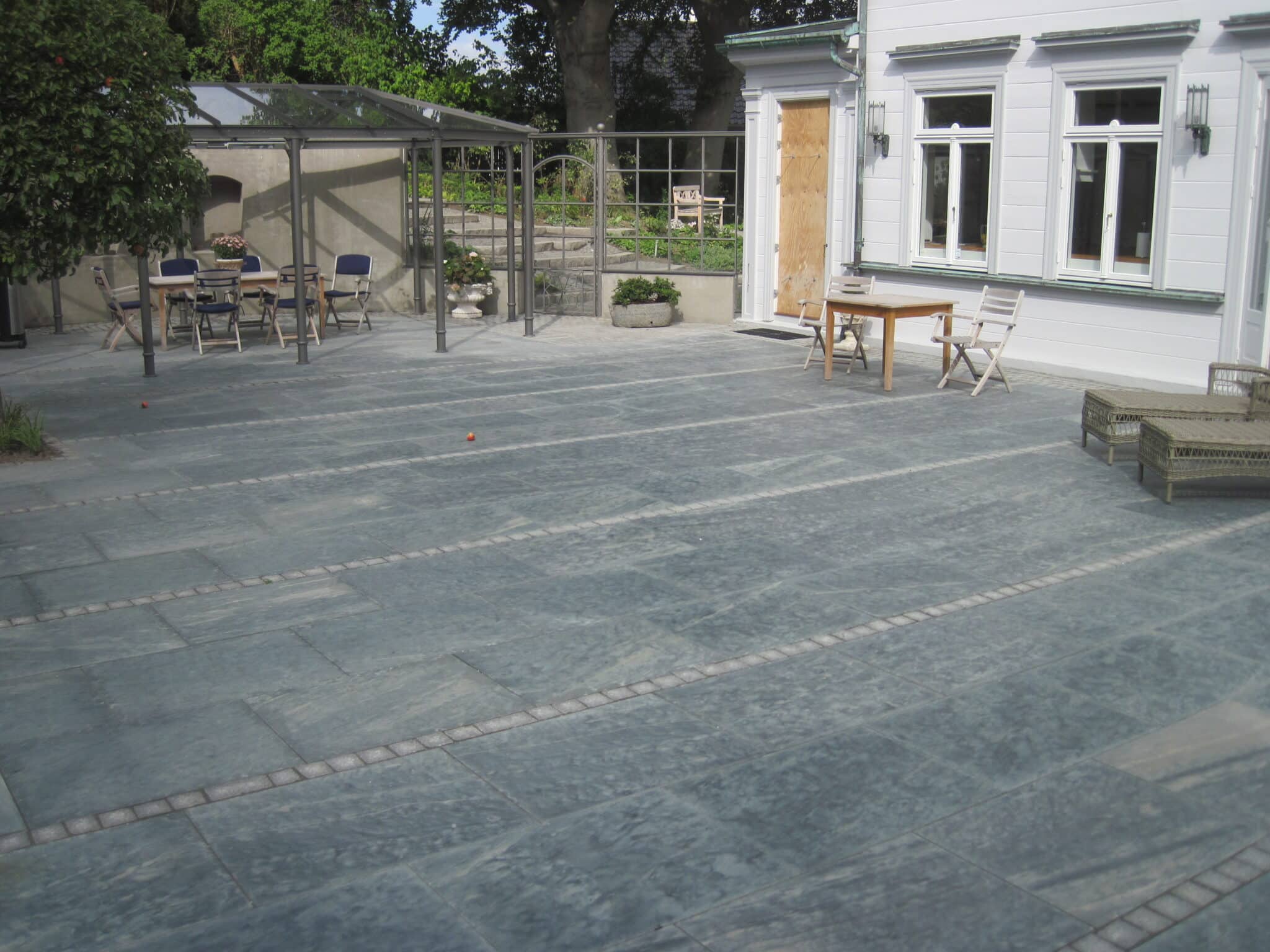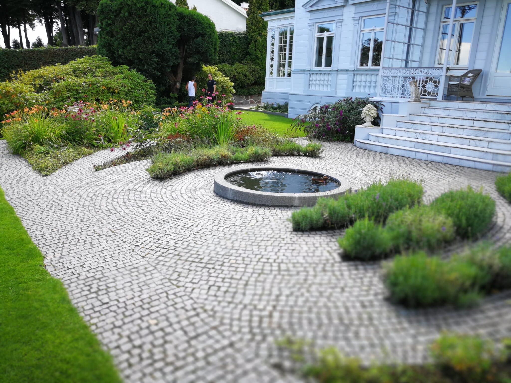 Samarbejdet med Annestausholm.dk har resulteret i en klassisk og elegant have, hvor arkitektoniske elementer, mosaikbelægning i bornholmsk granit og frodig beplantning smelter sammen til en helstøbt helhed.