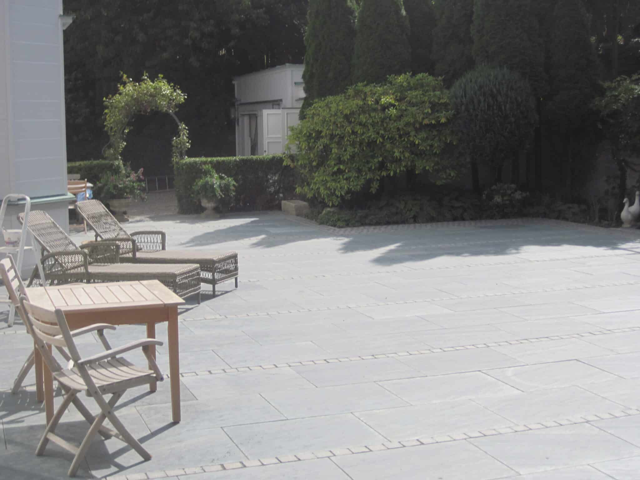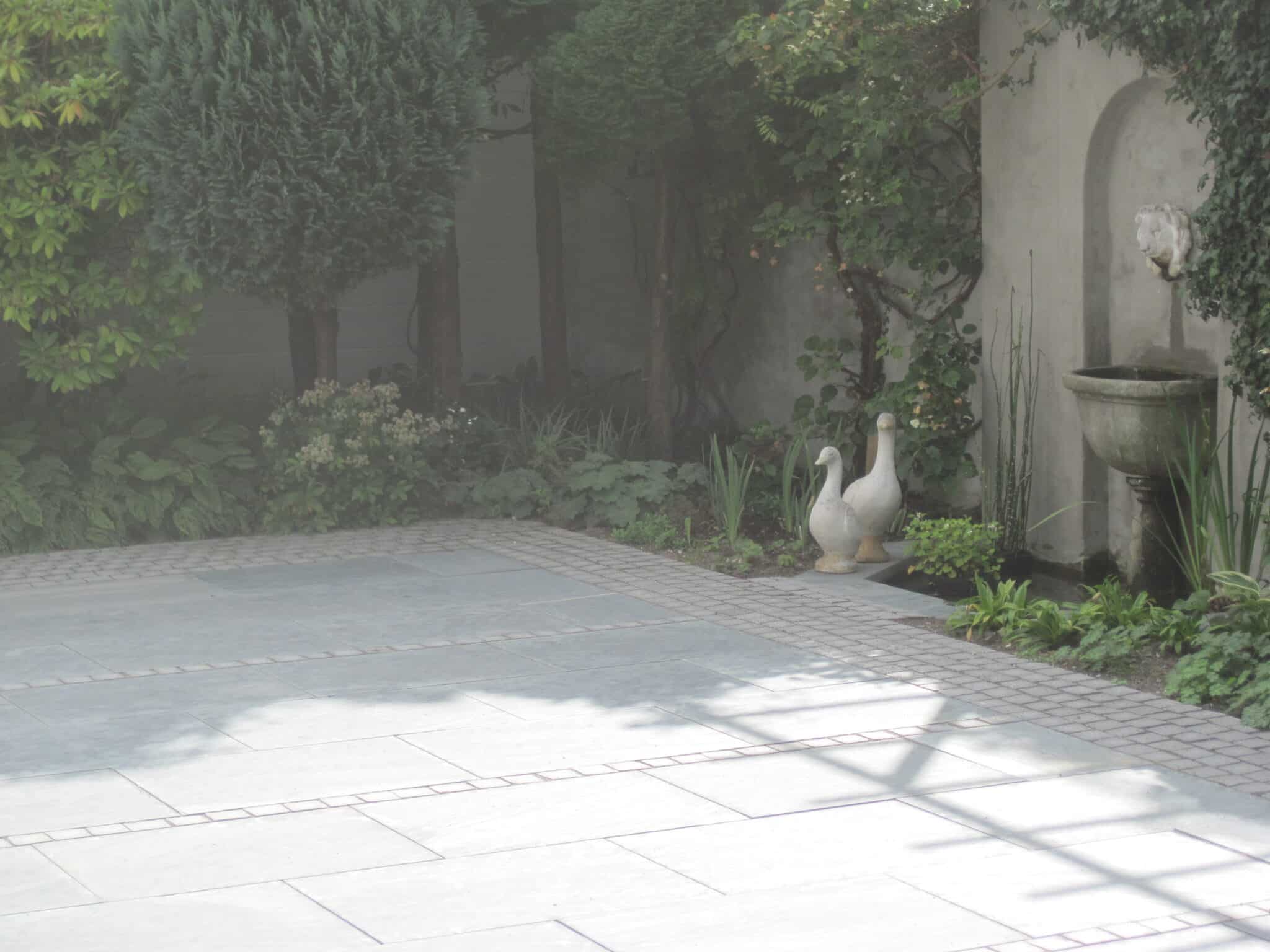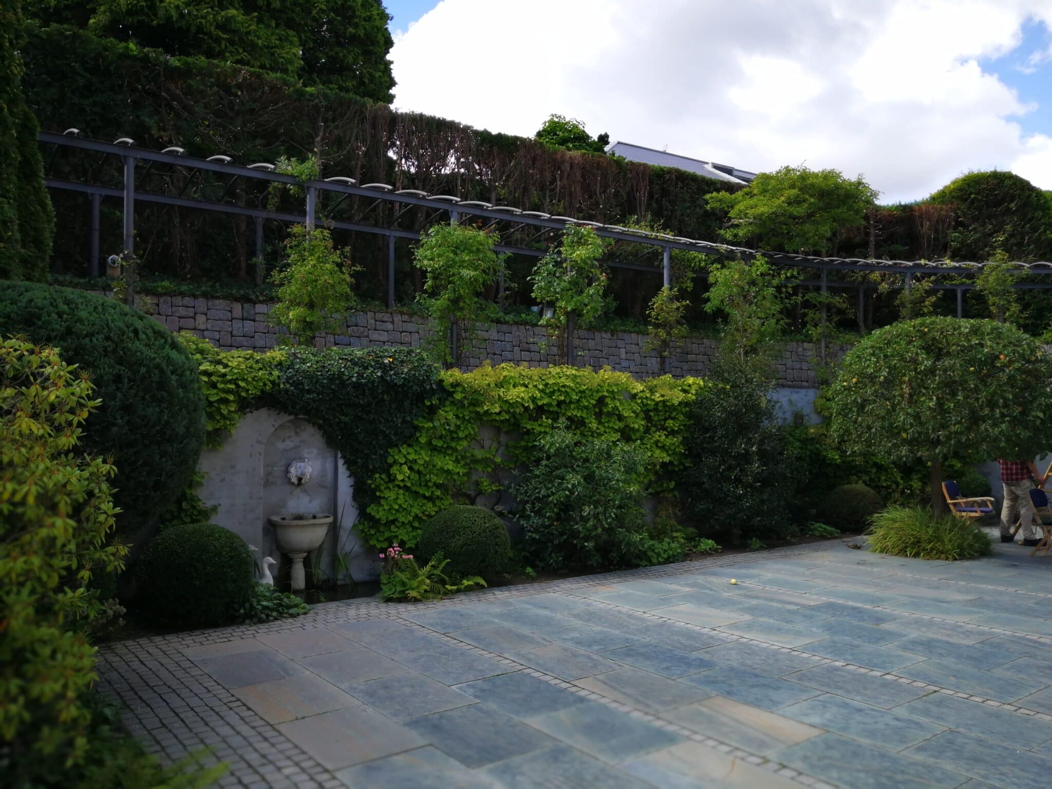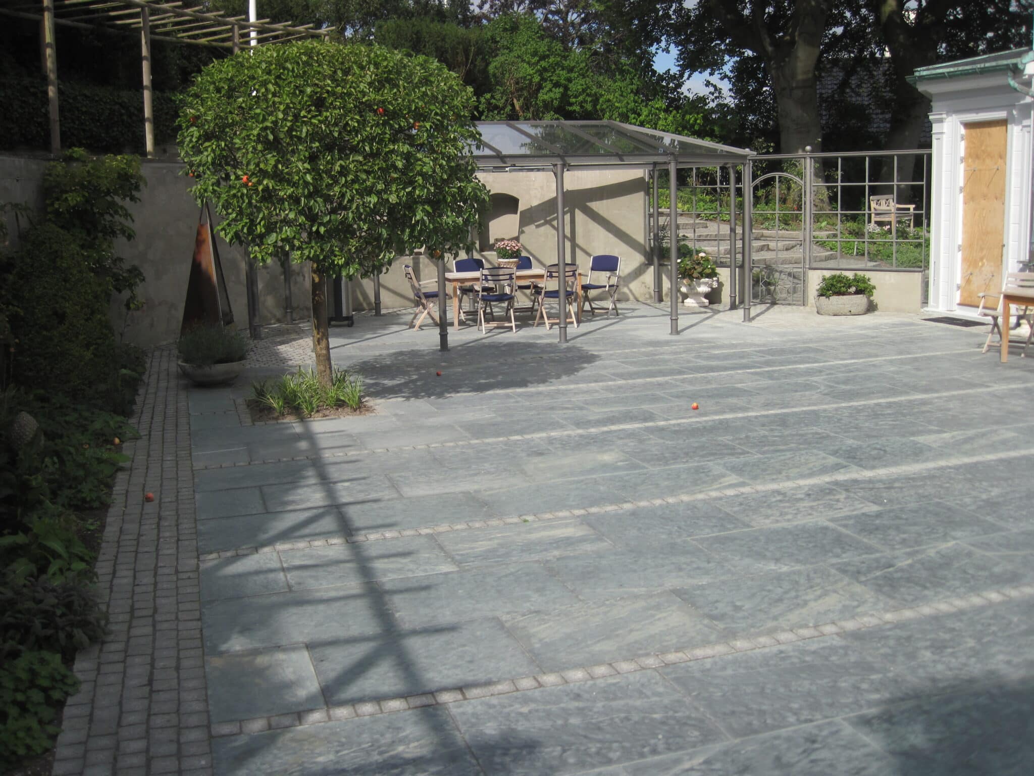 Samarbejdet med Annestausholm.dk har resulteret i en klassisk og elegant have, hvor arkitektoniske elementer, mosaikbelægning i bornholmsk granit og frodig beplantning smelter sammen til en helstøbt helhed.