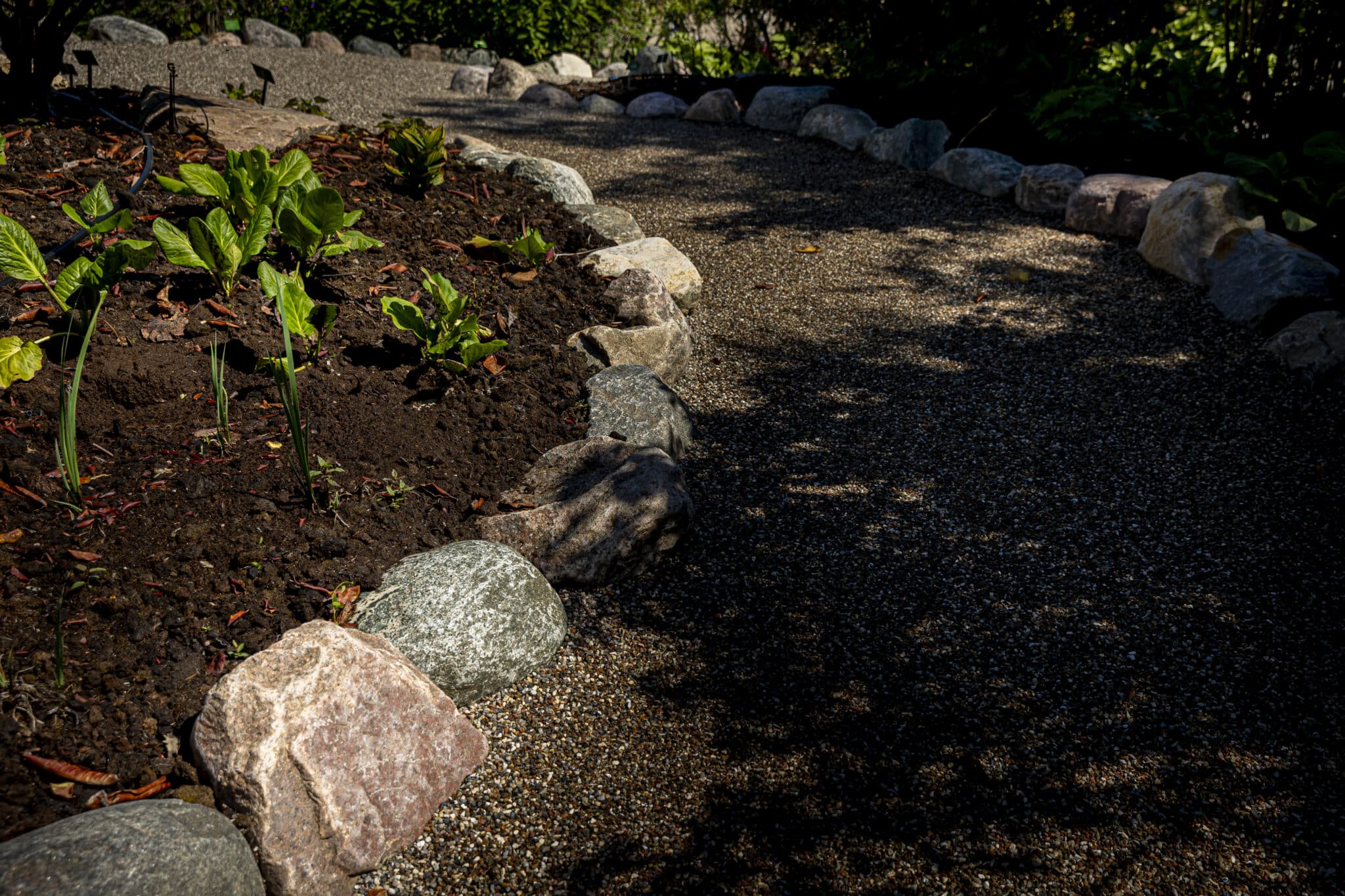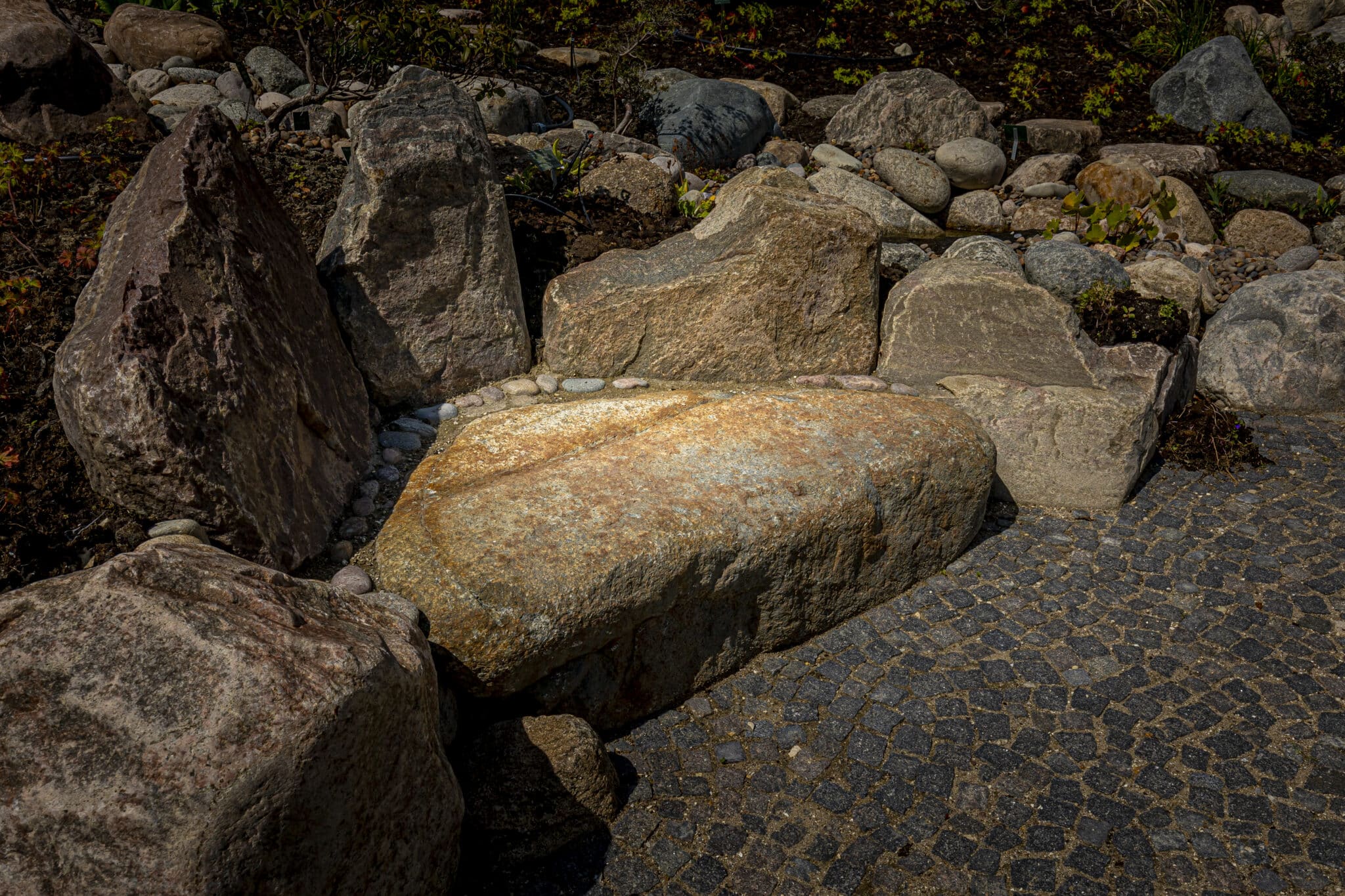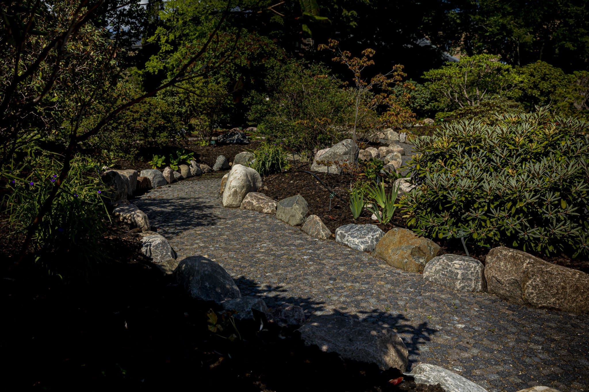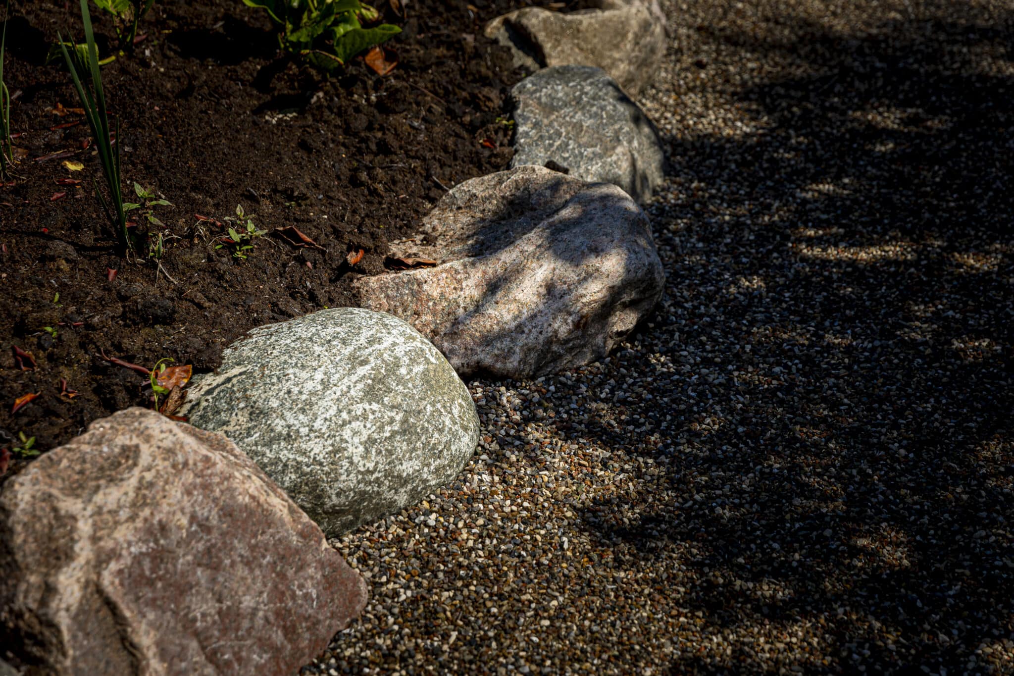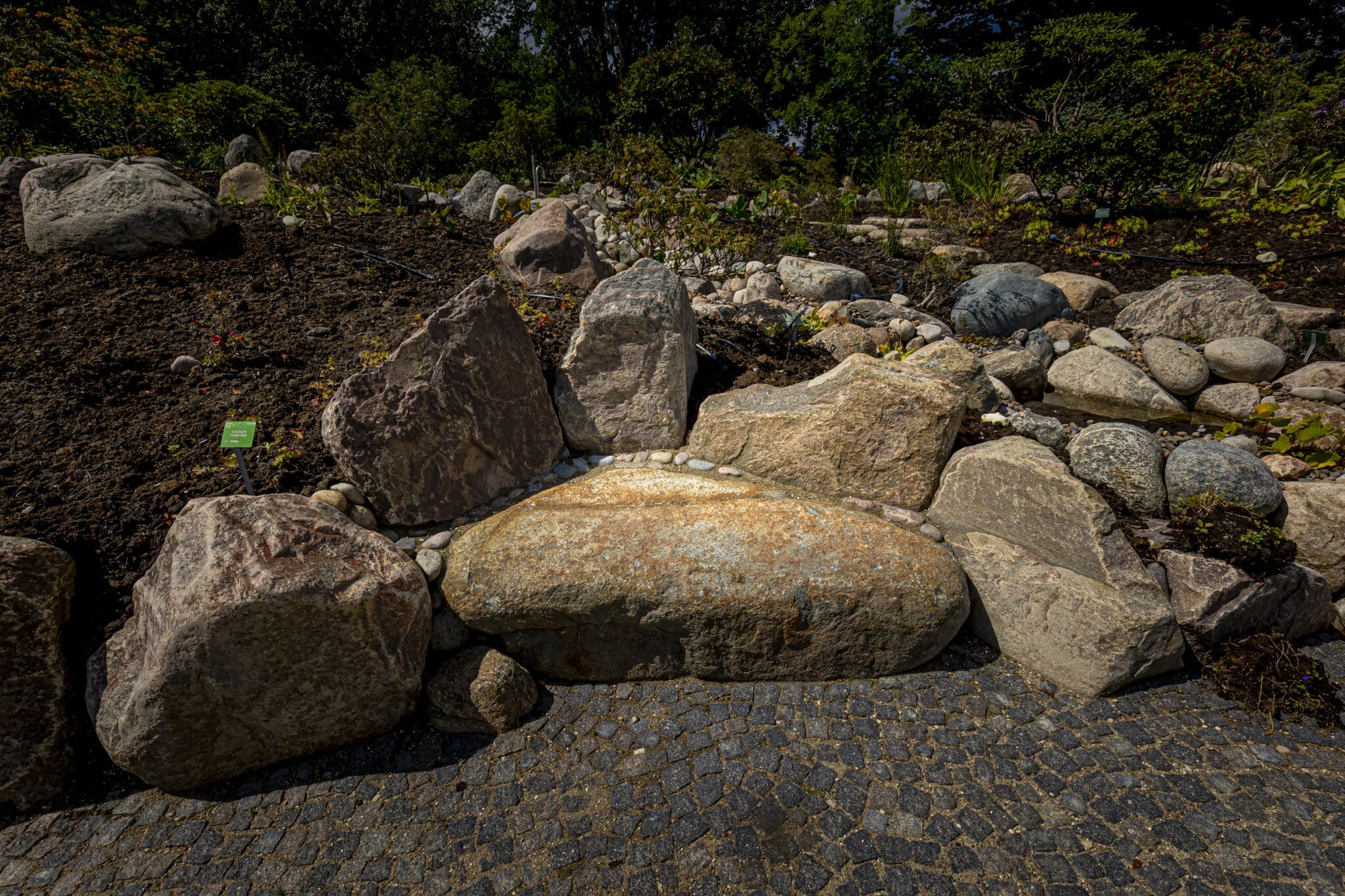 Rundt om bedene har vi etableret markante stenarrangementer – både som visuel kontrast og som beskyttelse af de sarte rododendron-plantninger. Stiforløbene er udført i granitmosaiksten og OB-overfladebelægning, som giver en solid, elegant og tidløs overgang mellem anlæg og natur.