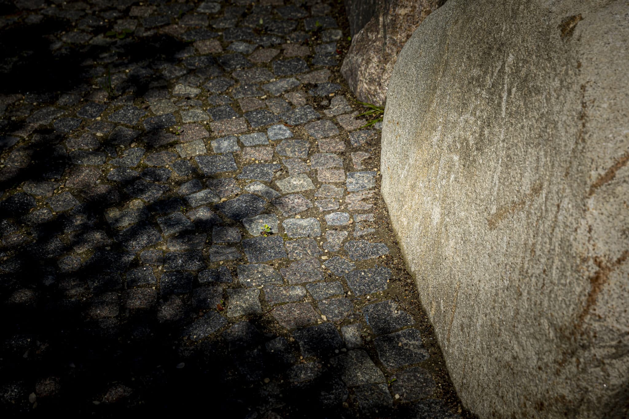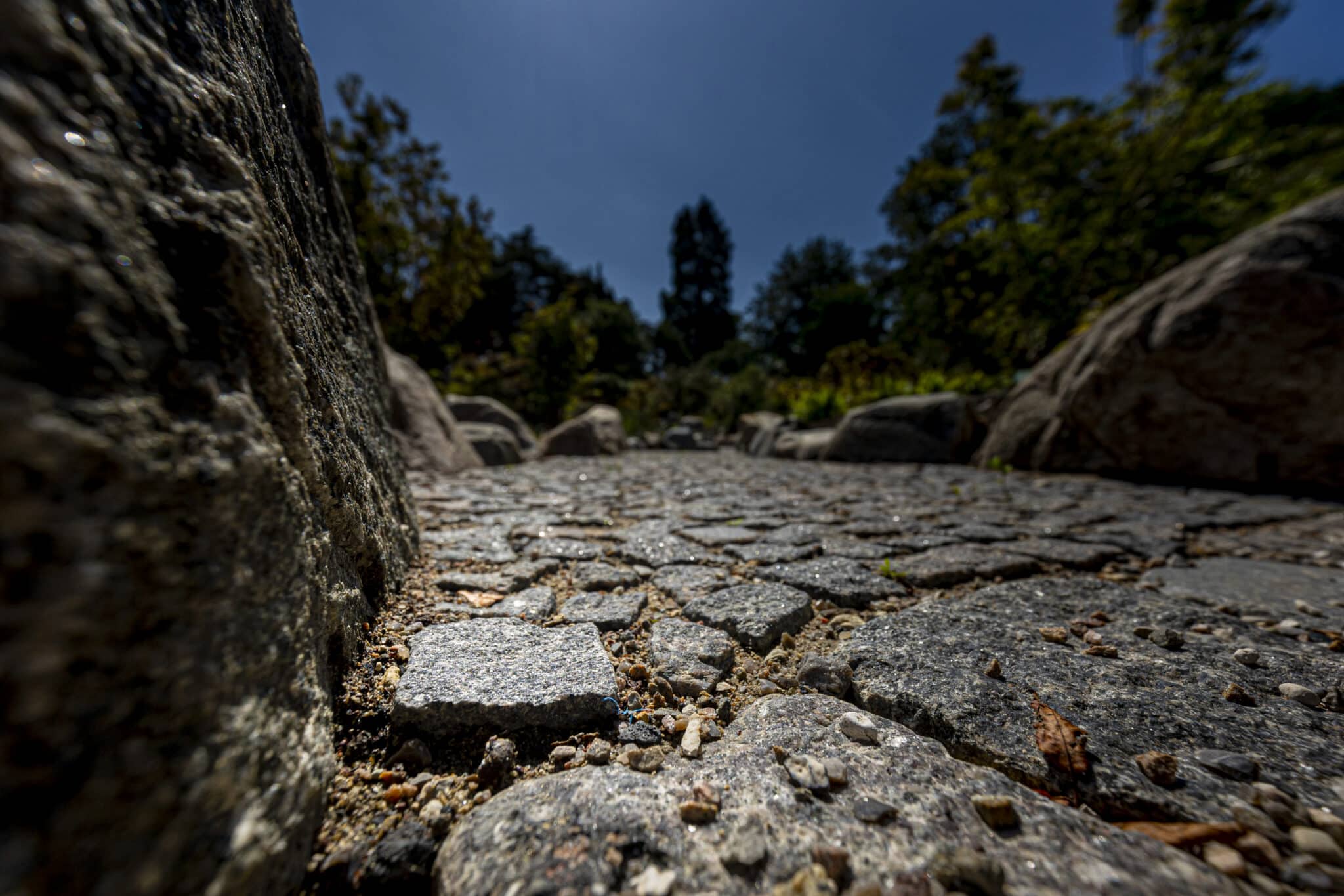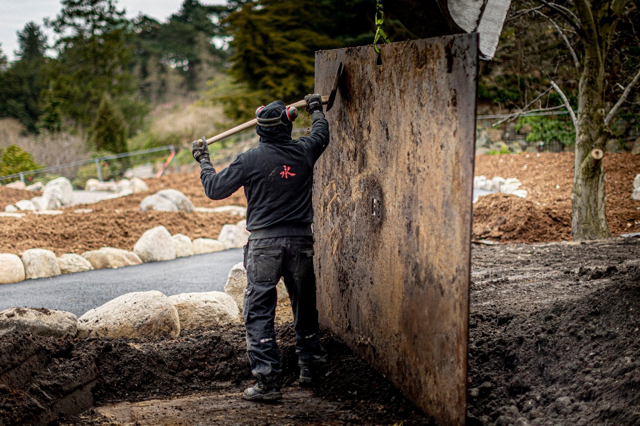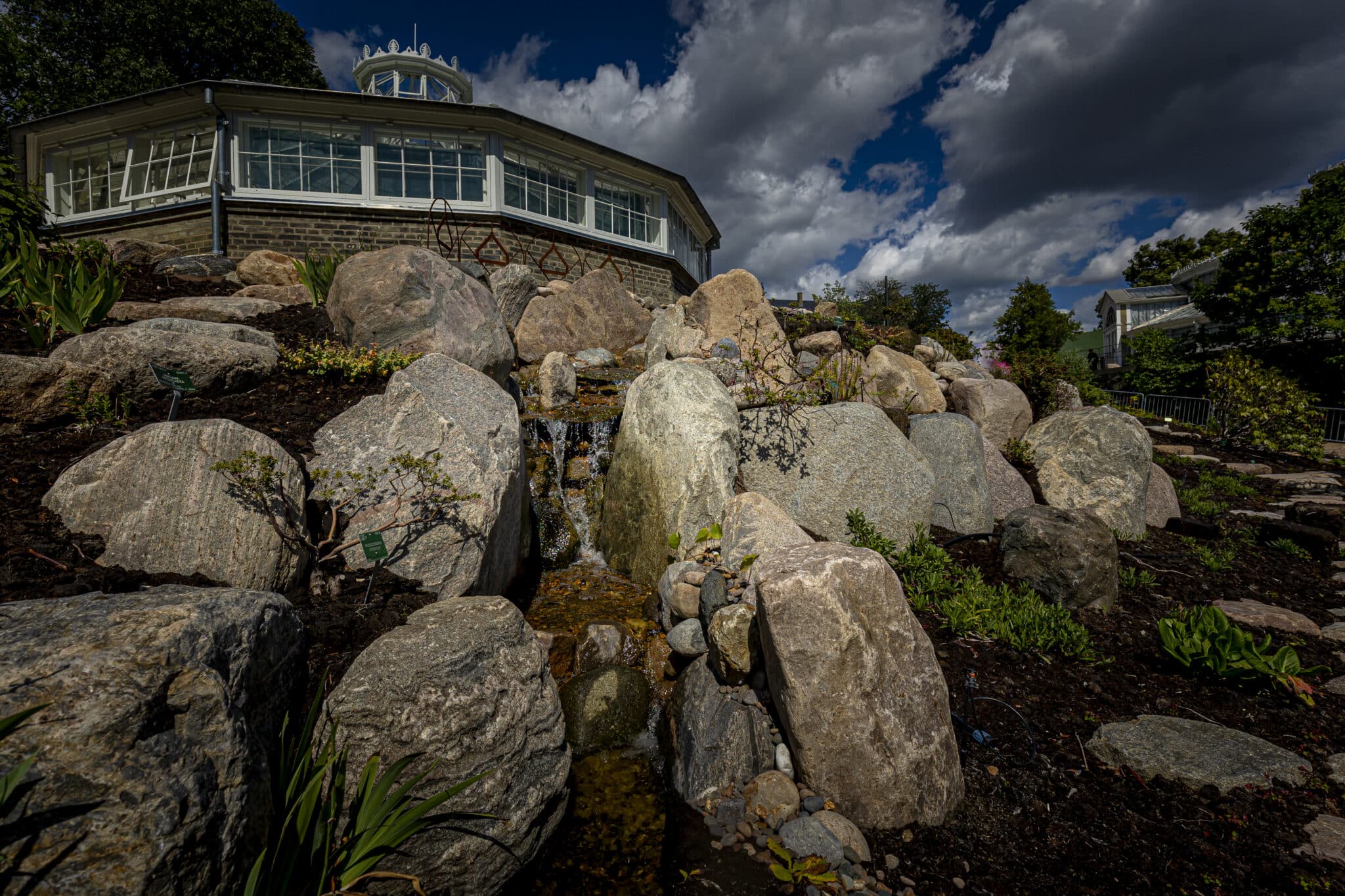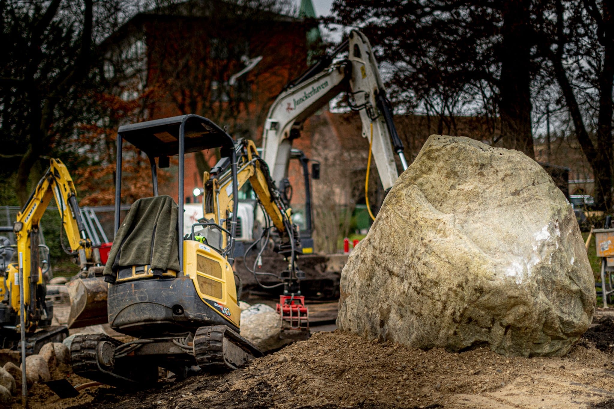 Rundt om bedene har vi etableret markante stenarrangementer – både som visuel kontrast og som beskyttelse af de sarte rododendron-plantninger. Stiforløbene er udført i granitmosaiksten og OB-overfladebelægning, som giver en solid, elegant og tidløs overgang mellem anlæg og natur.