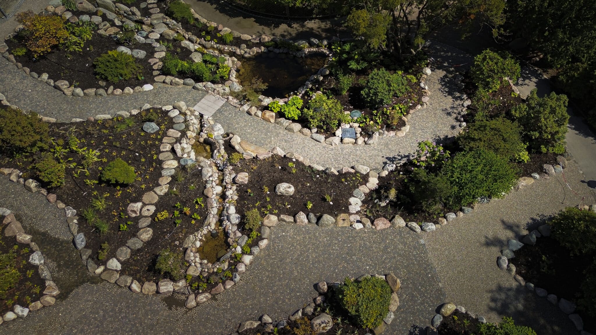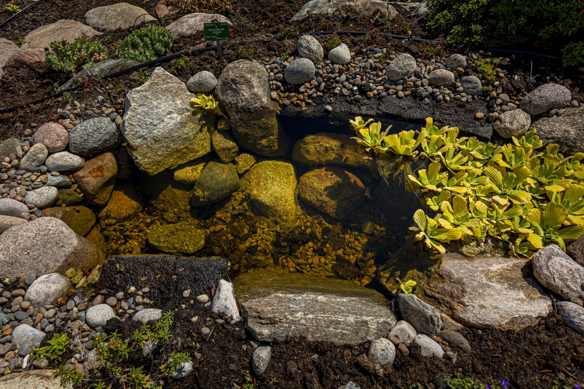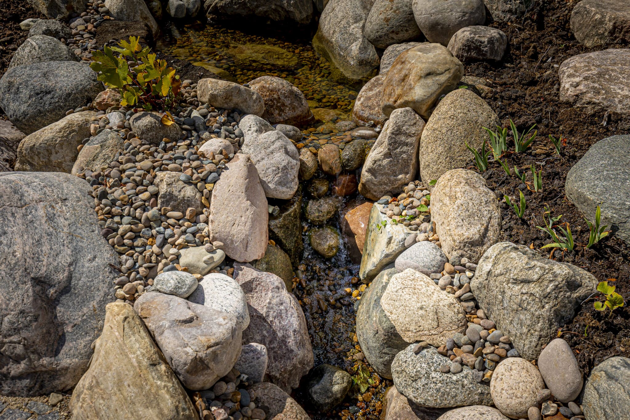Vandforløbet er opbygget lagvis med geotekstil, bassinfolie, danske natursten og klyner som kantmateriale, så vandet bevæger sig roligt og naturligt mellem stier og beplantning. Planter kan vokse helt ud i vandspejlet, og området vil år for år blive mere frodigt, stabilt og indgroet.