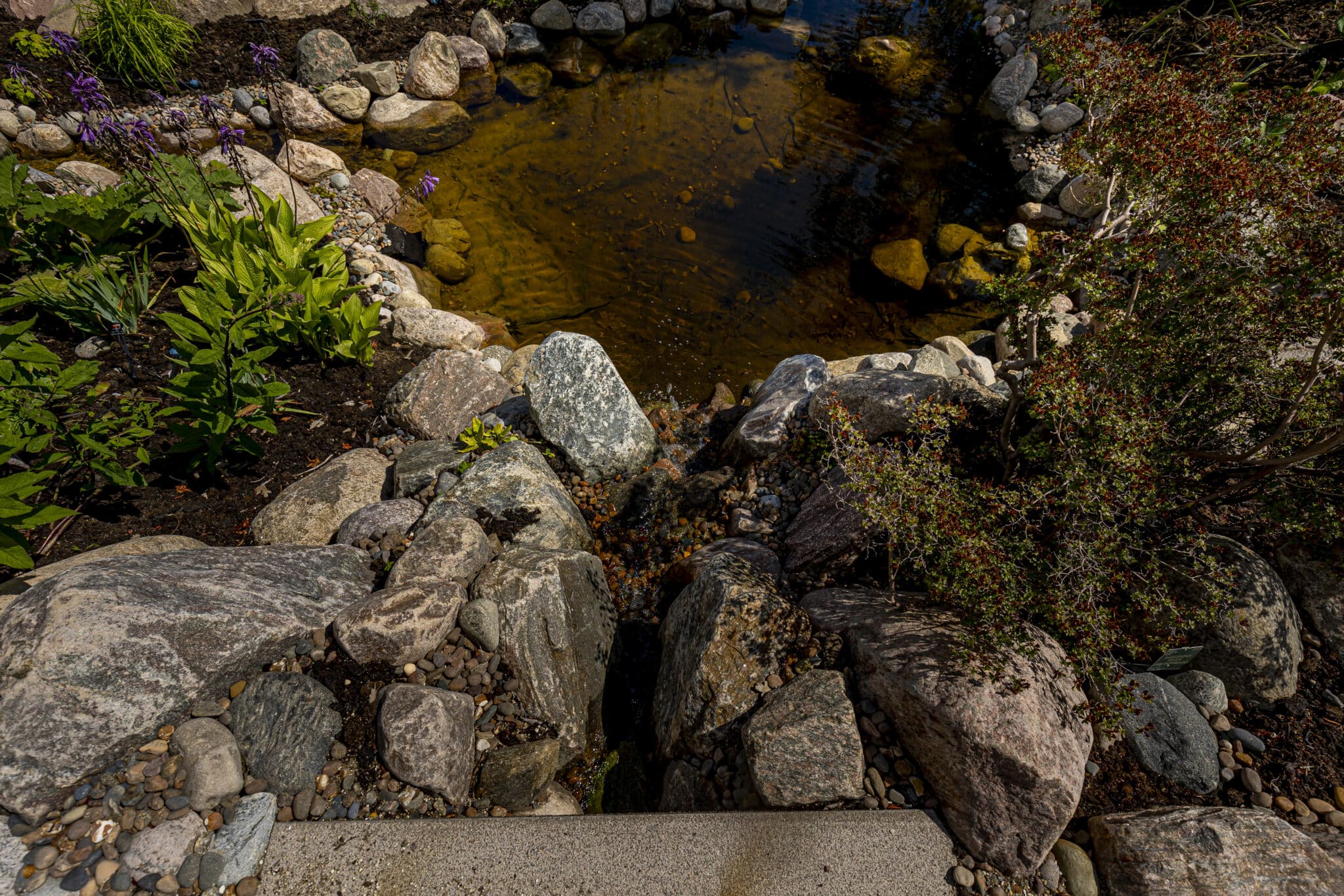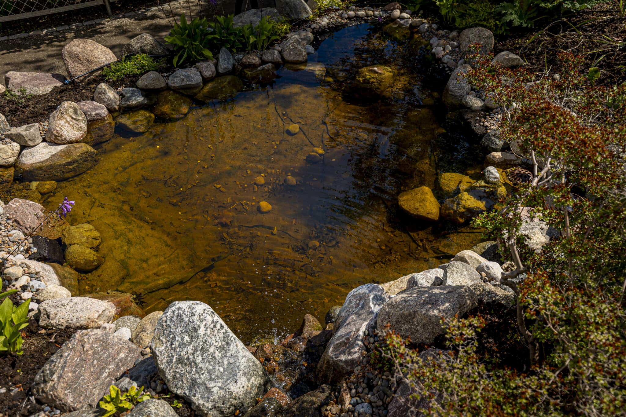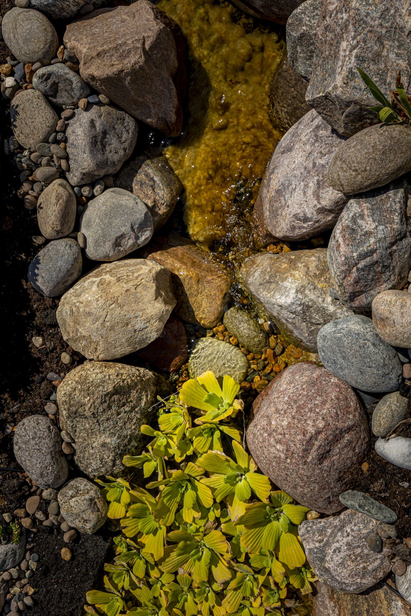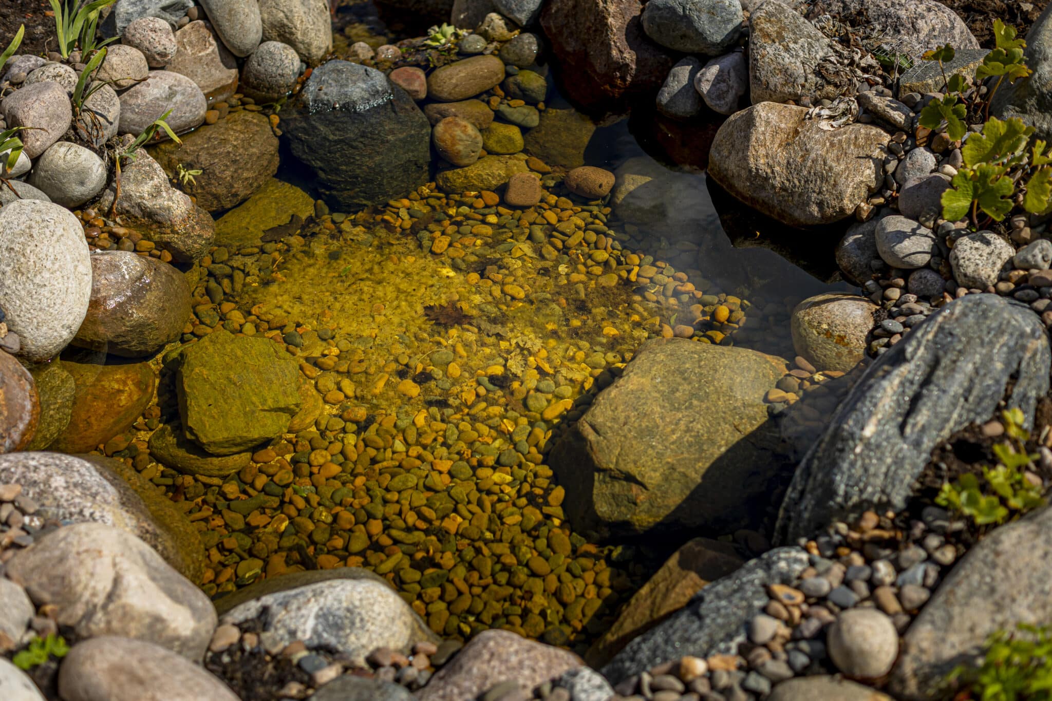 Vandforløbet er opbygget lagvis med geotekstil, bassinfolie, danske natursten og klyner som kantmateriale, så vandet bevæger sig roligt og naturligt mellem stier og beplantning. Planter kan vokse helt ud i vandspejlet, og området vil år for år blive mere frodigt, stabilt og indgroet.