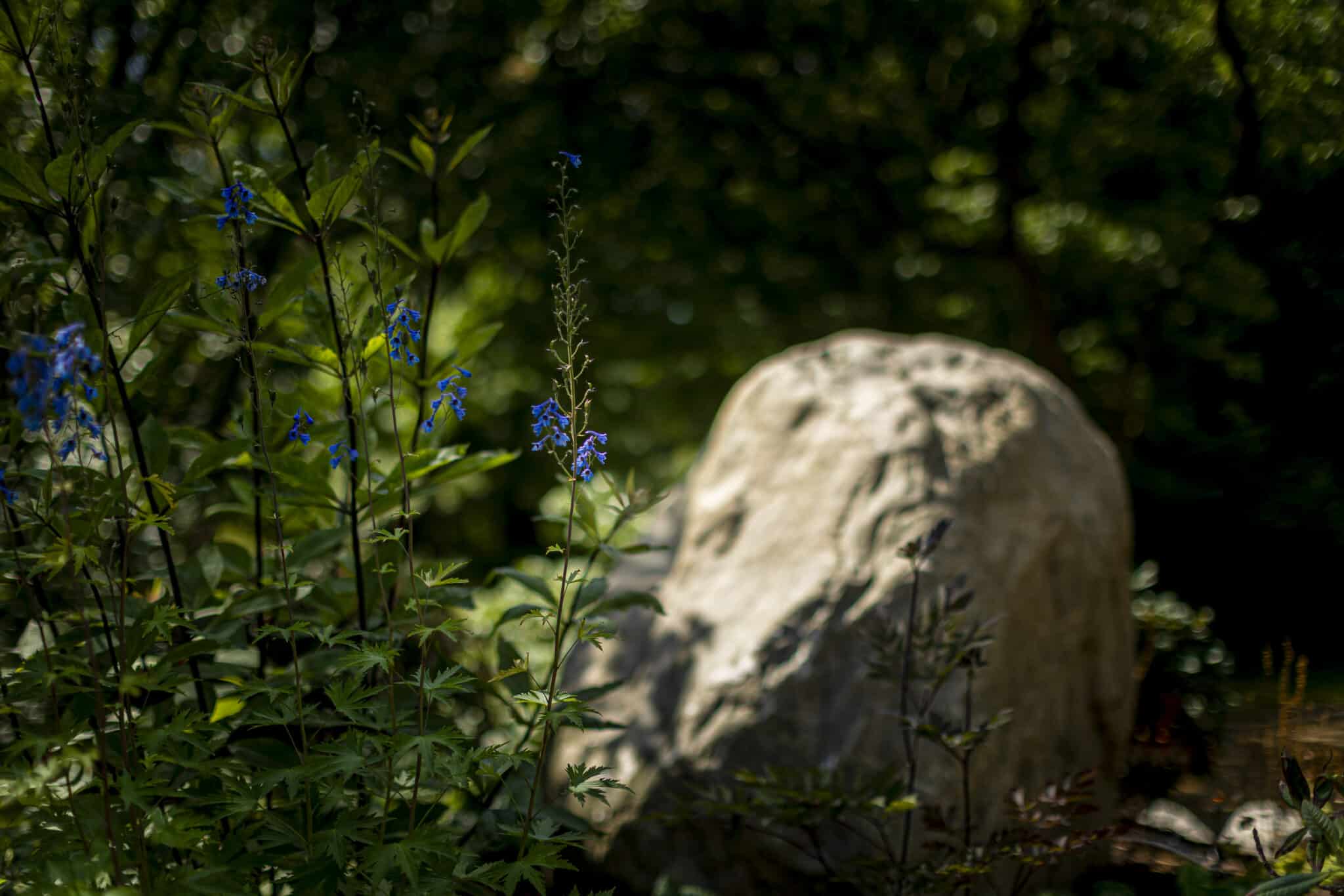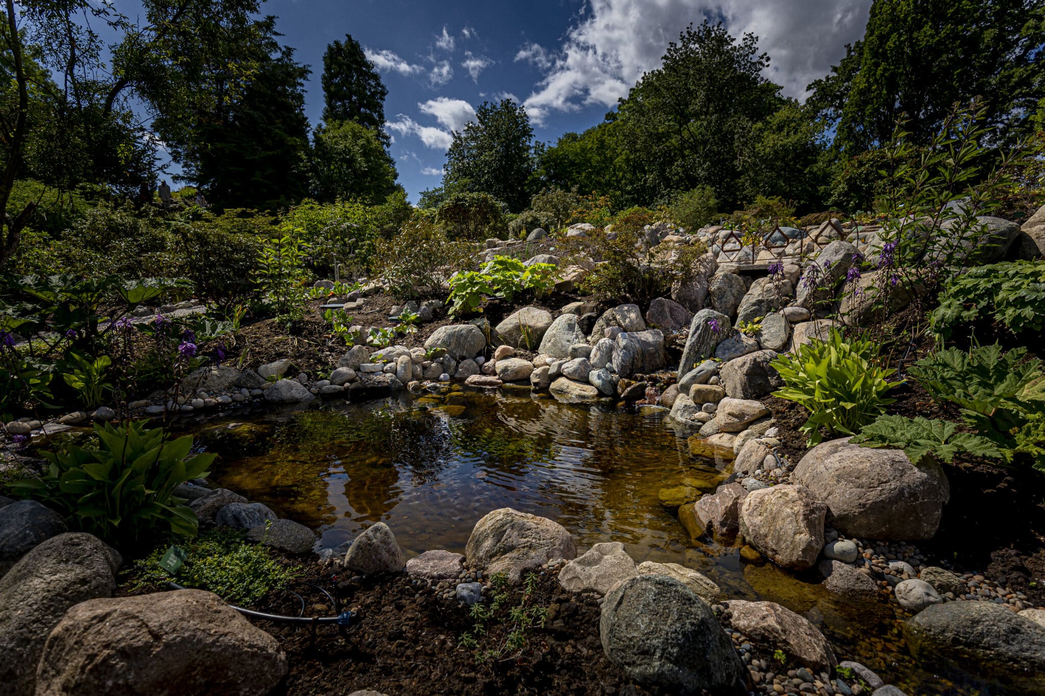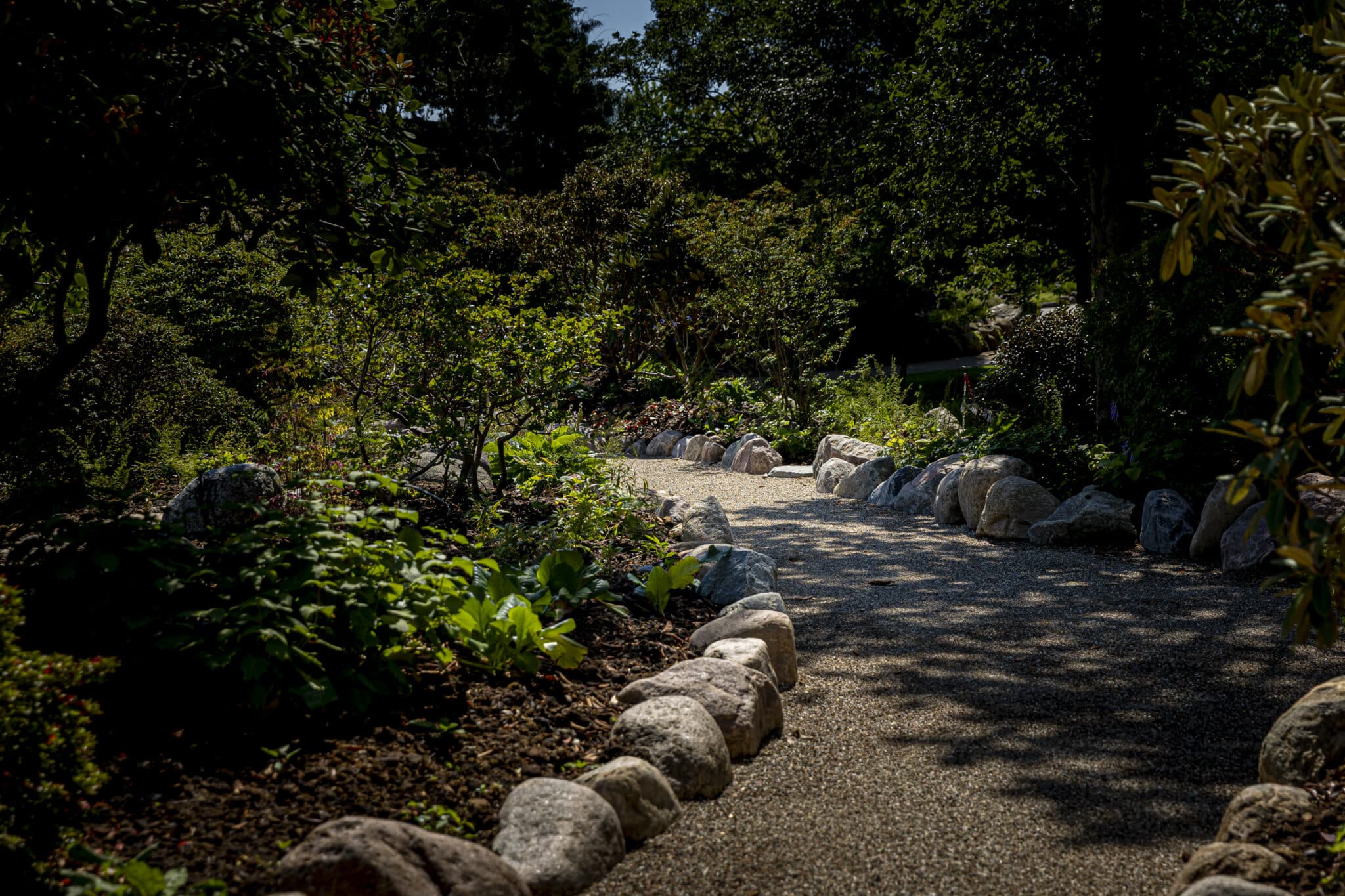 Surbundsplanter – især Rhododendron, Pieris og andre lyngfamilier – er plantet i et miljø skabt specifikt til dem, med veldrænet jord, skyggefugtige lommer, natursten og et levende, organisk bundmiljø.