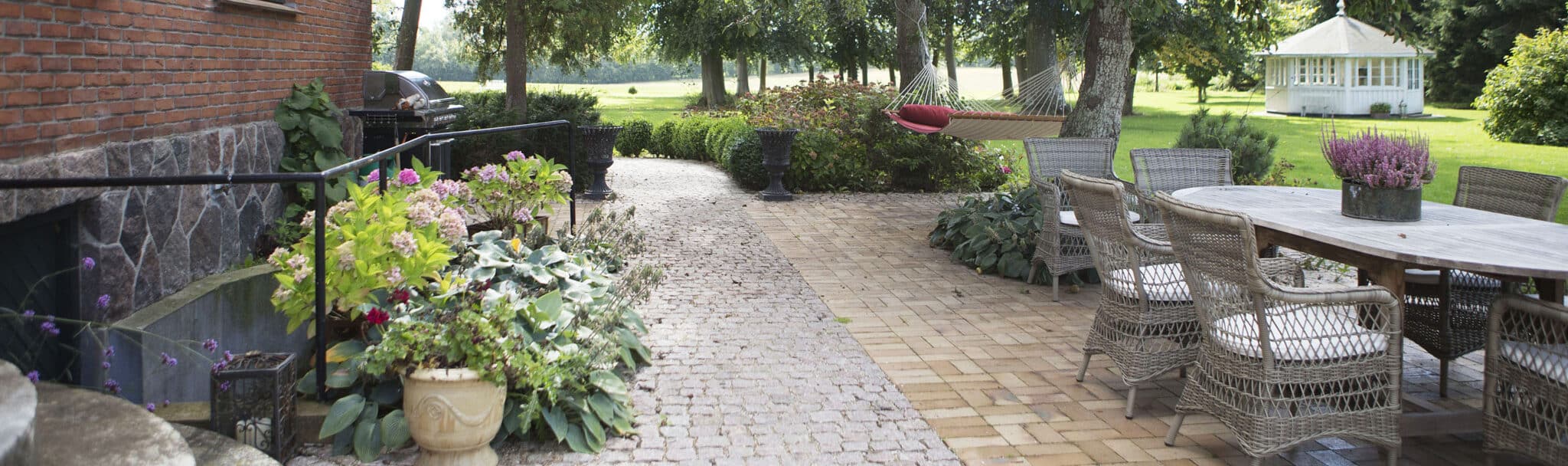 Beton er blevet populært igen i haverne, især belægninger med store fliser hitter. Vi arbejder med alle typer af forarbejdede betonsten til gangstier, indkørsler og parkingsområder mv.