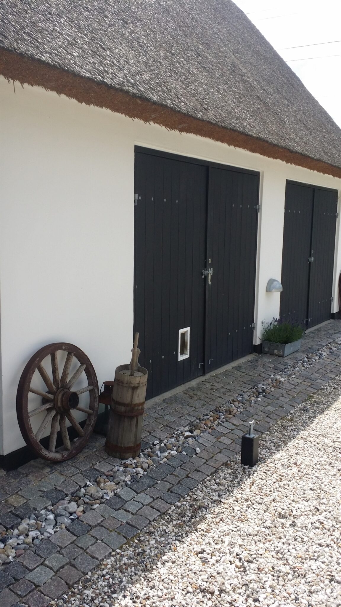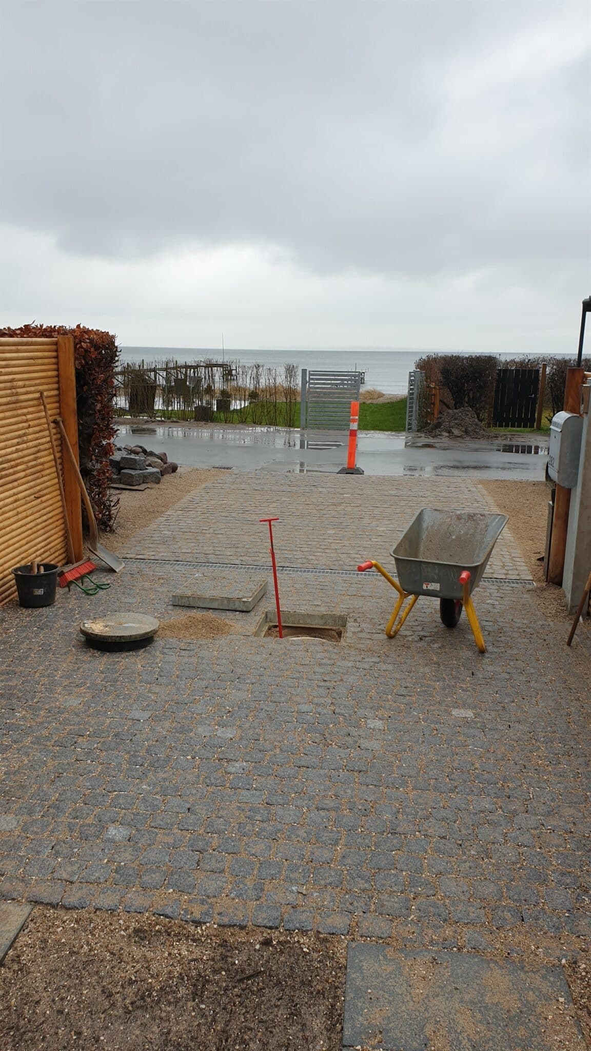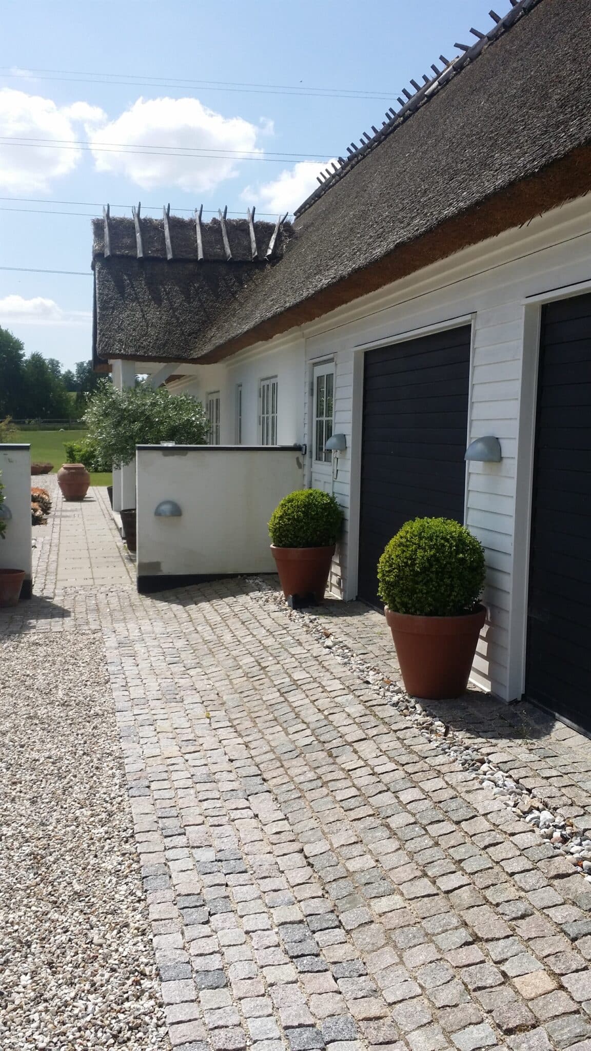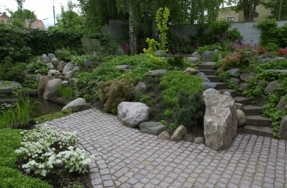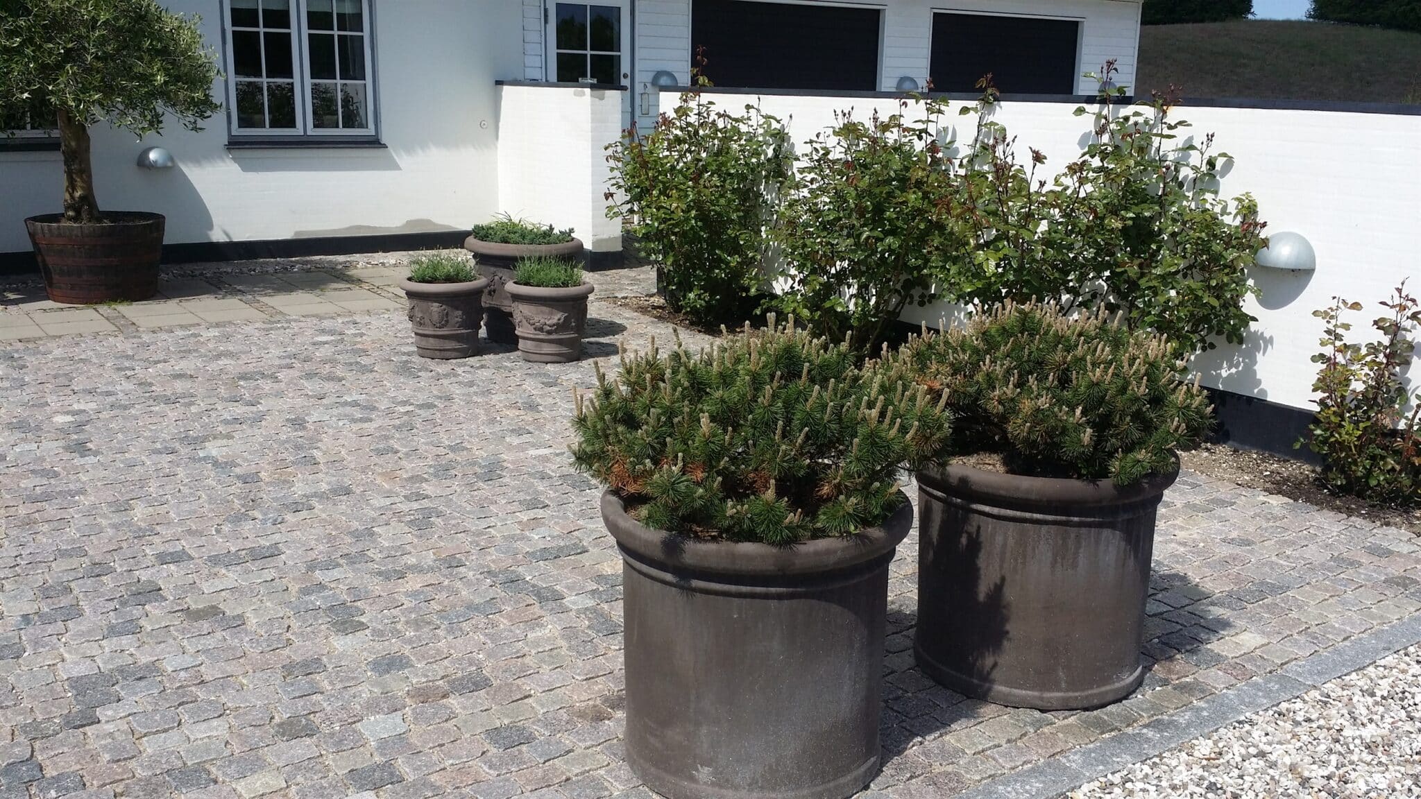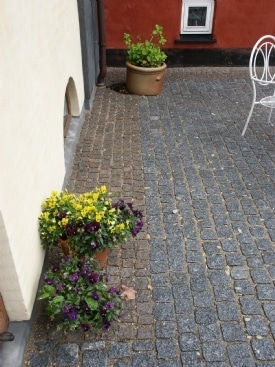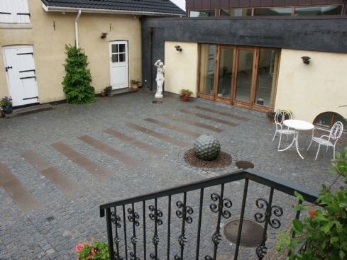 Her er mange kombinationsmuligheder, det kunne også være 4 mindre fliser lagt kvadratisk med en eller flere rækker af chaussestensbånd som i en københavner-belægning. Chaussestenen er mindre end brosten.