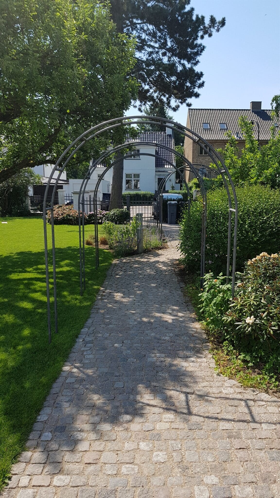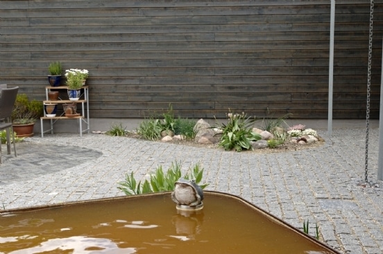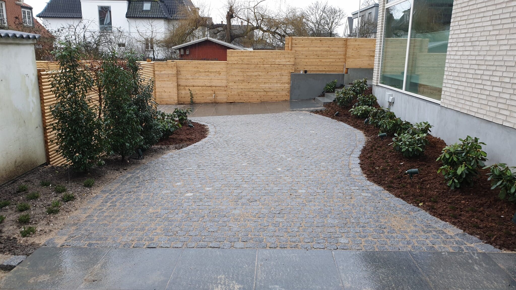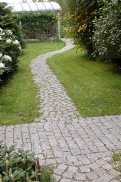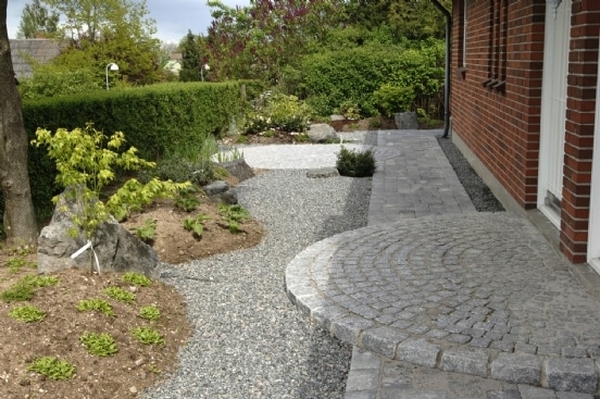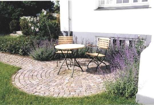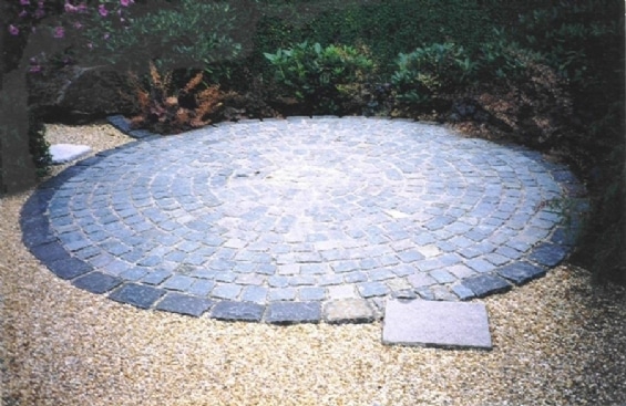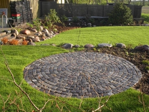 En cirkulær terrasse i haven kan blive meget smuk. Chaussesten kombineres ofte med betonfliser i en københavnerbelægning hvor bånd af chaussestene omkranser fliserne
