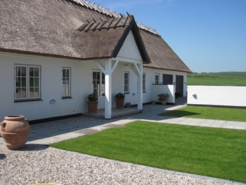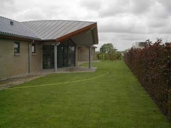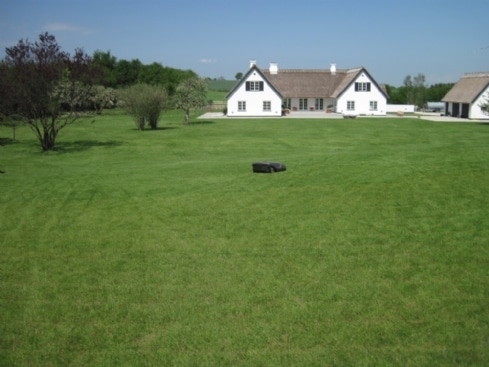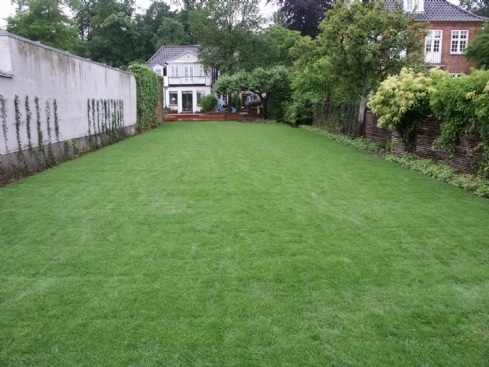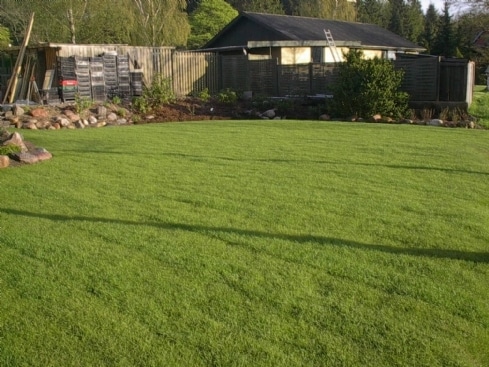 Ny udlagt græsplæne med rullegræs, bemærk færdighækken
