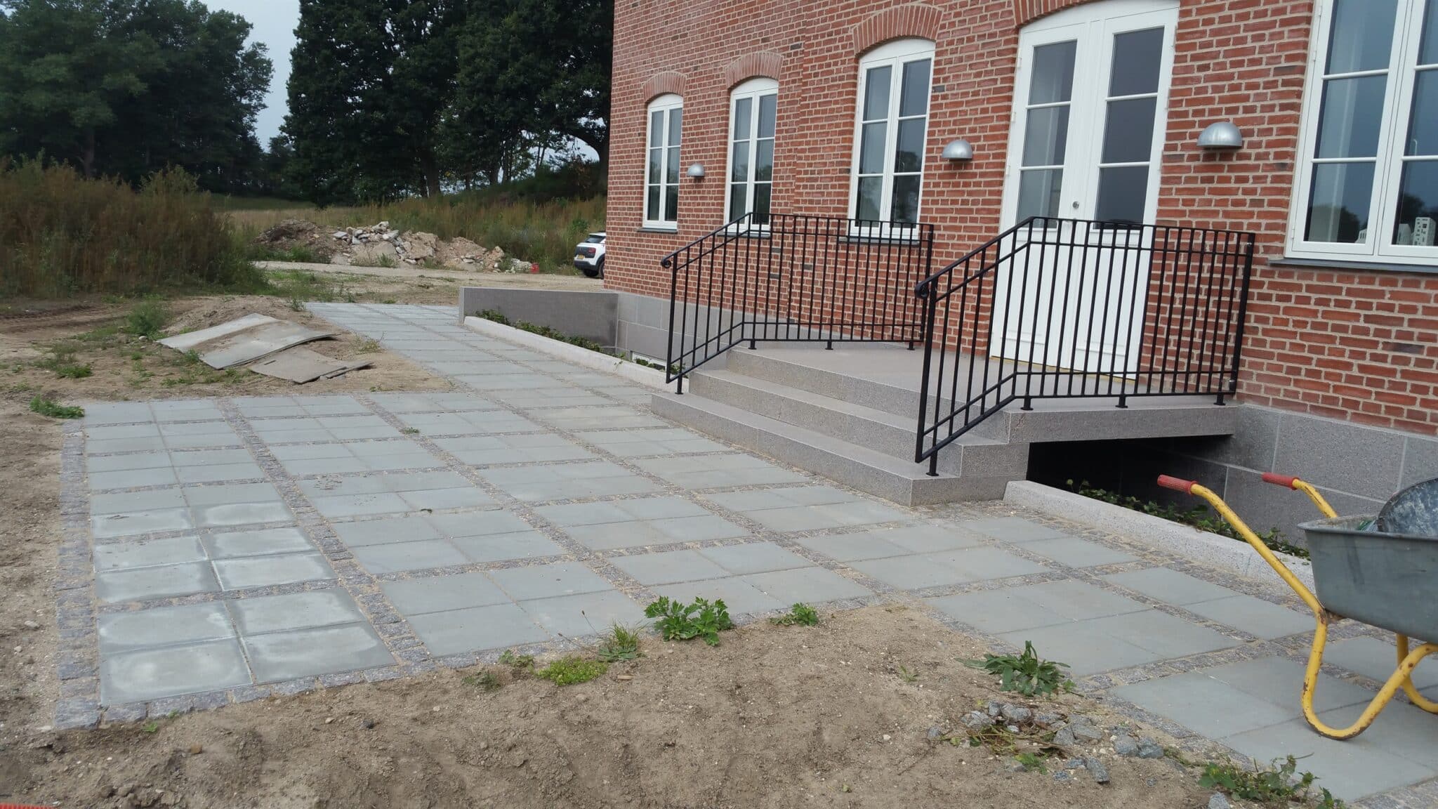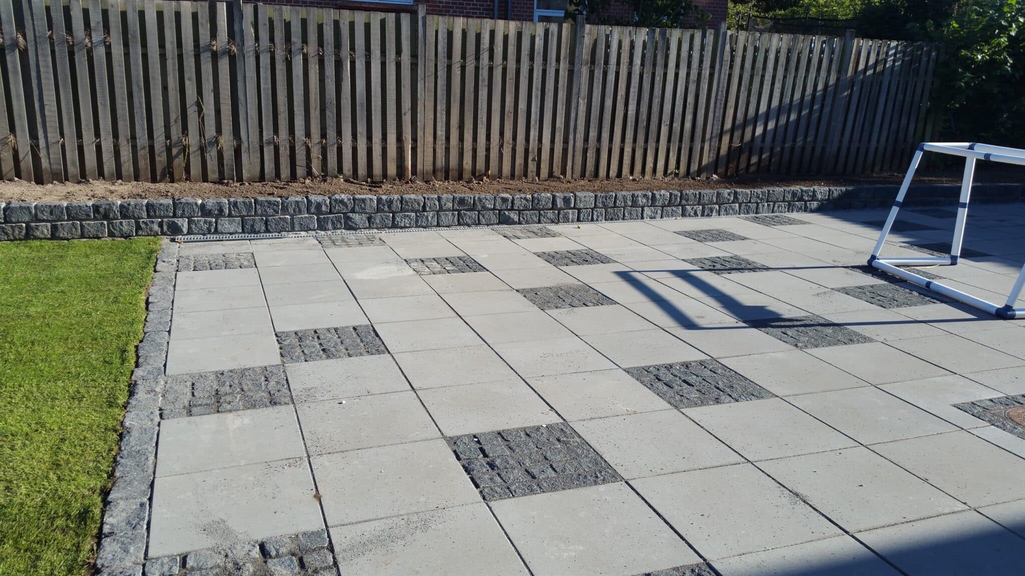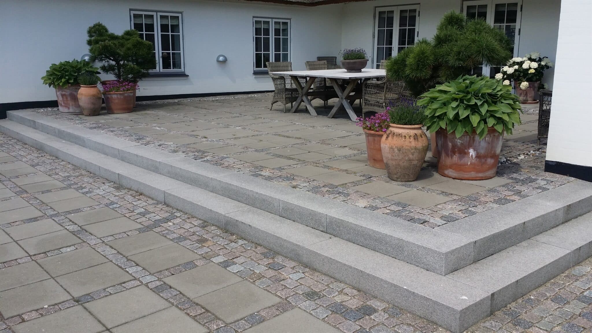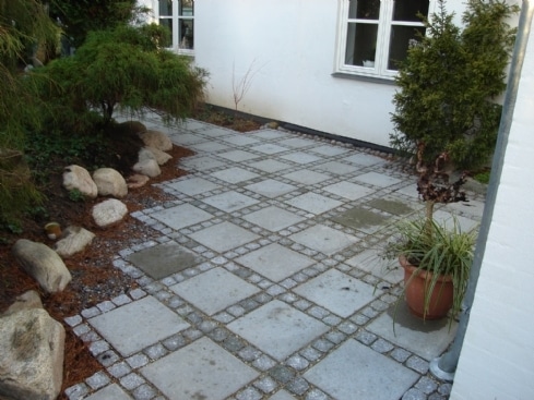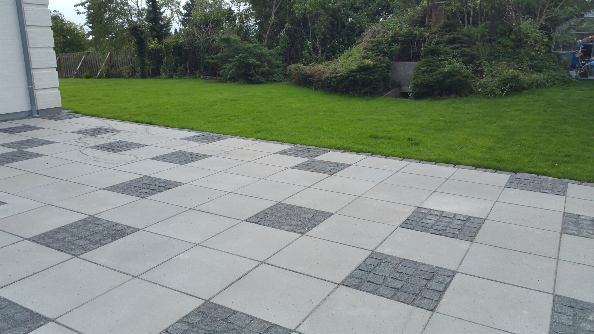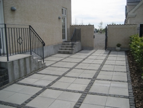 Kombination af store betonfliser 90x90 cm med Sorte granitelementer imellem - Stilfuldt!