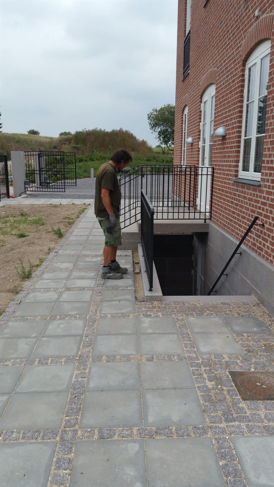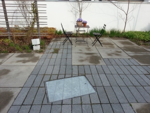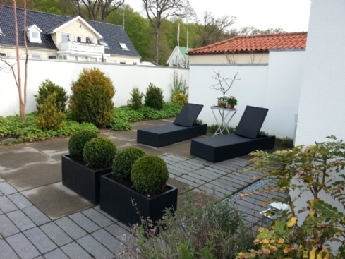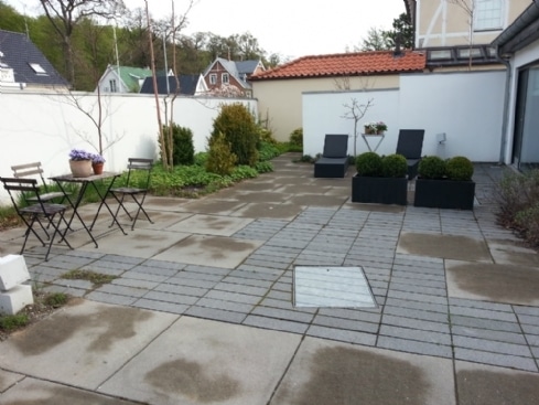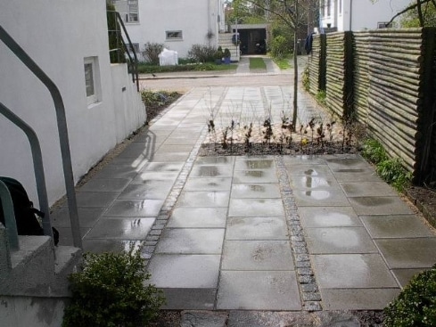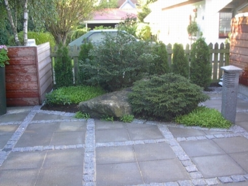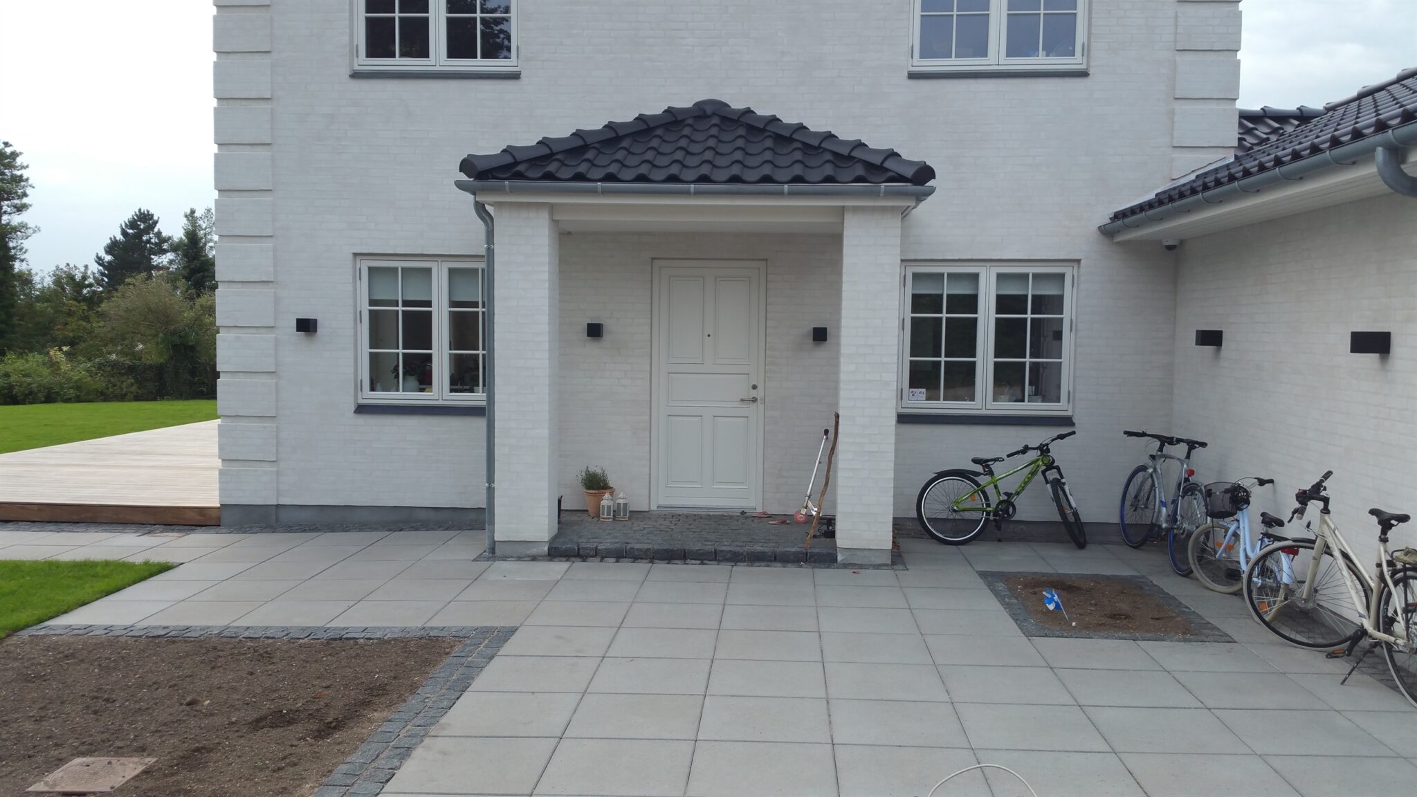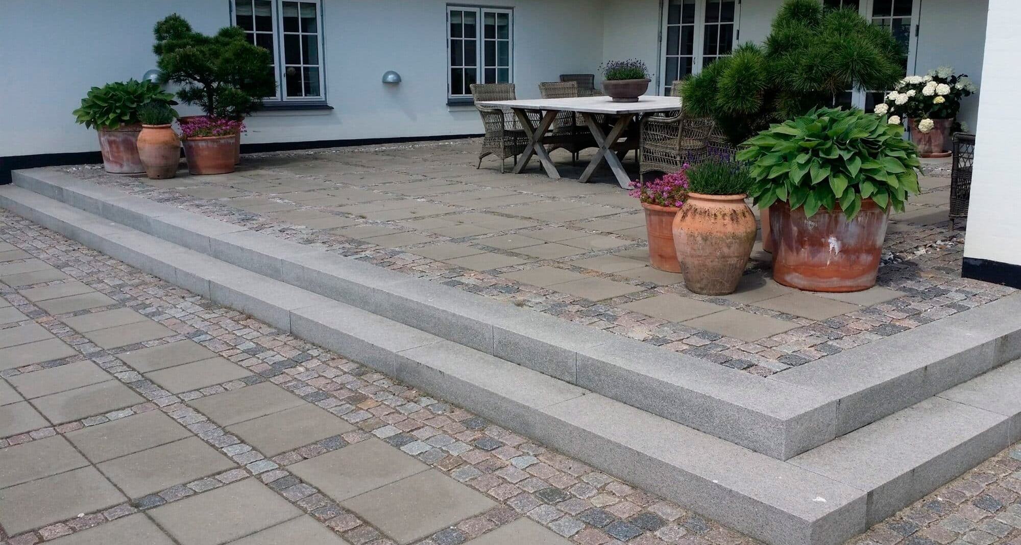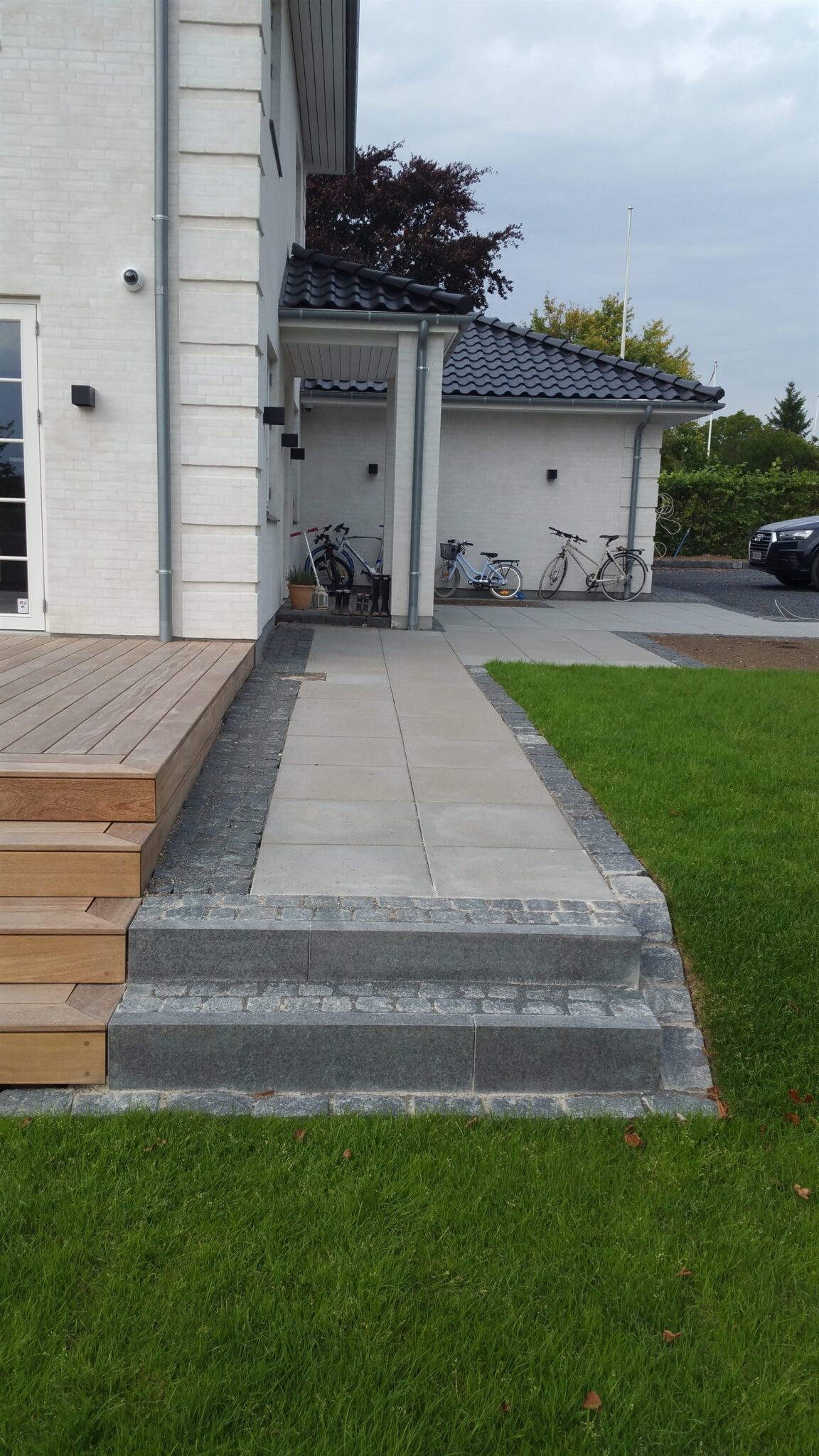 Kombination af store betonfliser 90x90 cm med Sorte granitelementer imellem - Stilfuldt!