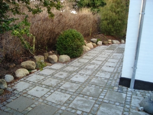 Københavnerbelægning med 40x40x5 cm med chaussestenbånd