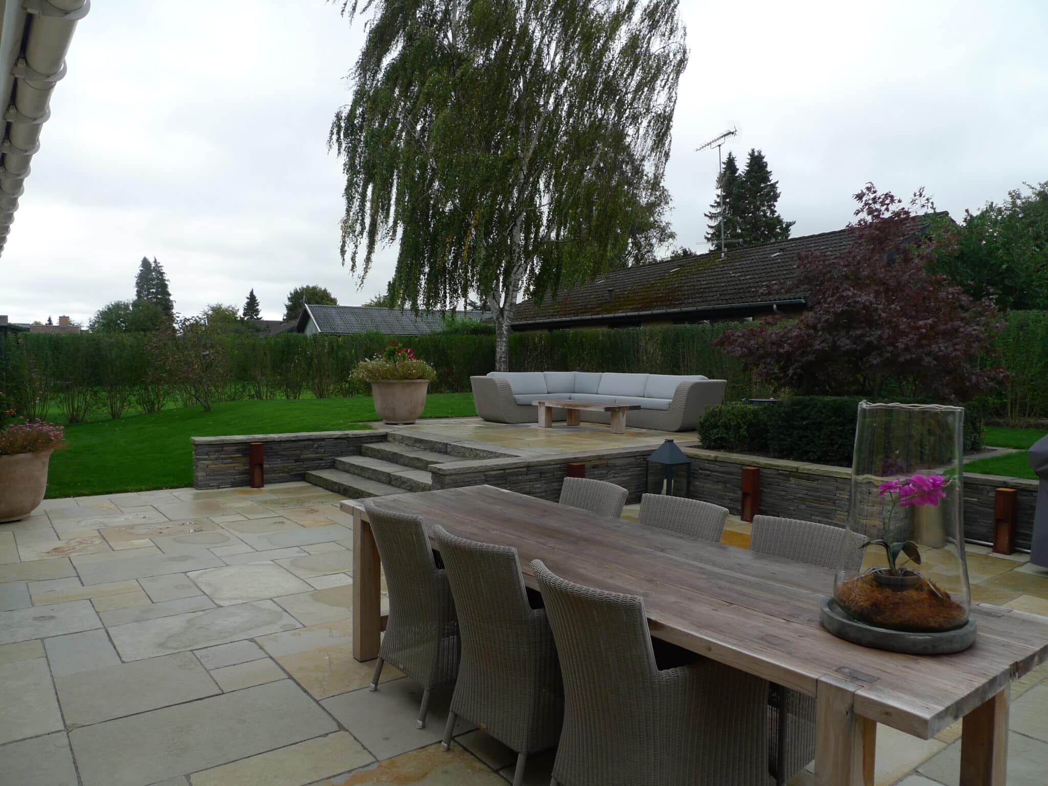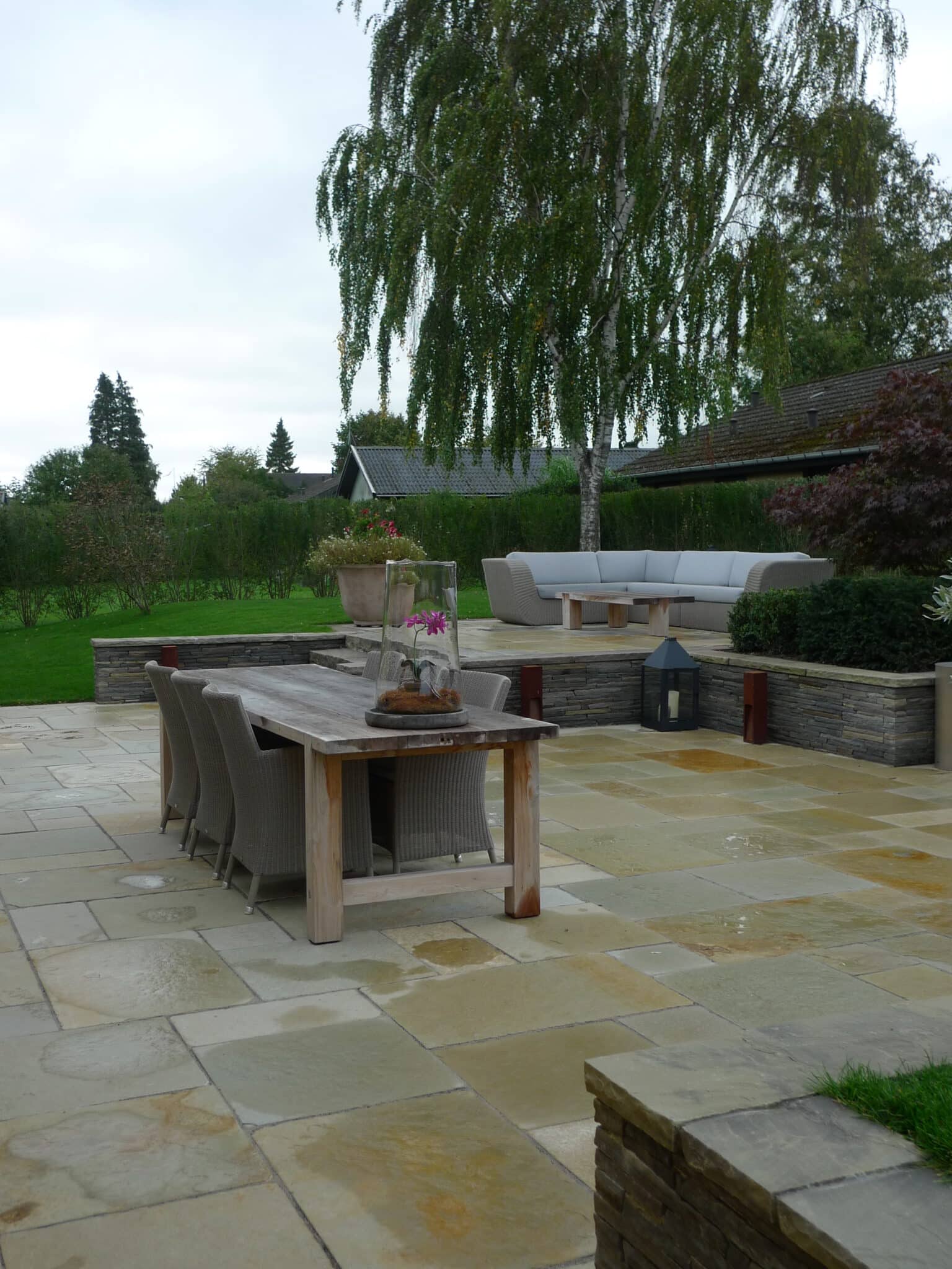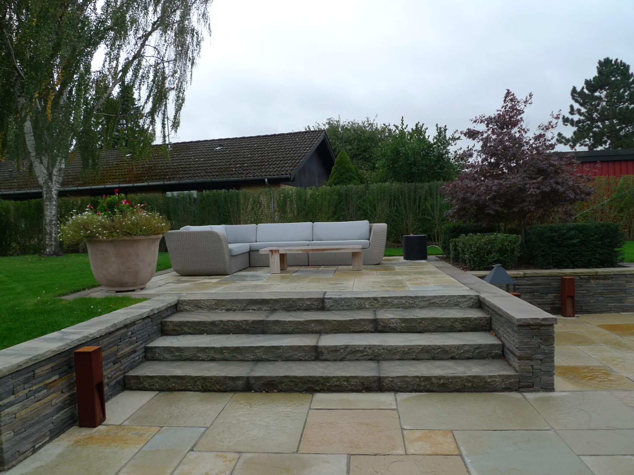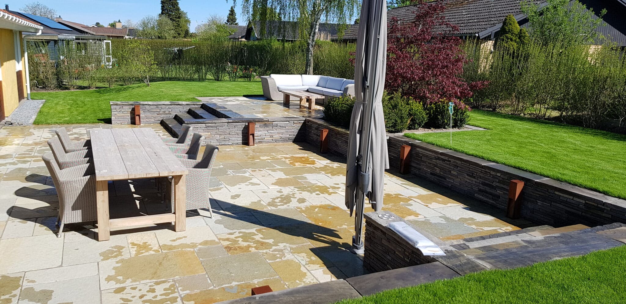 Målet var at skabe en funktionel og harmonisk have, hvor natursten, terrasser og grønne rum bindes sammen i en helstøbt helhed.