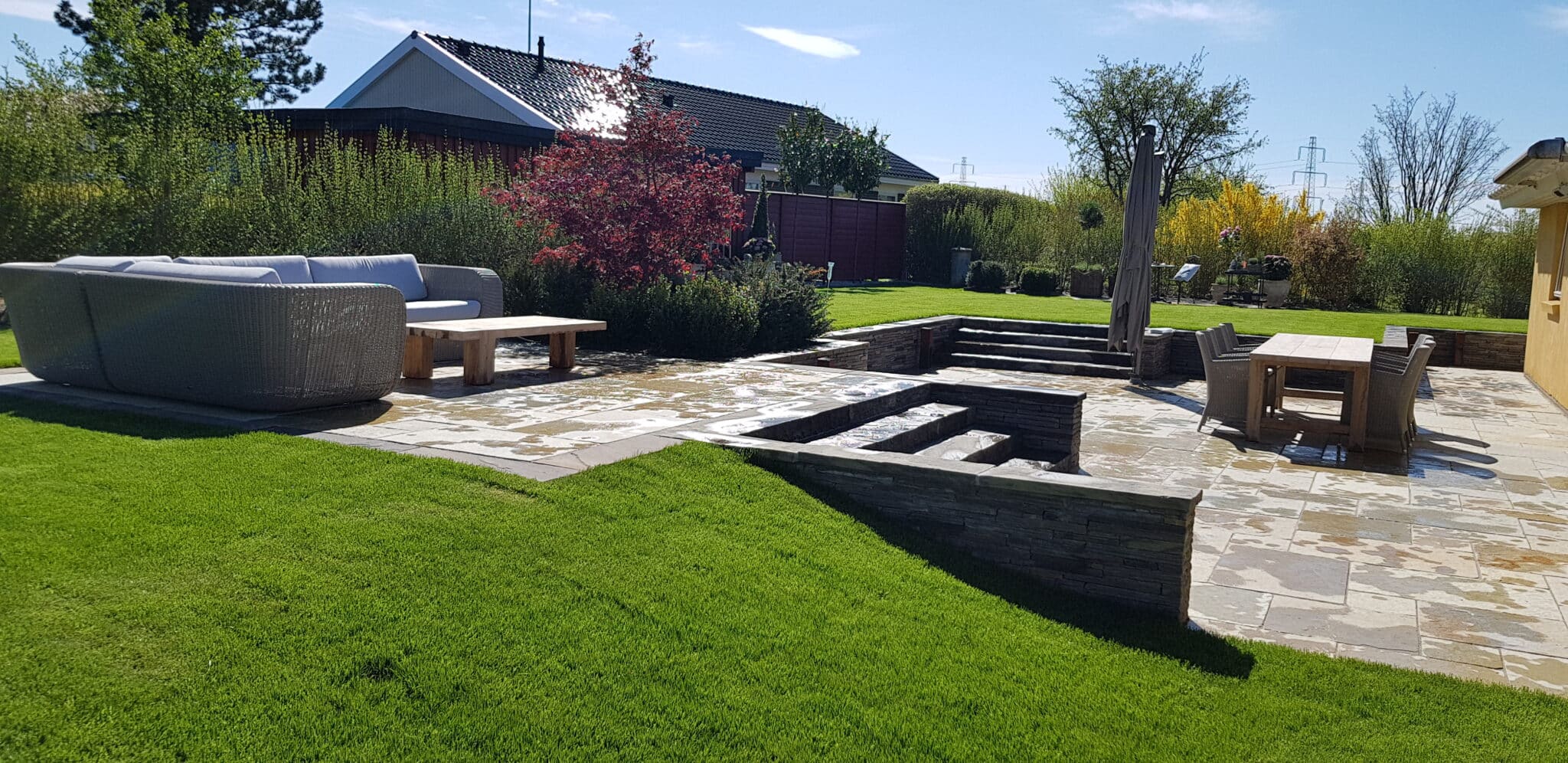 Designet er skabt af RoomOutside.dk, mens Junckerhaven har stået for anlæg og udførelse. Resultatet er en helstøbt og nutidig have, hvor Columbus Sandstone og frodig beplantning går hånd i hånd.