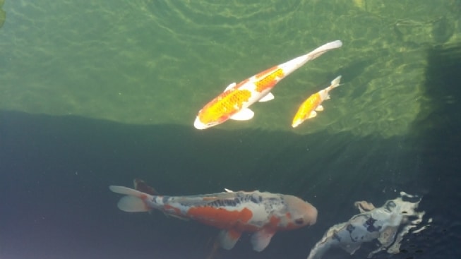 Guldfisk, common med kort hale eller Guldfisk, Comet med lange finner, Sarasa, som er rød og hvid.