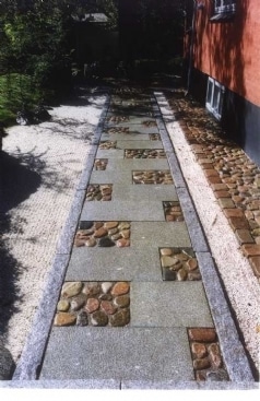 Pigsten anvendes som små udvalgte håndsten i granit Stenene sættes på kant for at sikre stabiliteten.