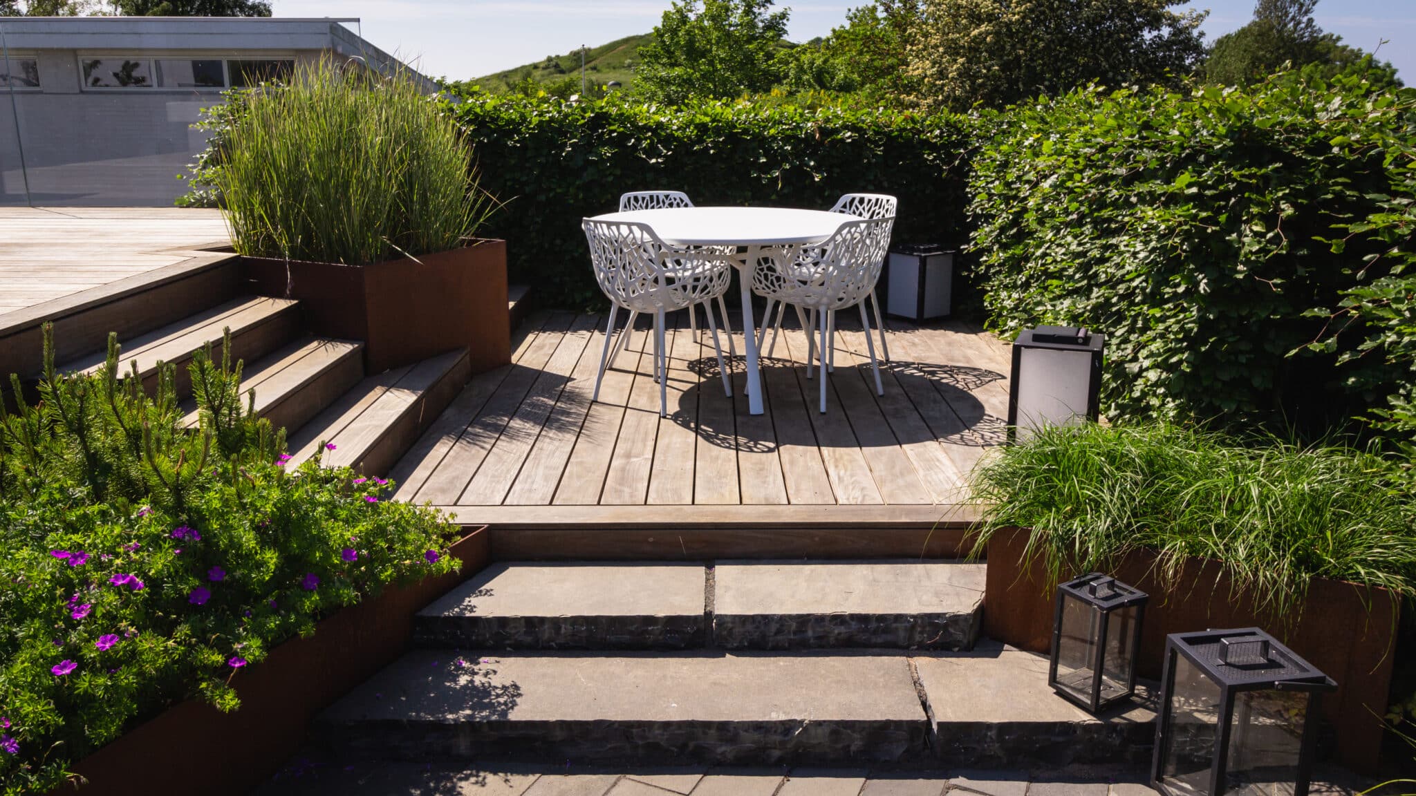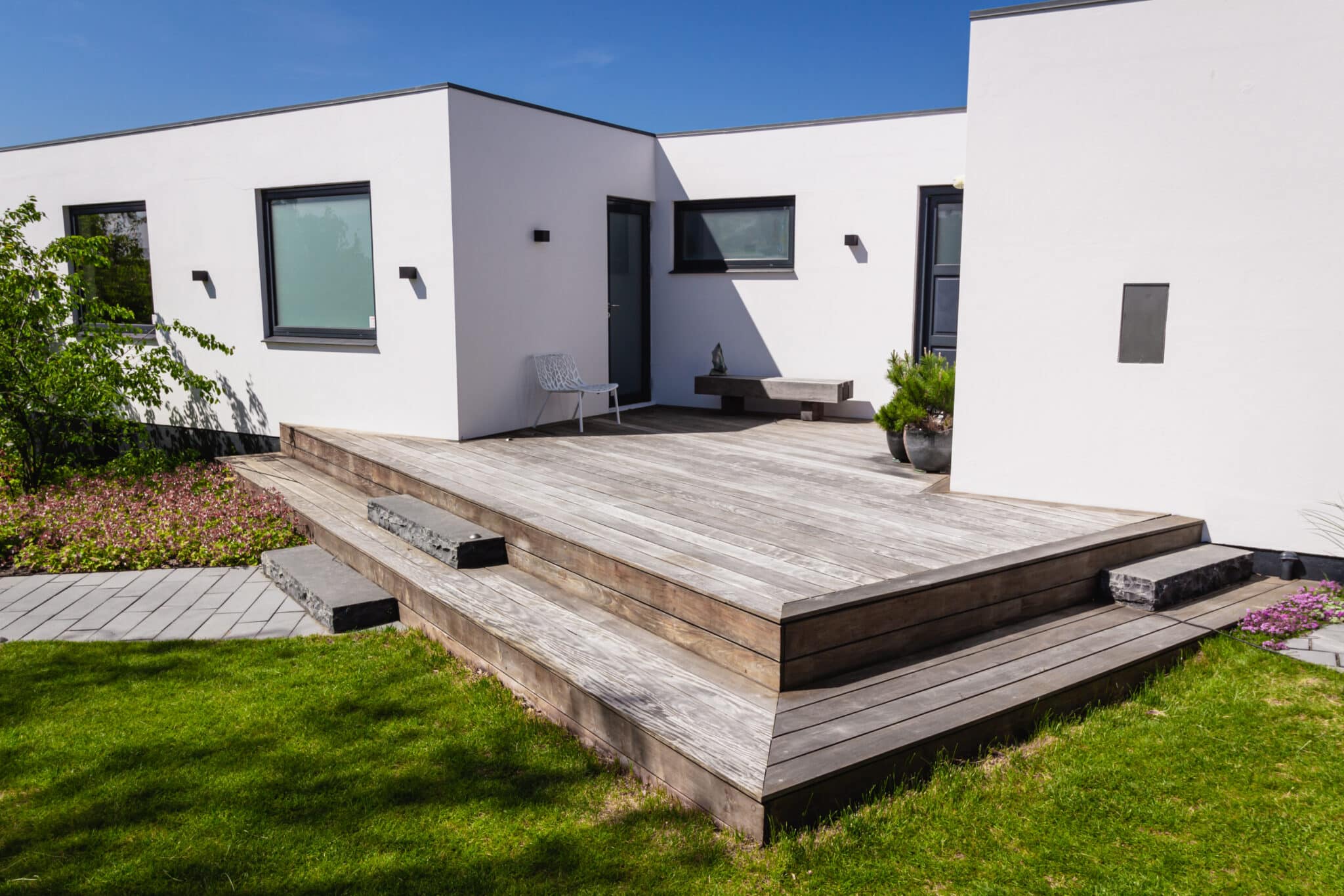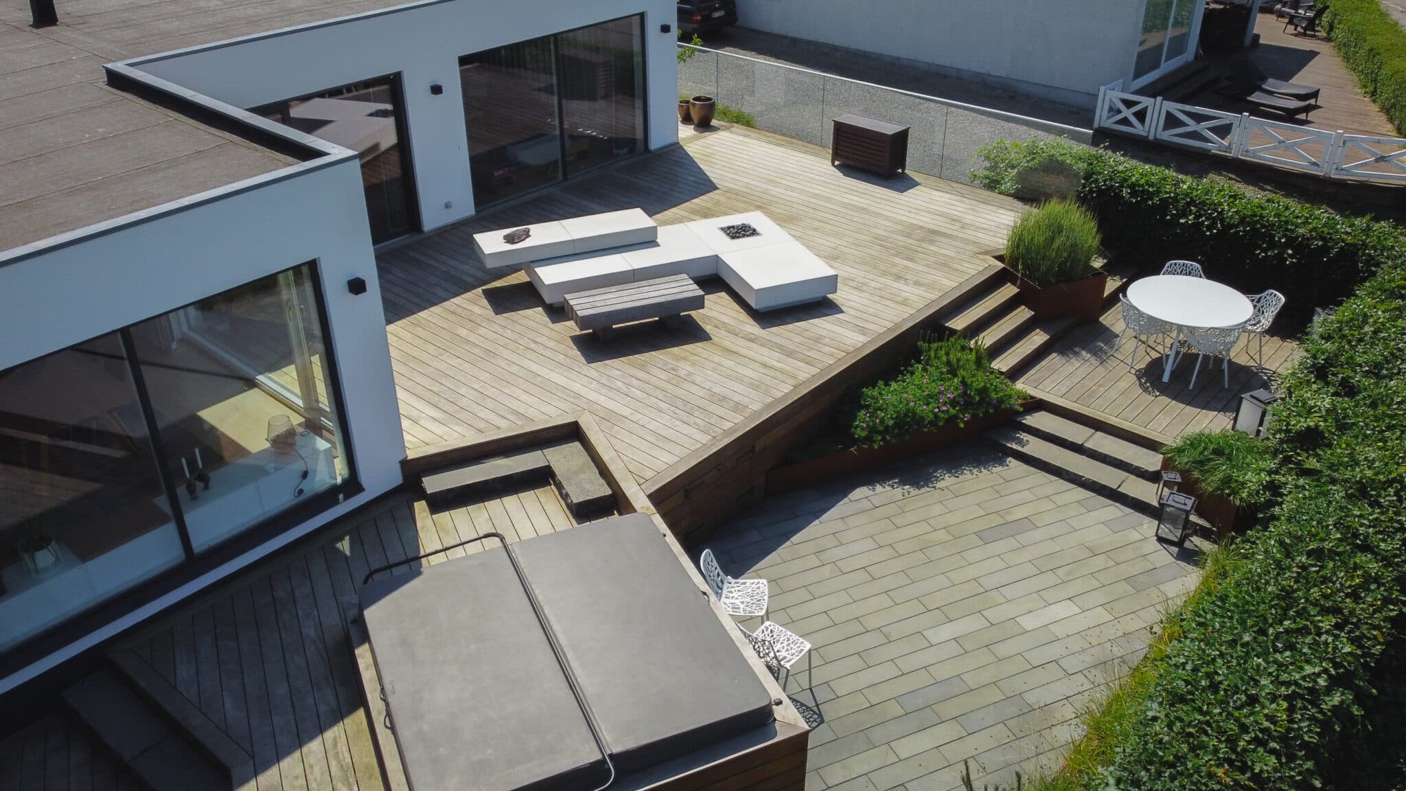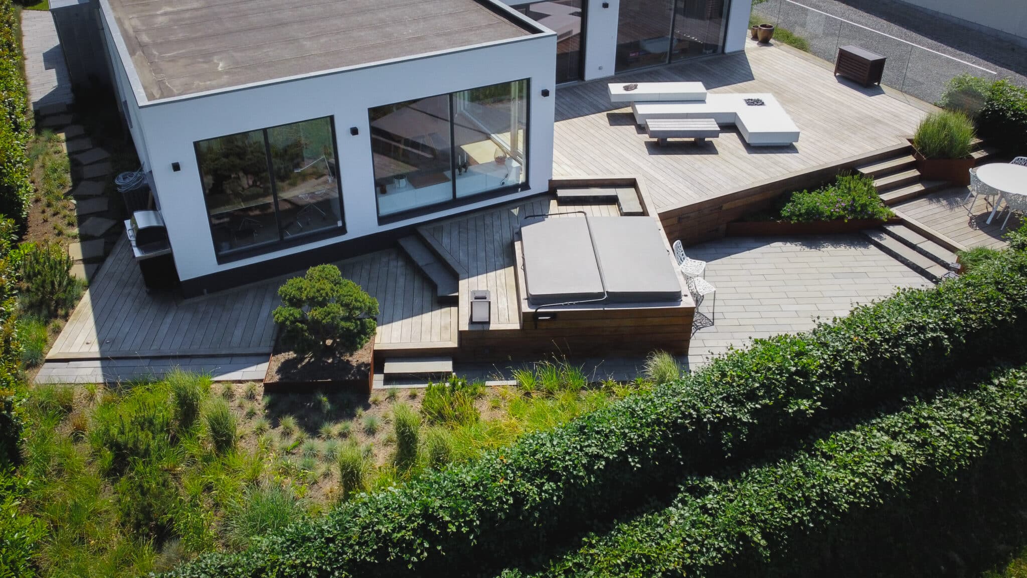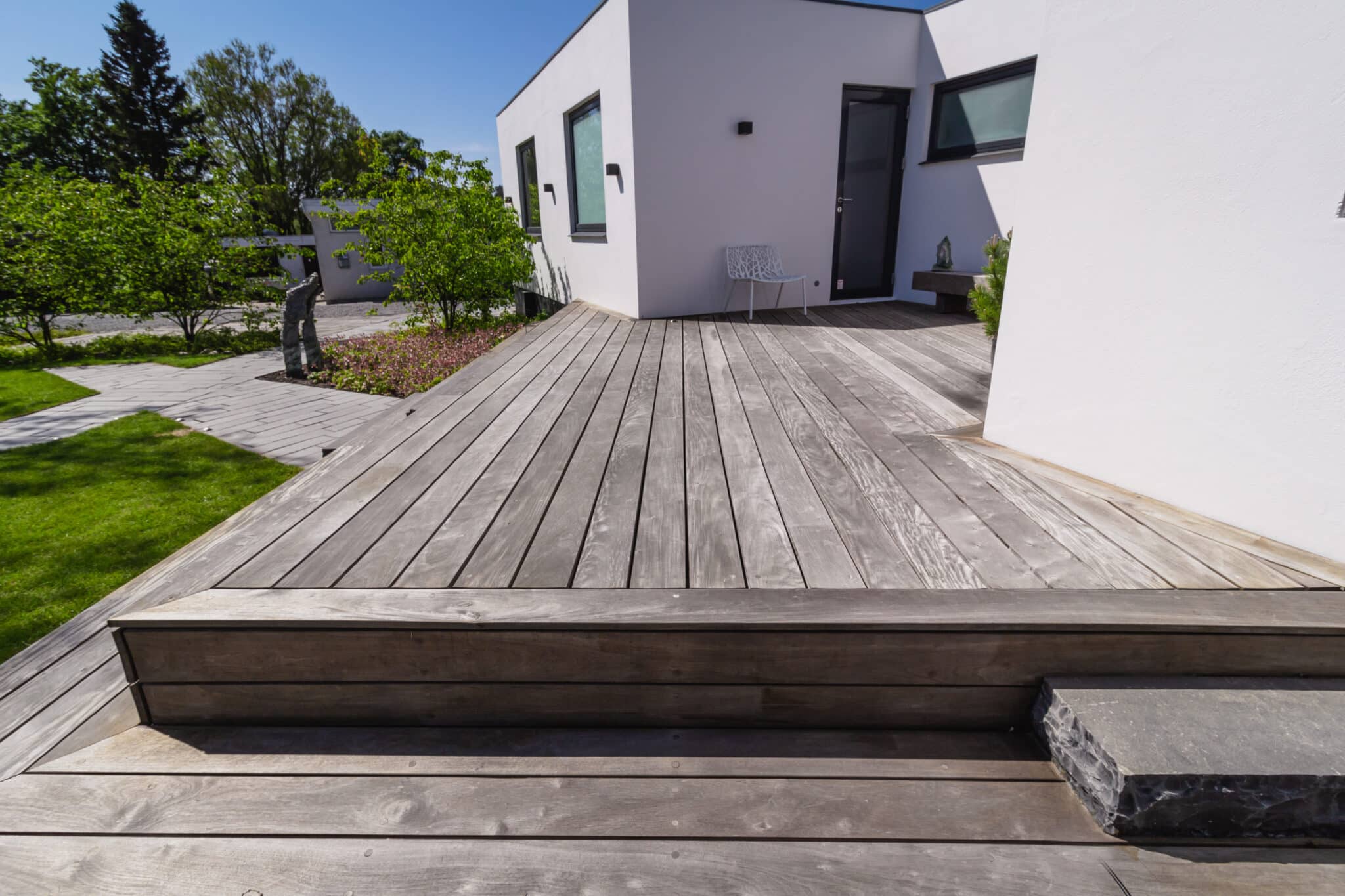 Langs huset og mod havesiden er der etableret træterrasser, som skaber varme og kontrast til de mørke stenmaterialer. Hegn og afskærmning giver privatliv og definerer havens rum.