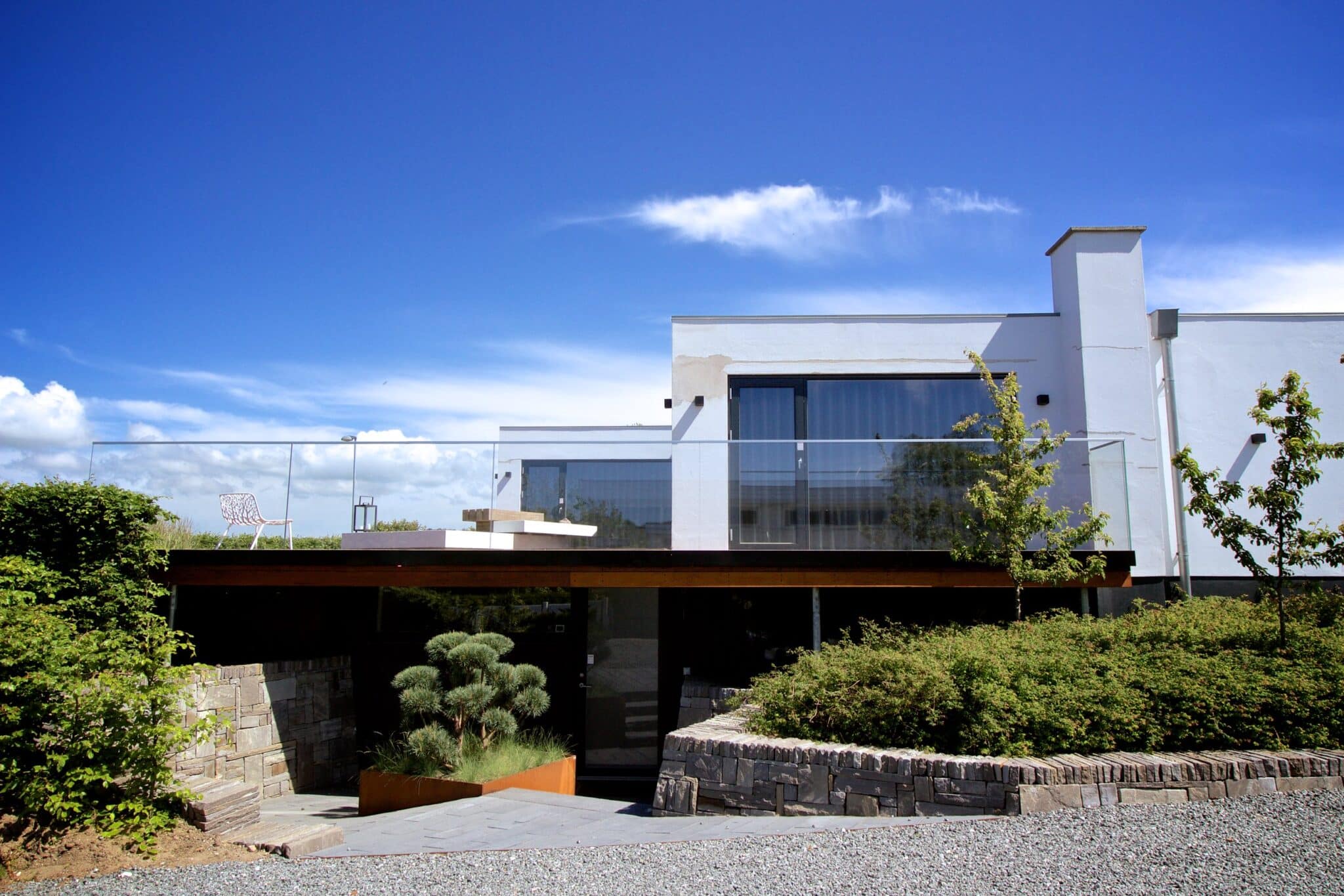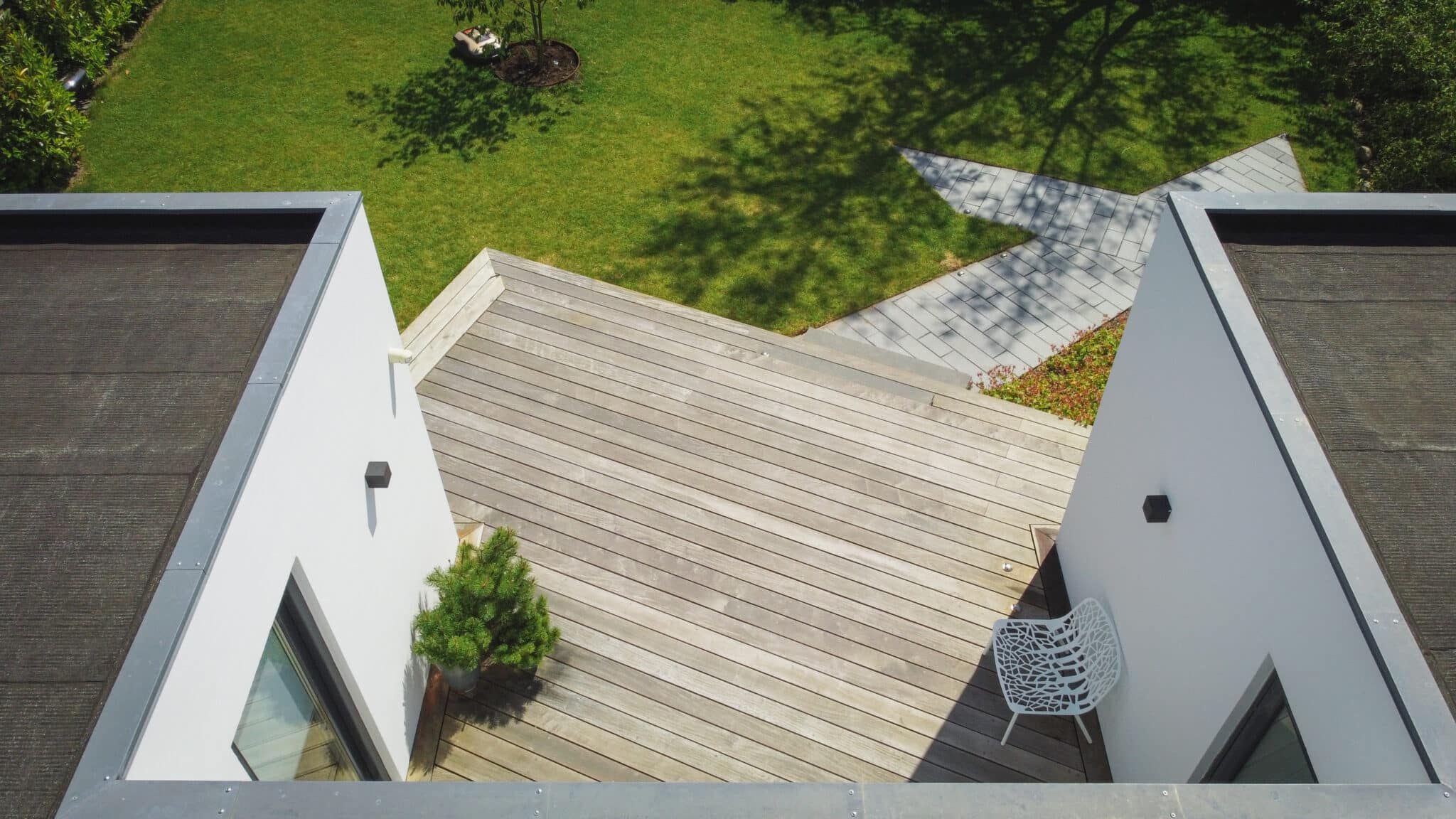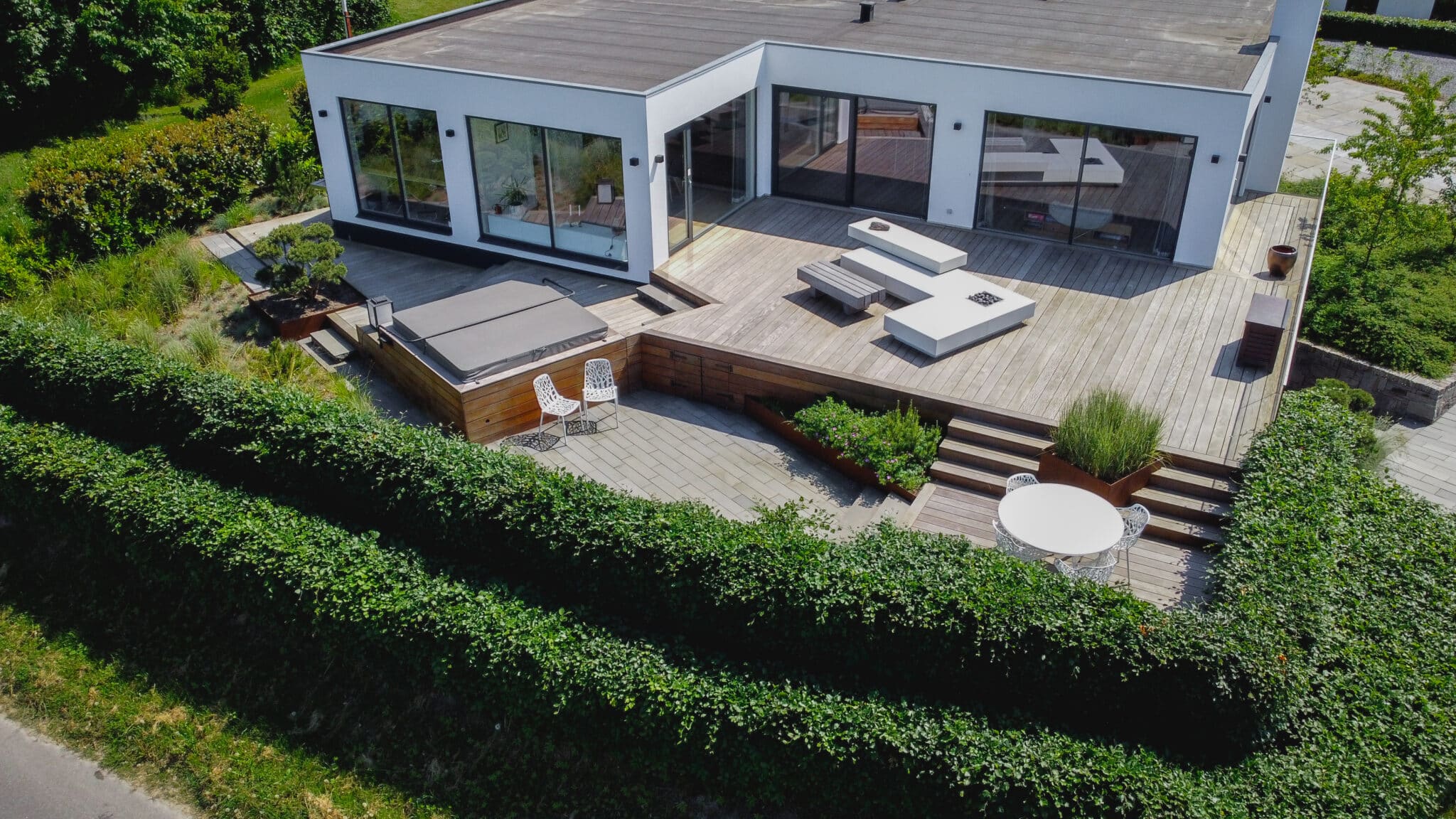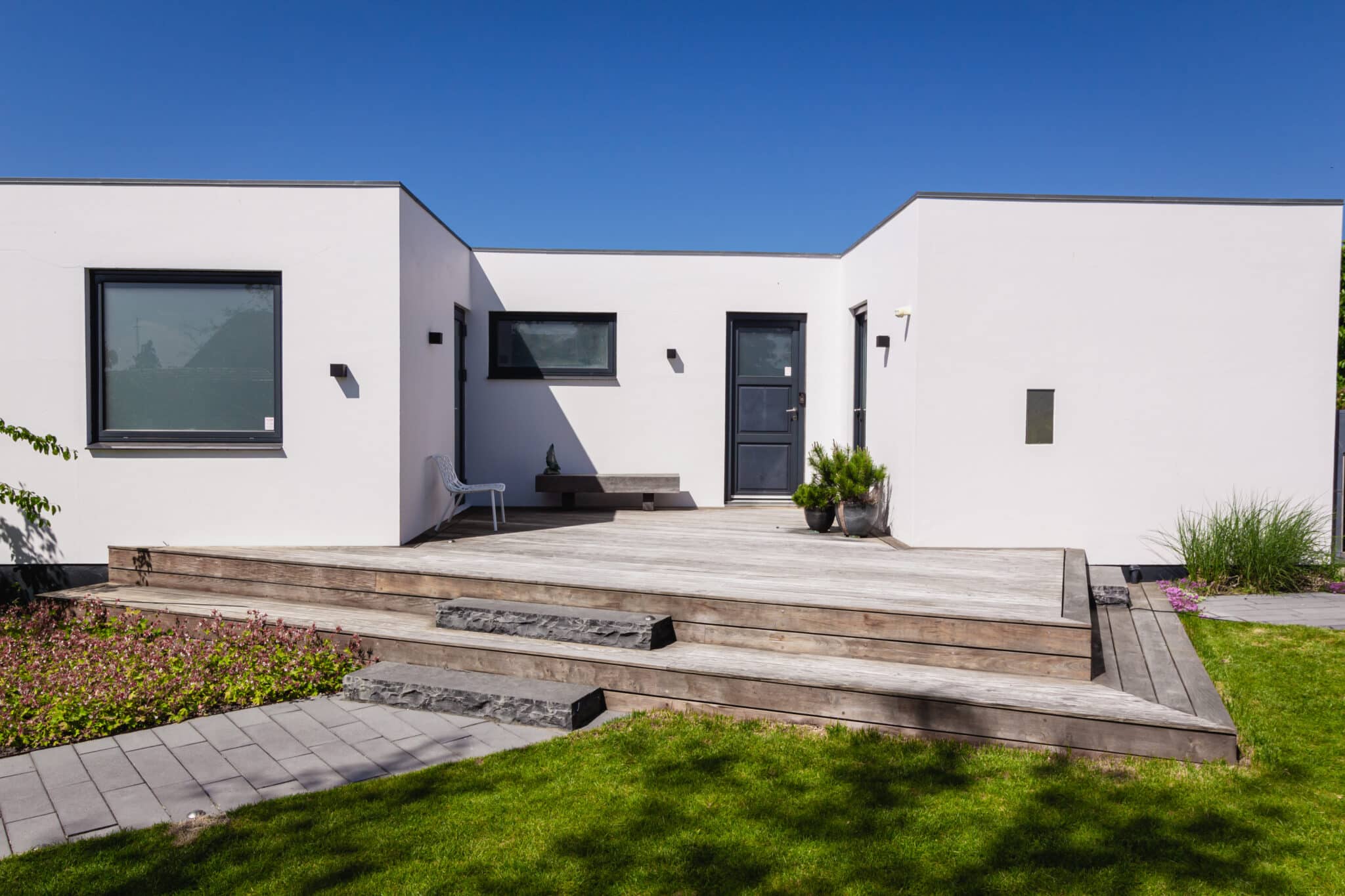 Langs huset og mod havesiden er der etableret træterrasser, som skaber varme og kontrast til de mørke stenmaterialer. Hegn og afskærmning giver privatliv og definerer havens rum.