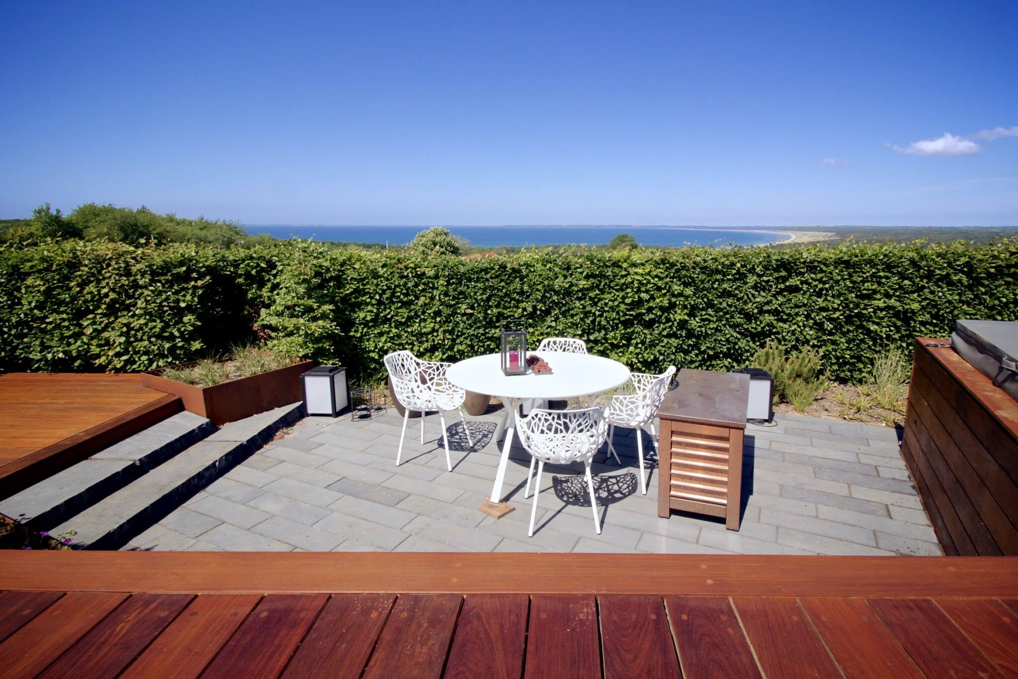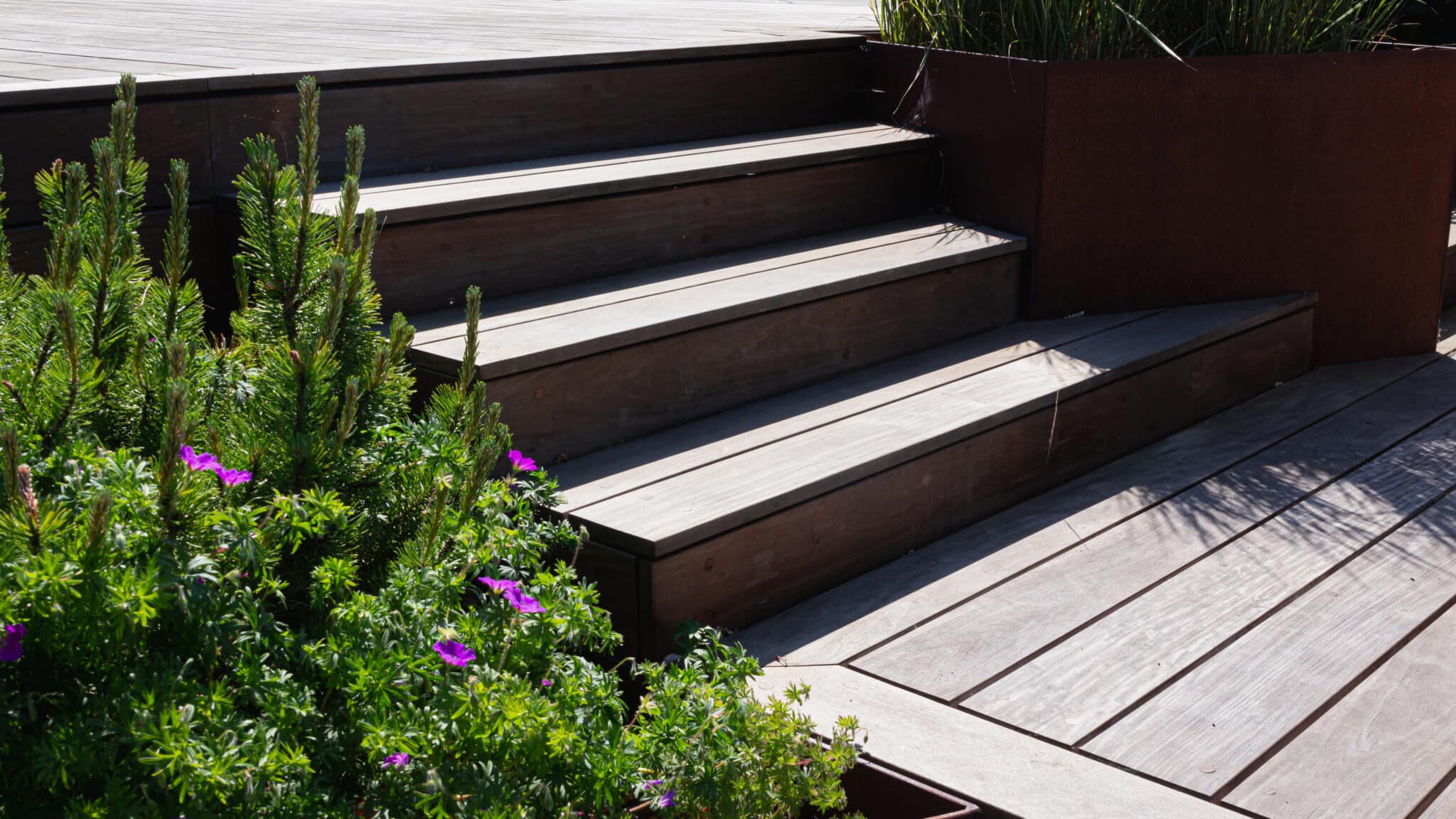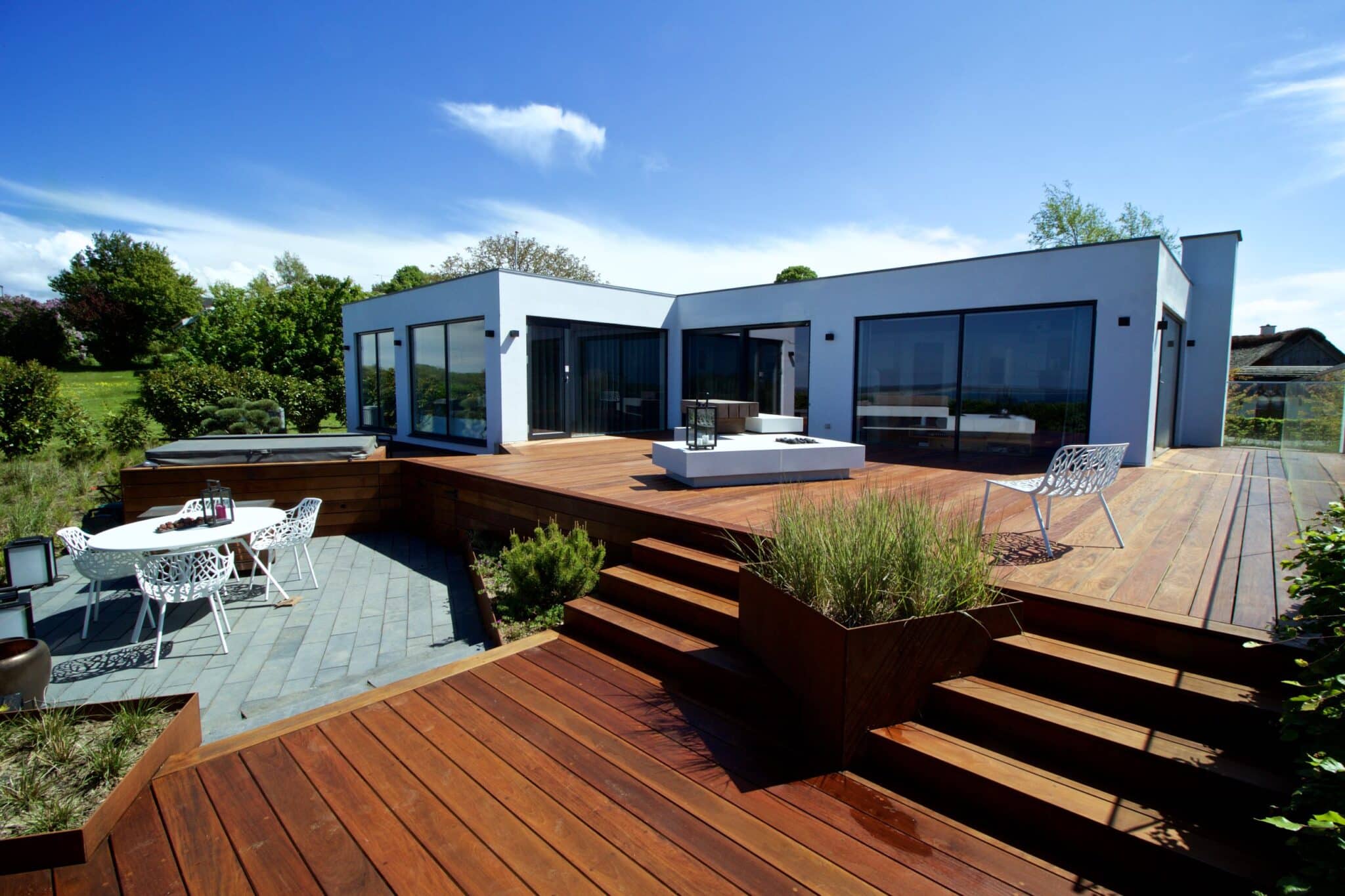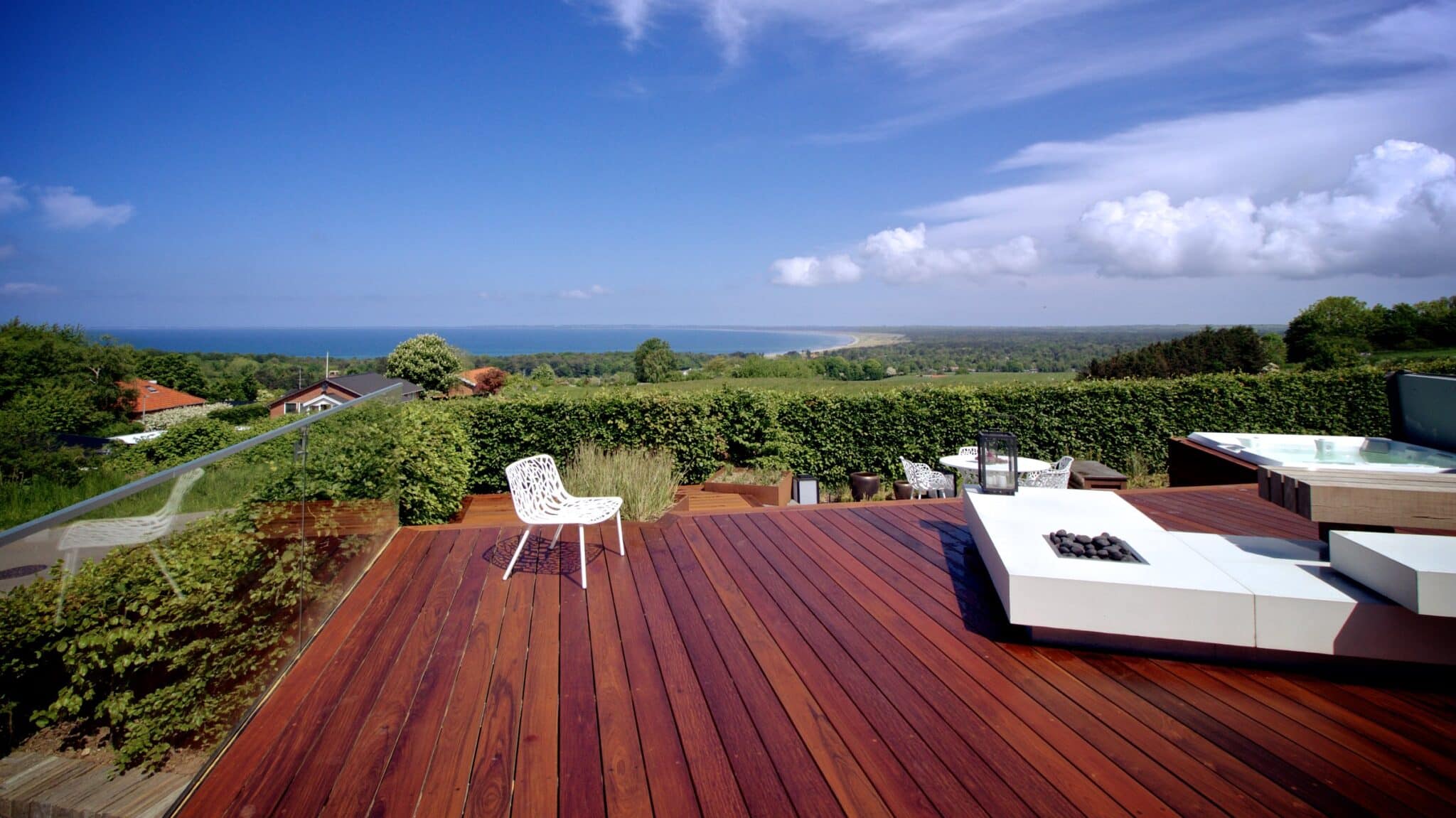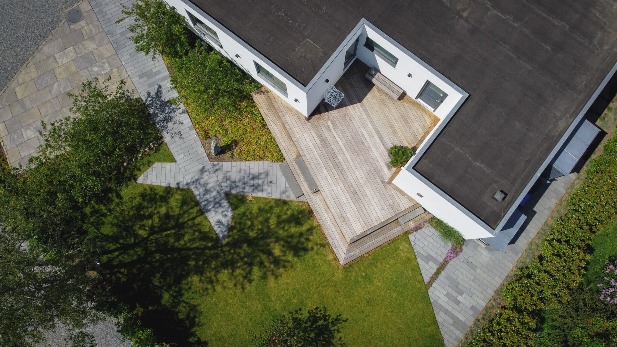 Langs huset og mod havesiden er der etableret træterrasser, som skaber varme og kontrast til de mørke stenmaterialer. Hegn og afskærmning giver privatliv og definerer havens rum.