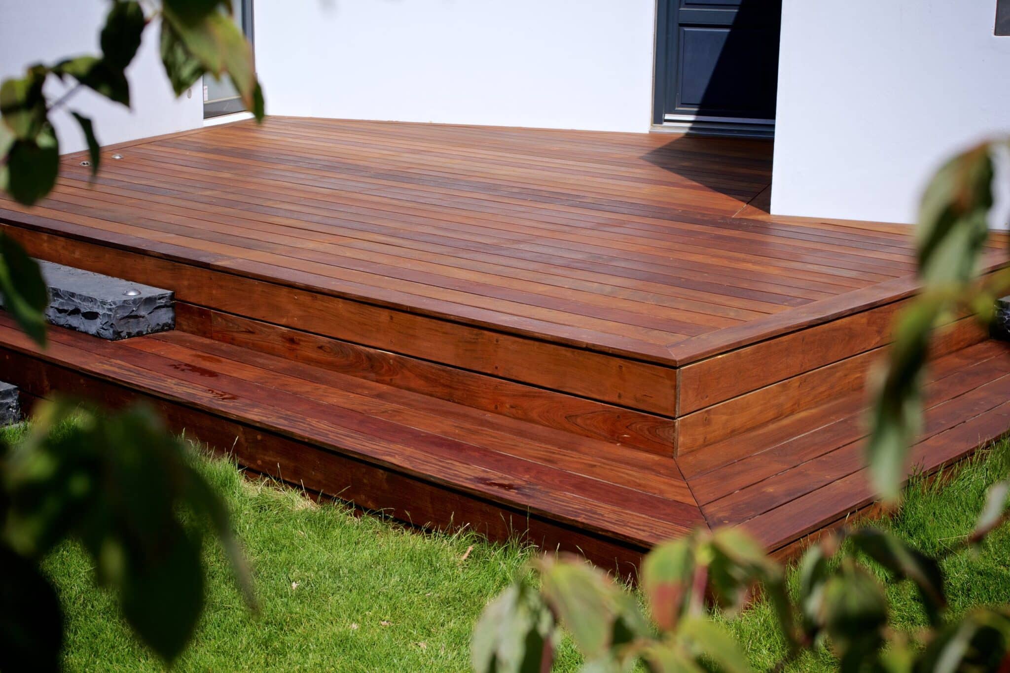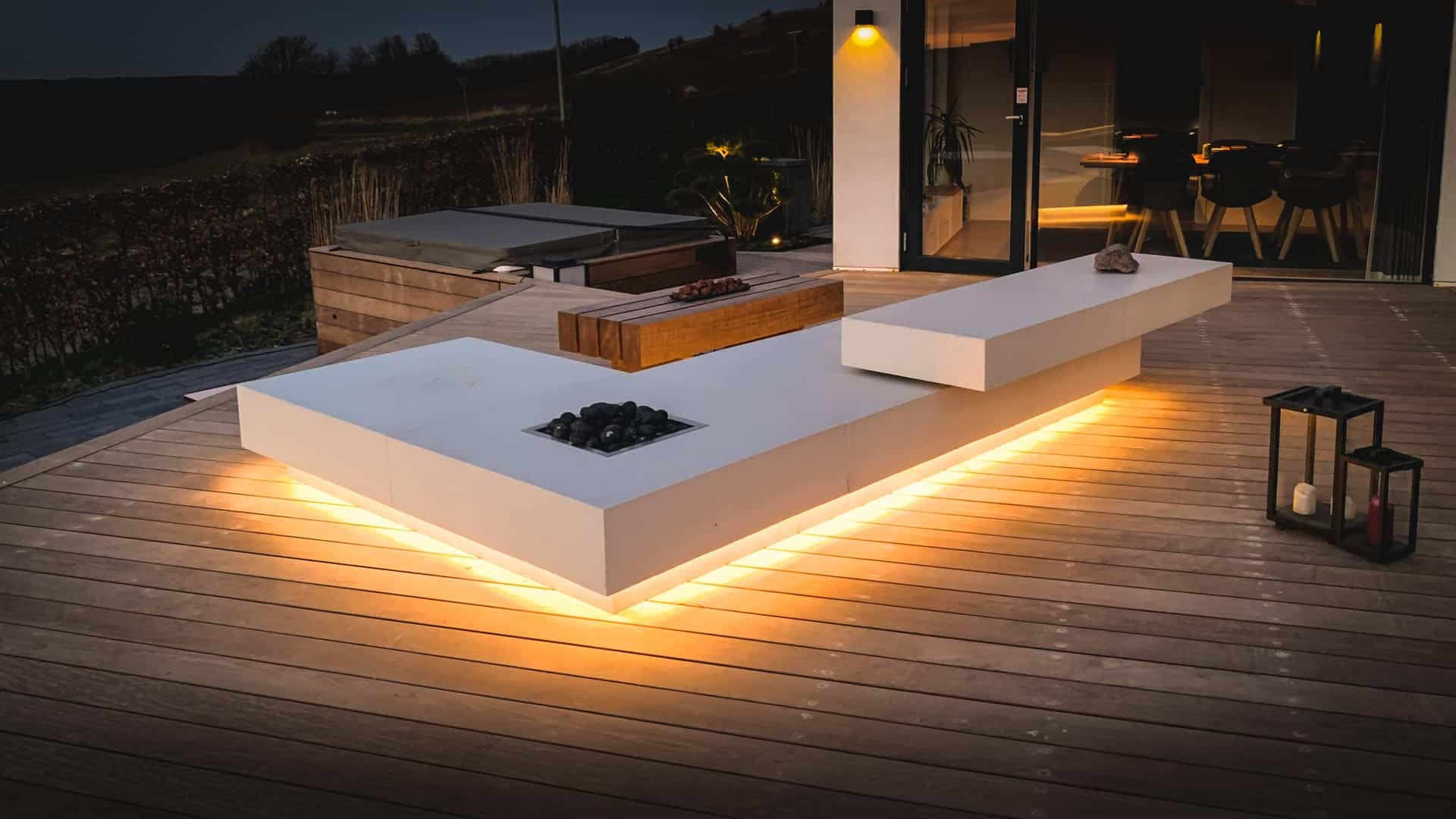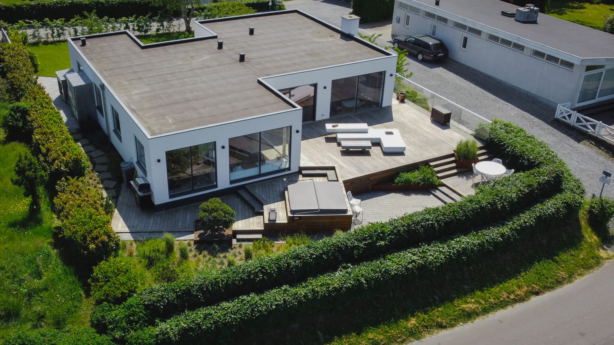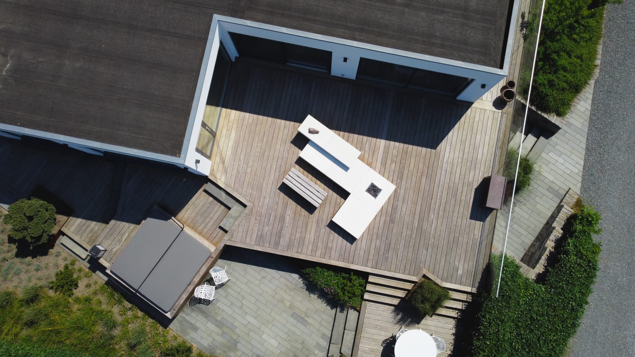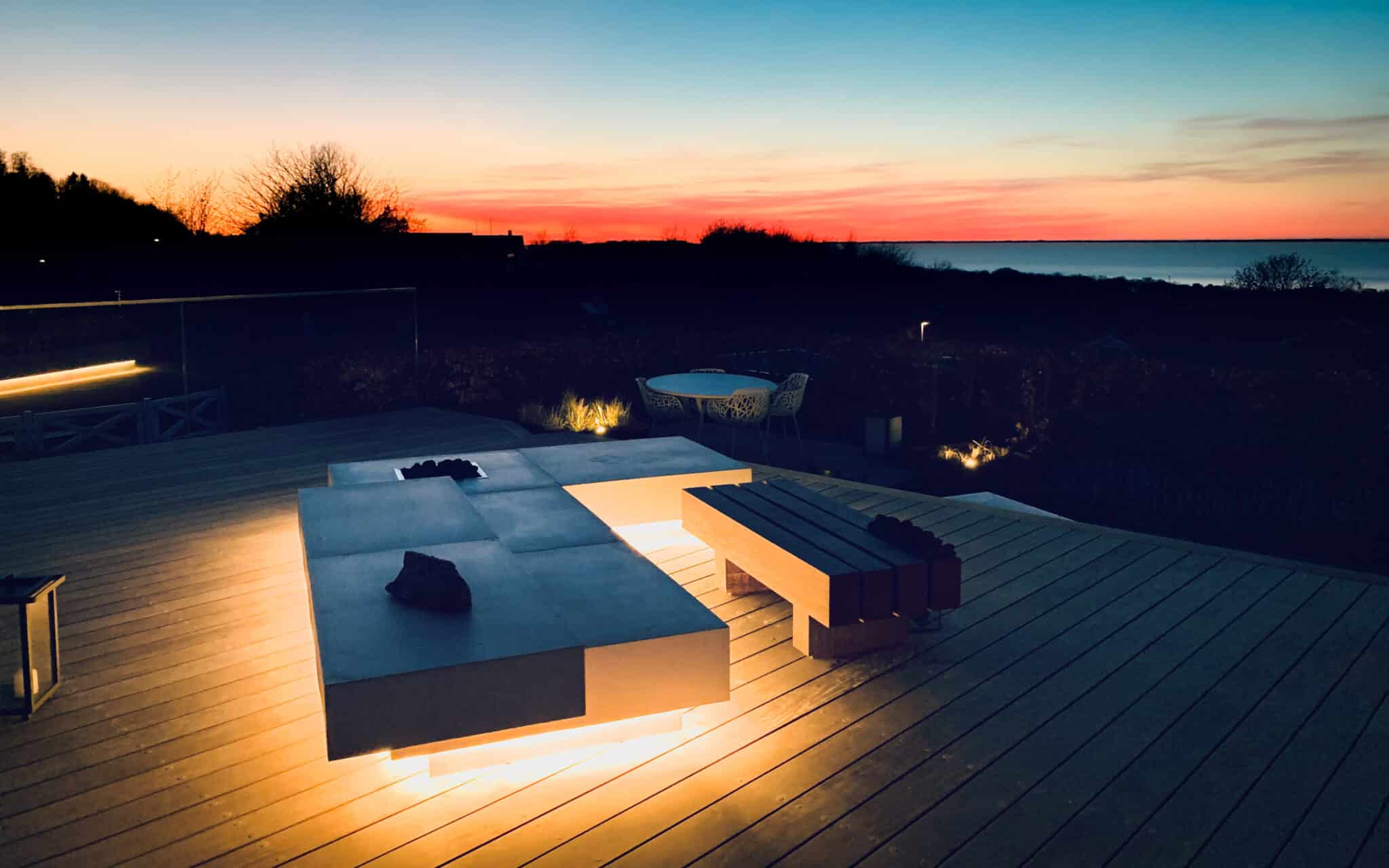 Langs huset og mod havesiden er der etableret træterrasser, som skaber varme og kontrast til de mørke stenmaterialer. Hegn og afskærmning giver privatliv og definerer havens rum.